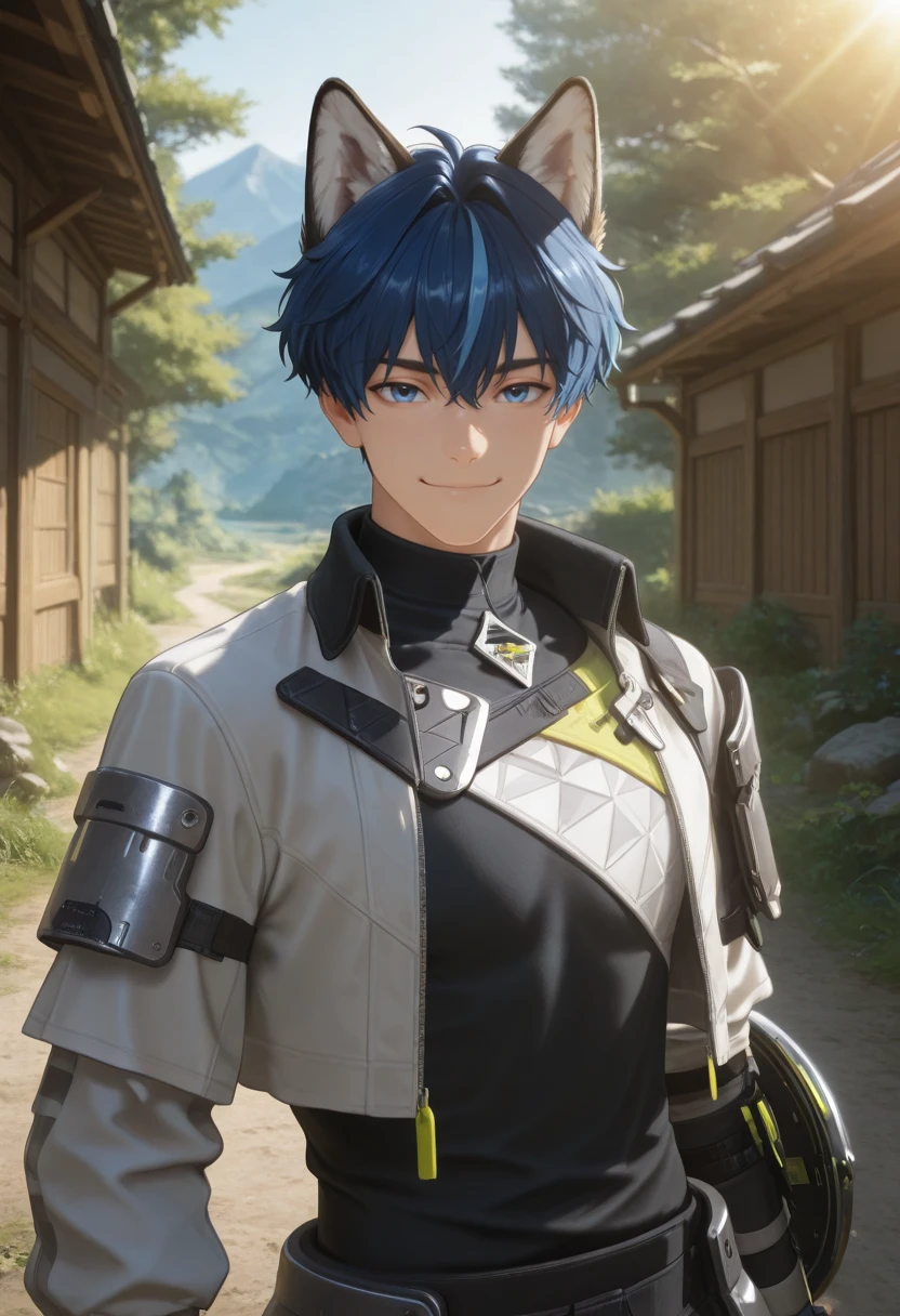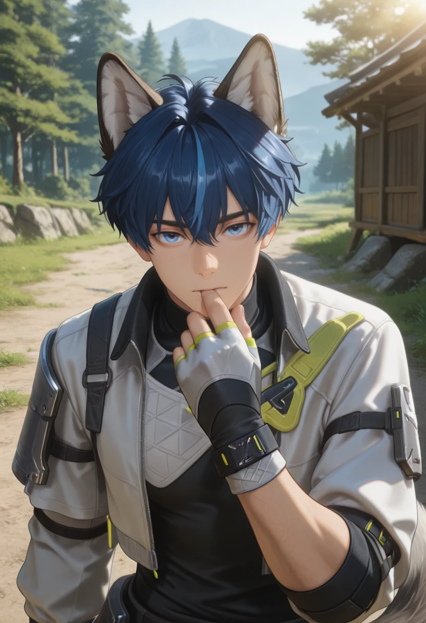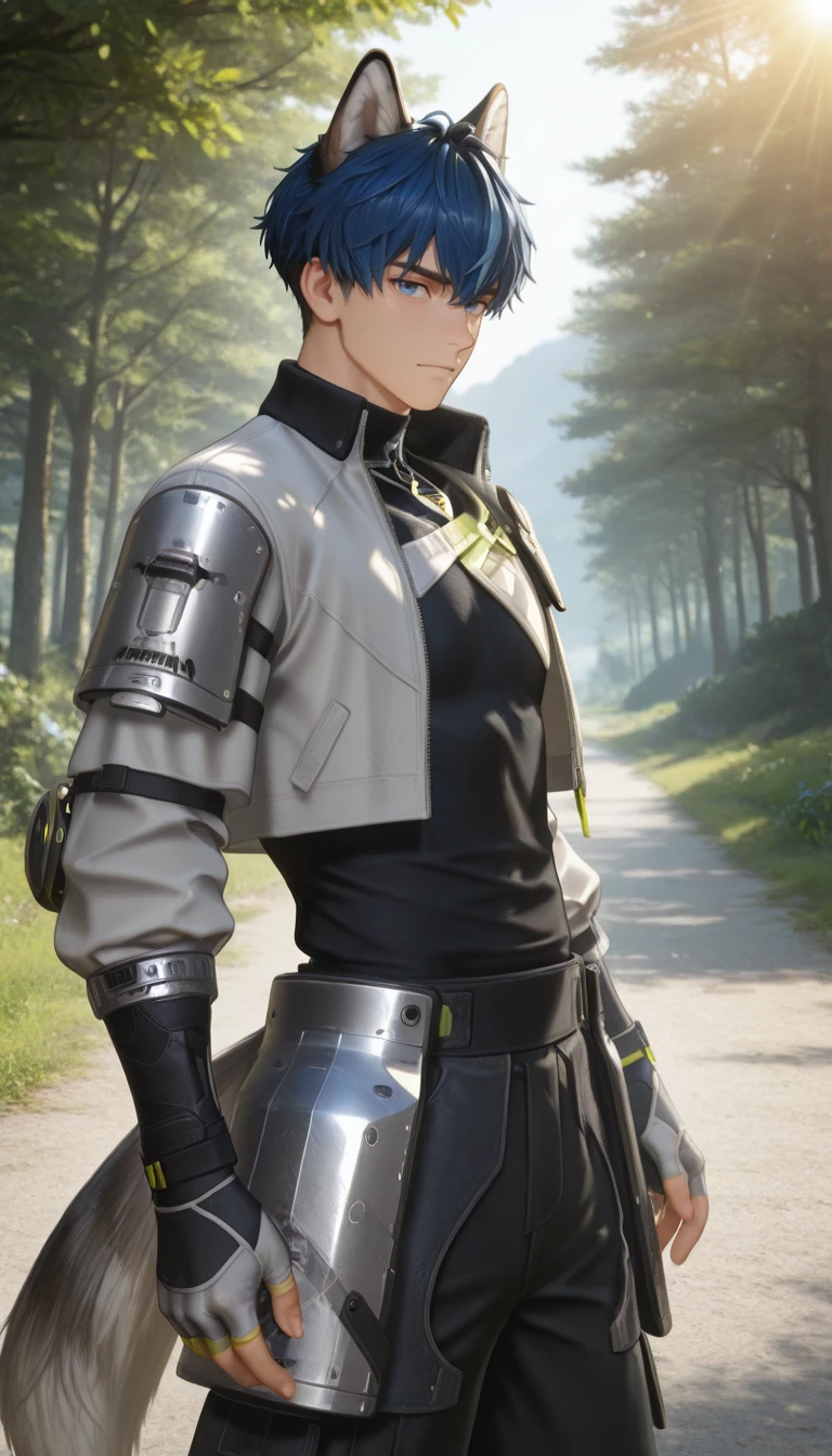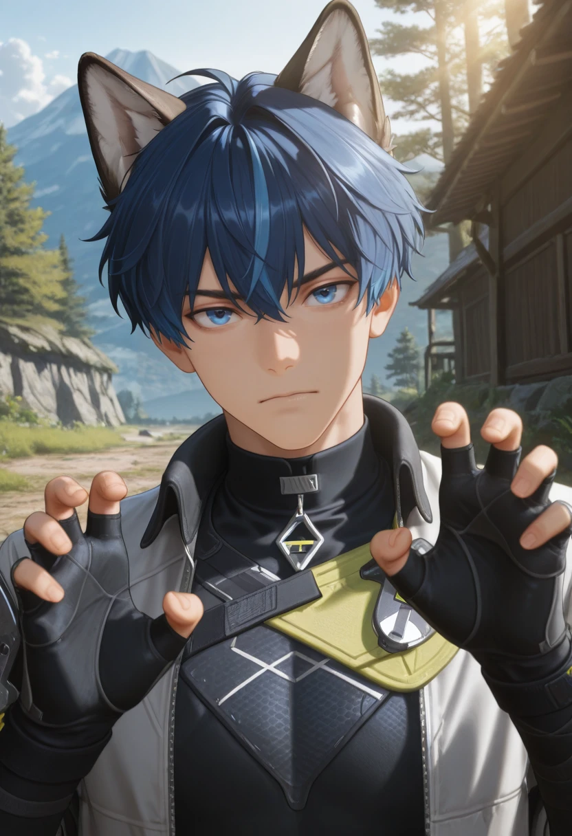 catcher,animal ears,blue hair,multicolored hair,short hair,blue eyes,fingerless gloves,white footwear,jacket,armor,shield,tail,