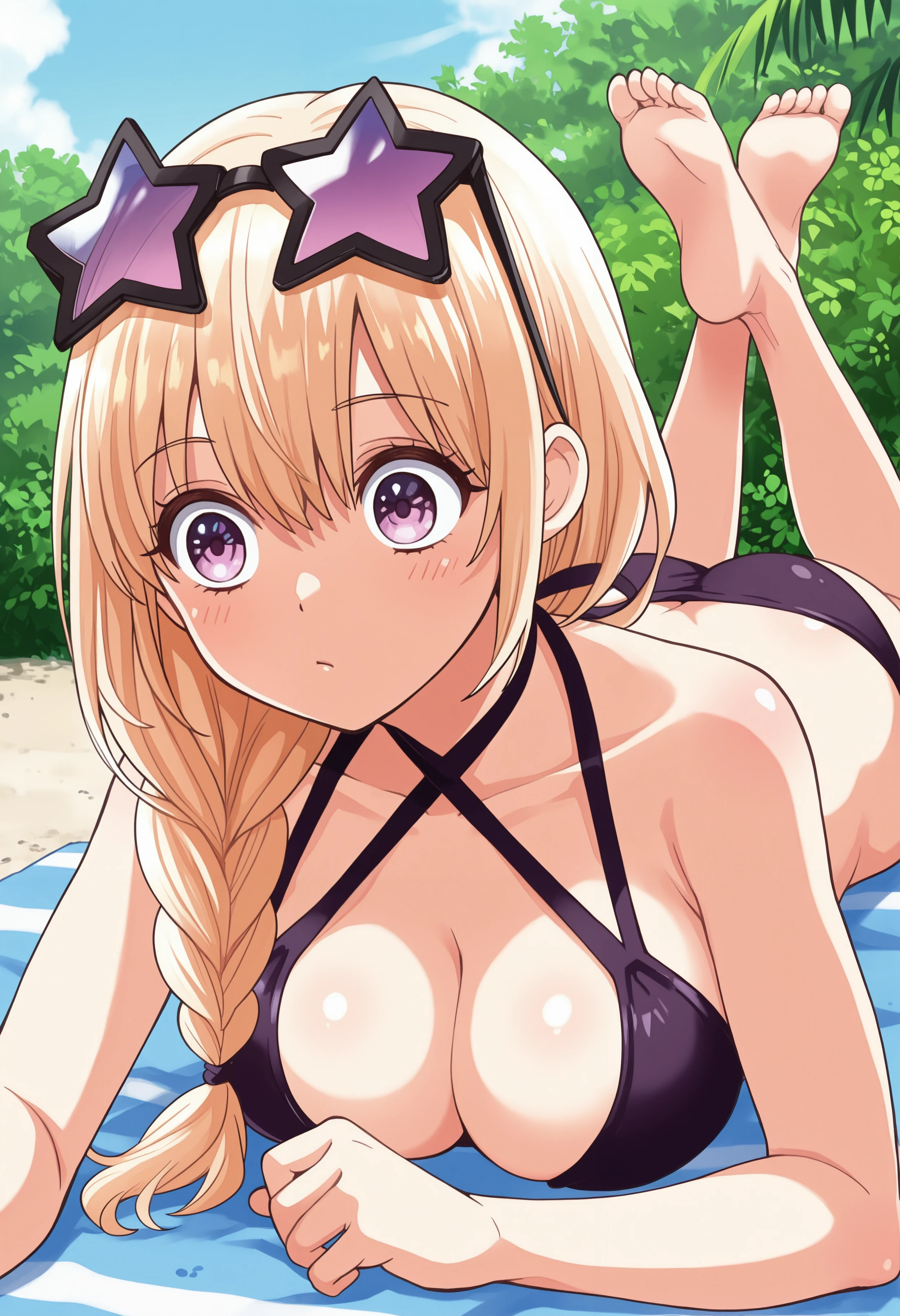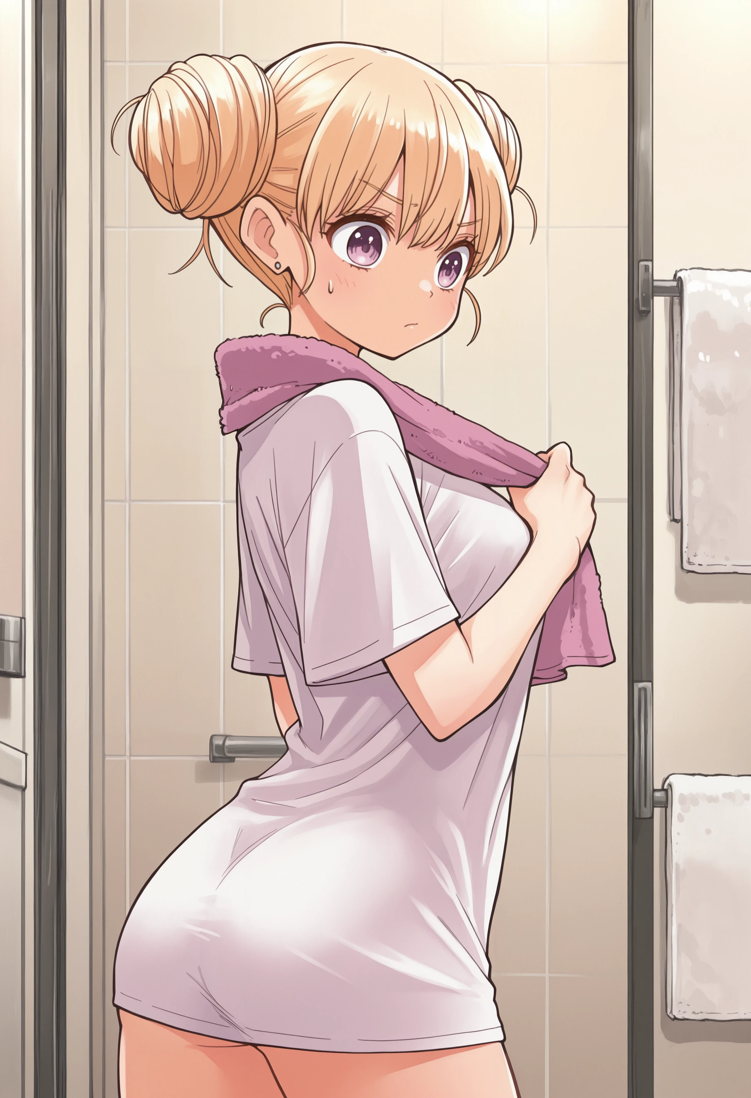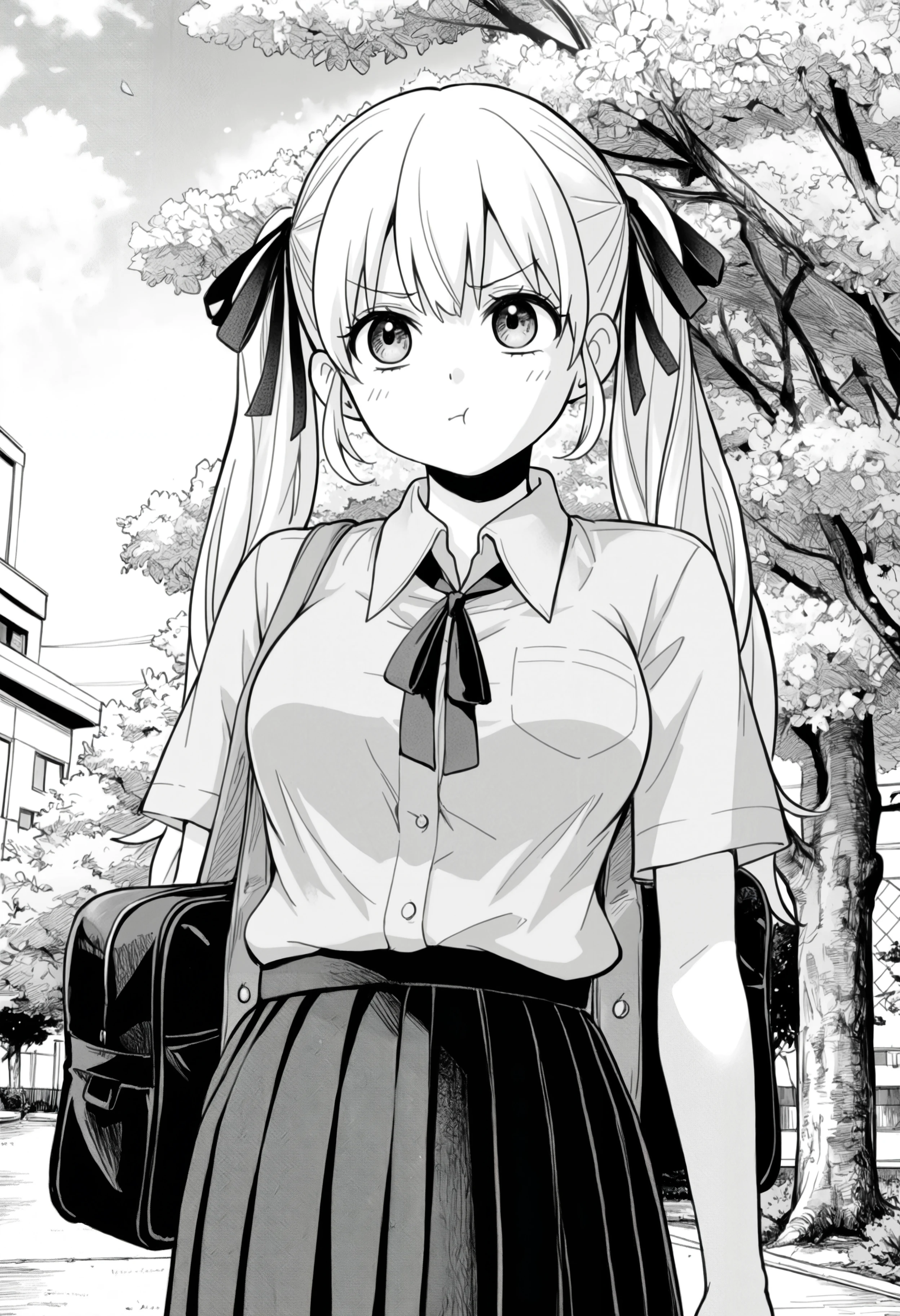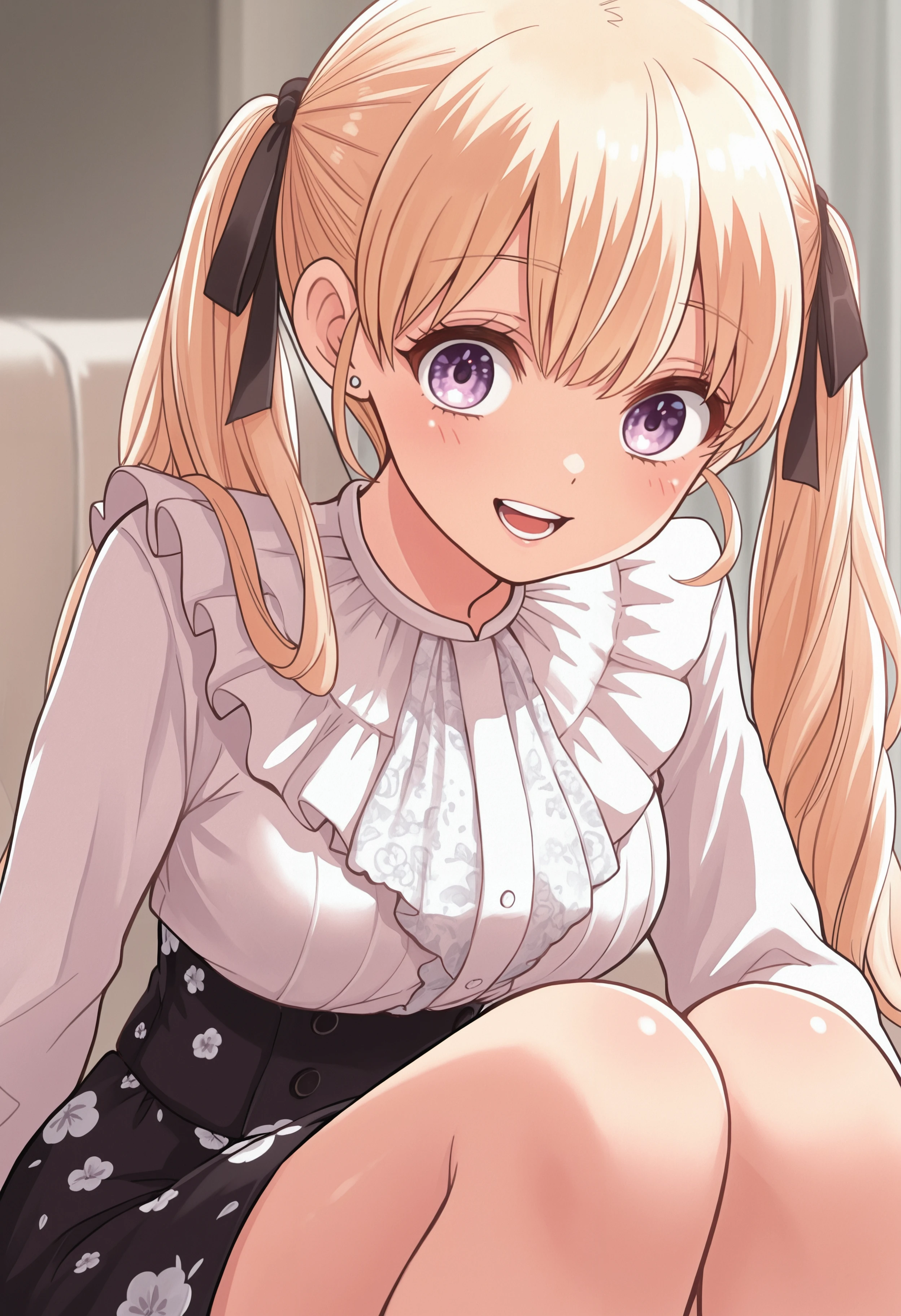 kakkoumanga_erika, purple eyes, (light blonde hair:0.8), twintails, hair ribbon,