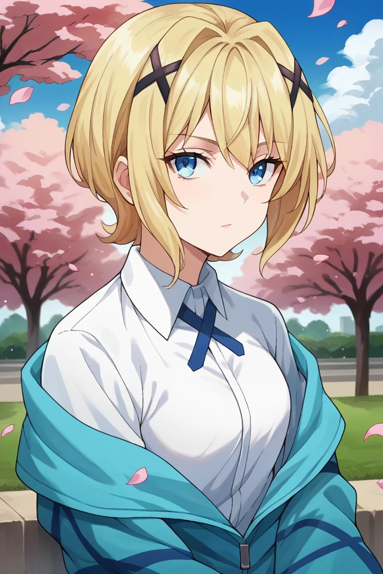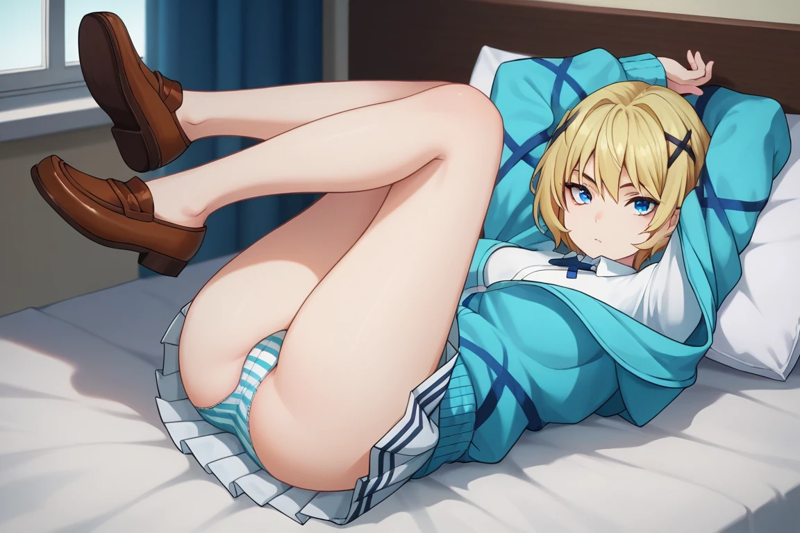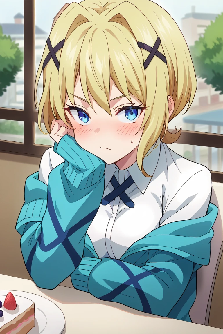 blonde hair, short hair, bangs, x hair ornament, eyebrows, blue eyes,
