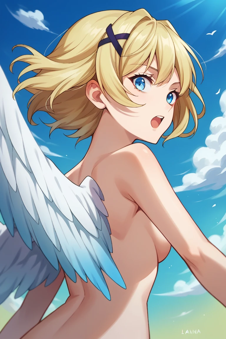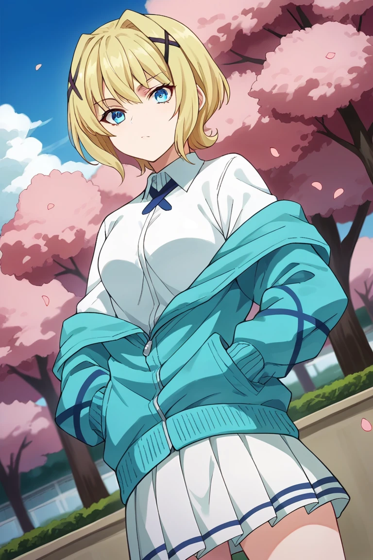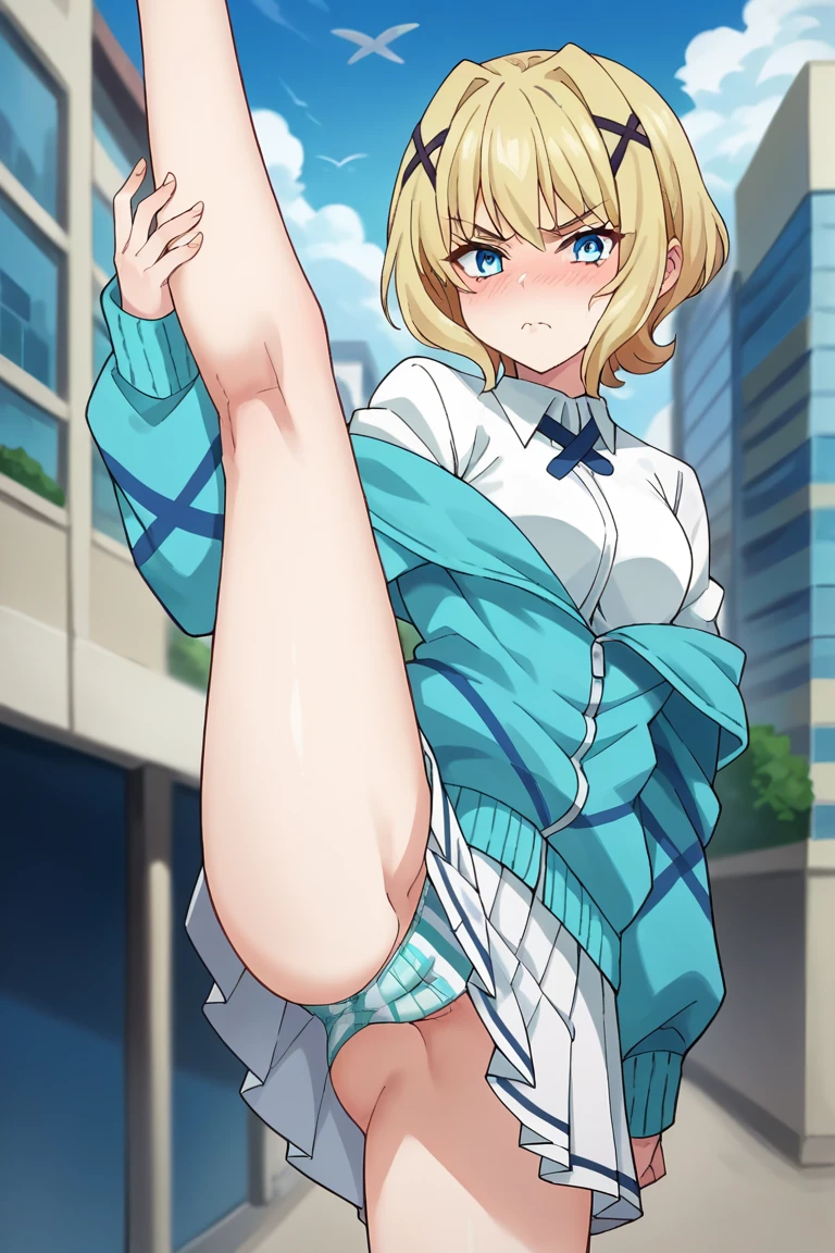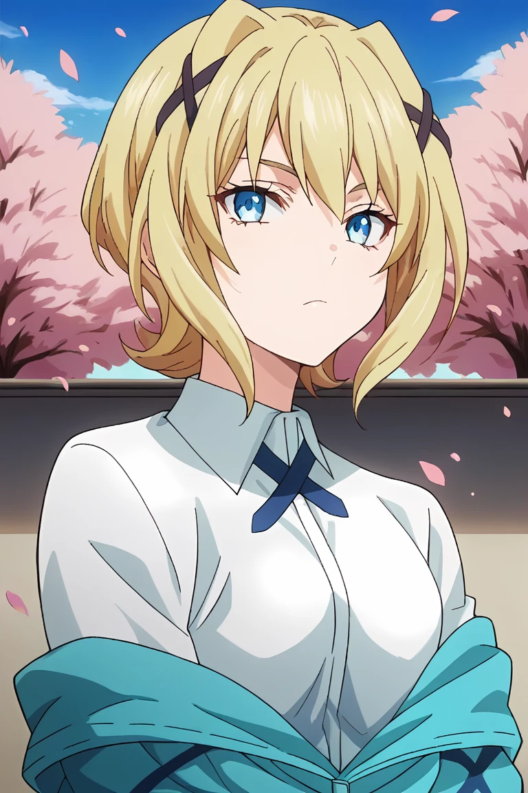 blonde hair, short hair, bangs, x hair ornament, eyebrows, blue eyes,