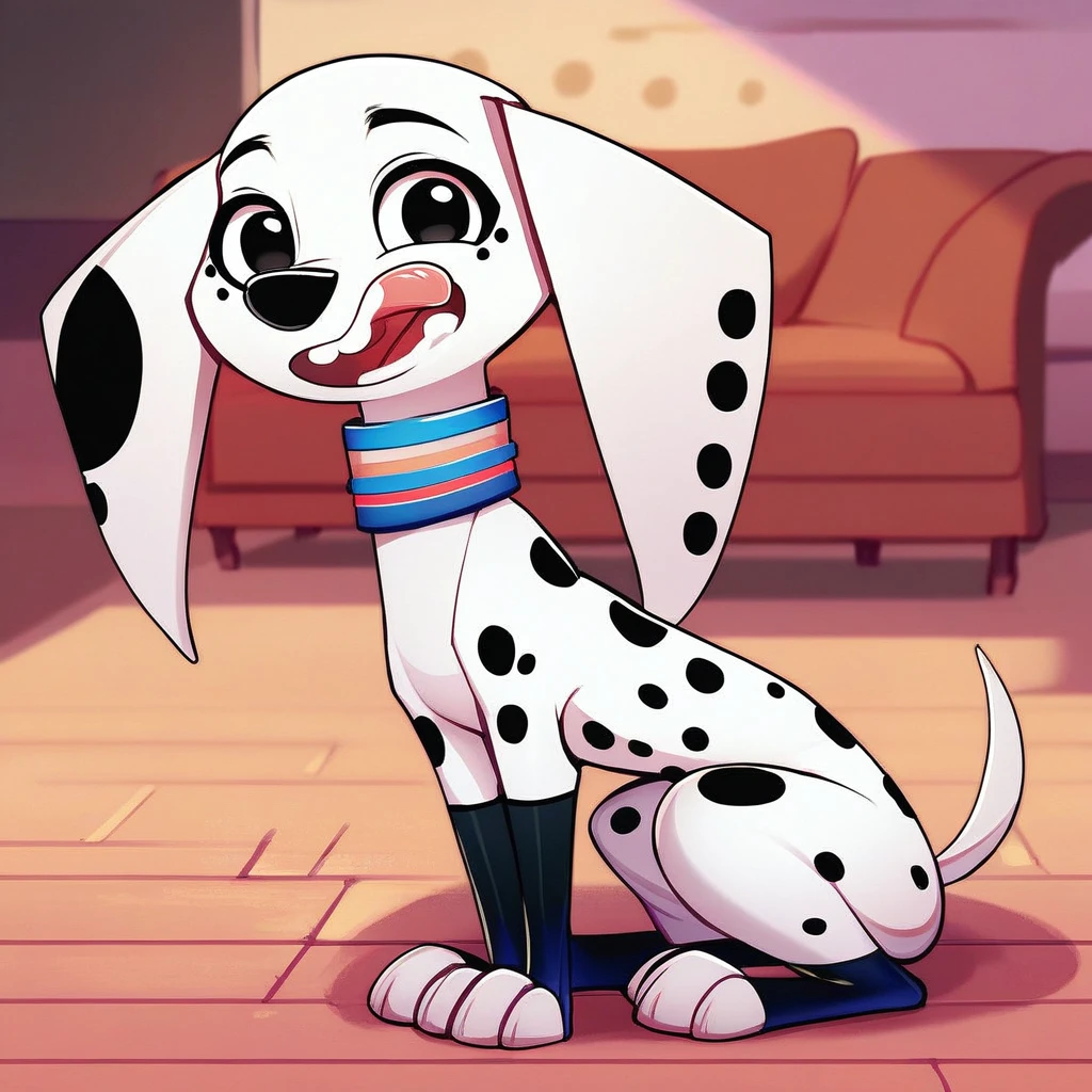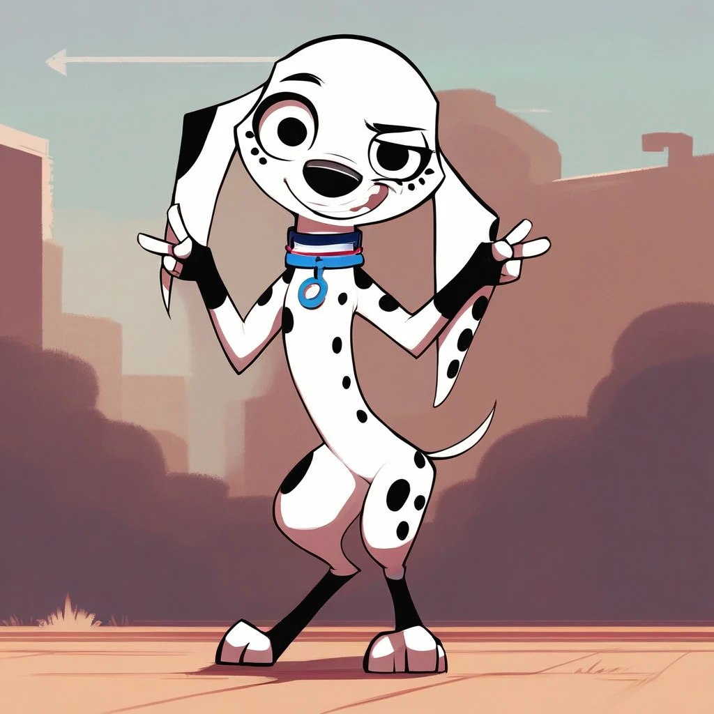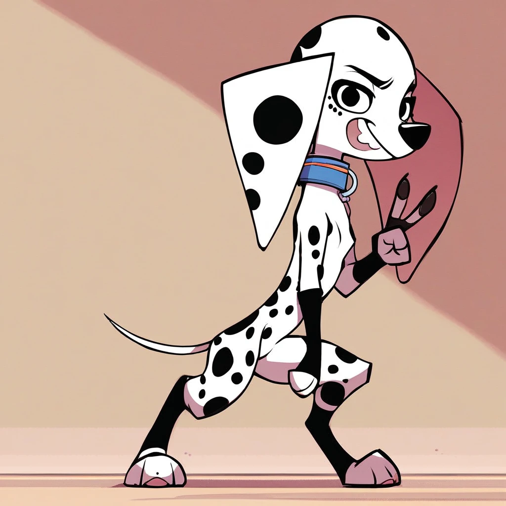 Dog, dog girl, dalmatian, white and black fur, black spots, long ears, dog ears, black eyes,