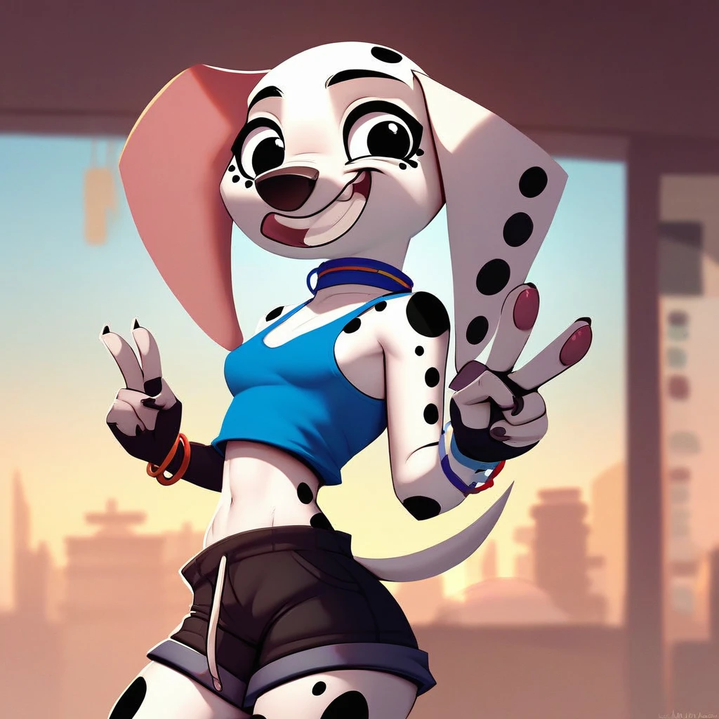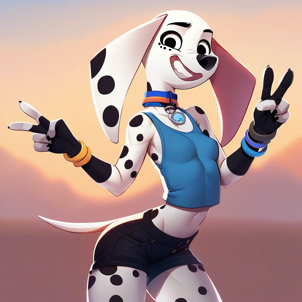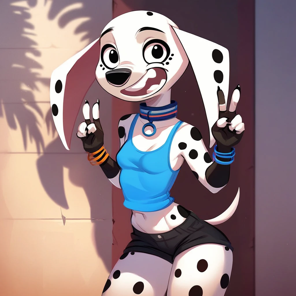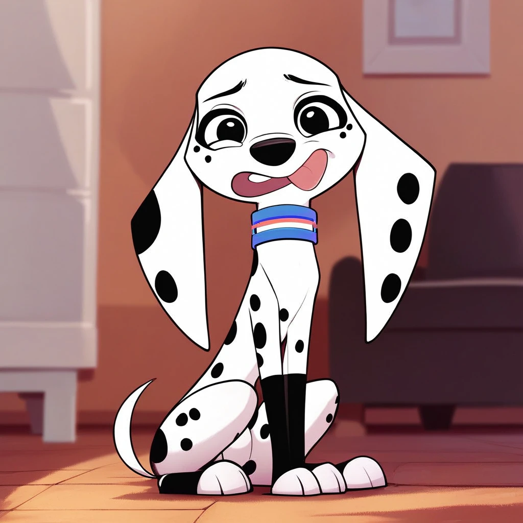 Dog, dog girl, dalmatian, white and black fur, black spots, long ears, dog ears, black eyes,