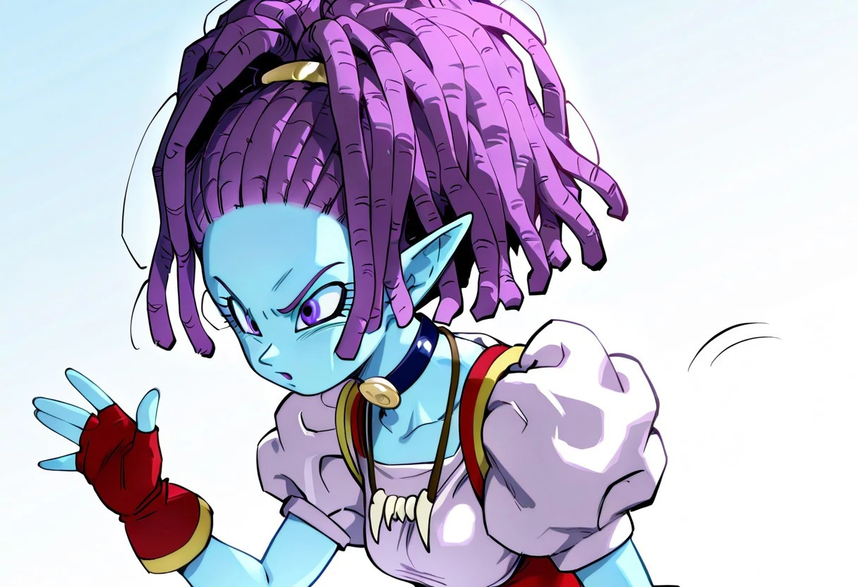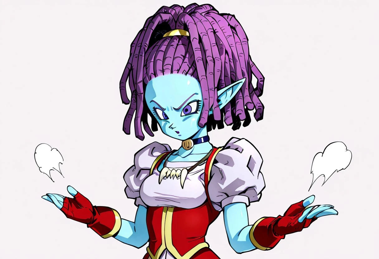 maki (dragon ball), 1girl, solo, female focus, pointy ears, blue skin, colored skin, purple hair, dreadlocks, choker, necklace, fingerless gloves, puffy sleeves