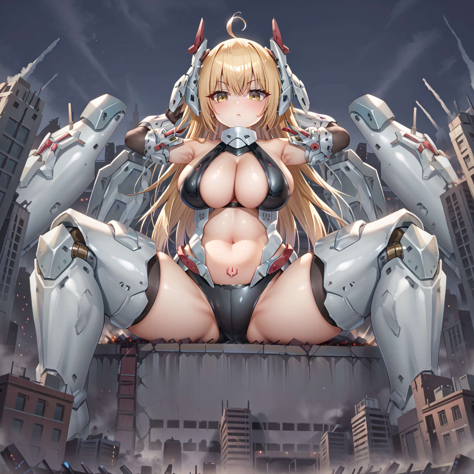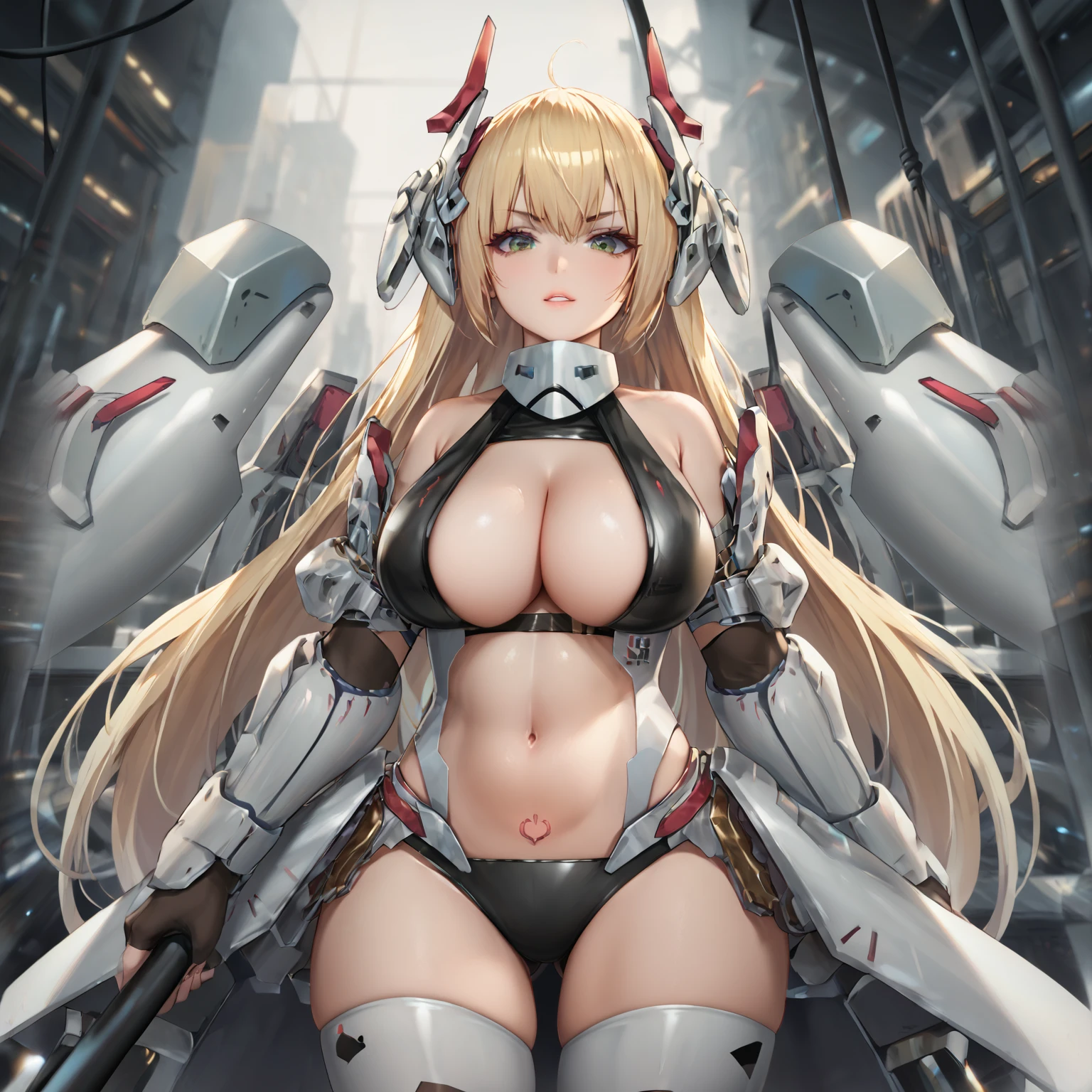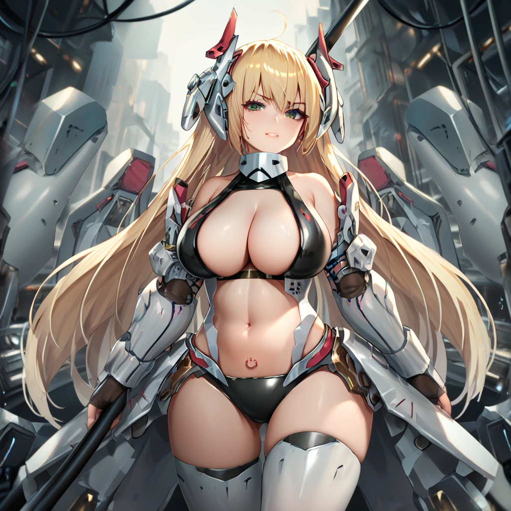 charlissa, mecha musume, armored wings, computer power icon pubic tattoo, computer power icon, long hair, breasts, bangs, blonde hair, large breasts, thighhighs, gloves, navel, cleavage, bare shoulders,yellow eyes, weapon, ahoge, armored elbow gloves, armpits, stomach, skindentation, headgear, armored thigh boots, revealing clothes,