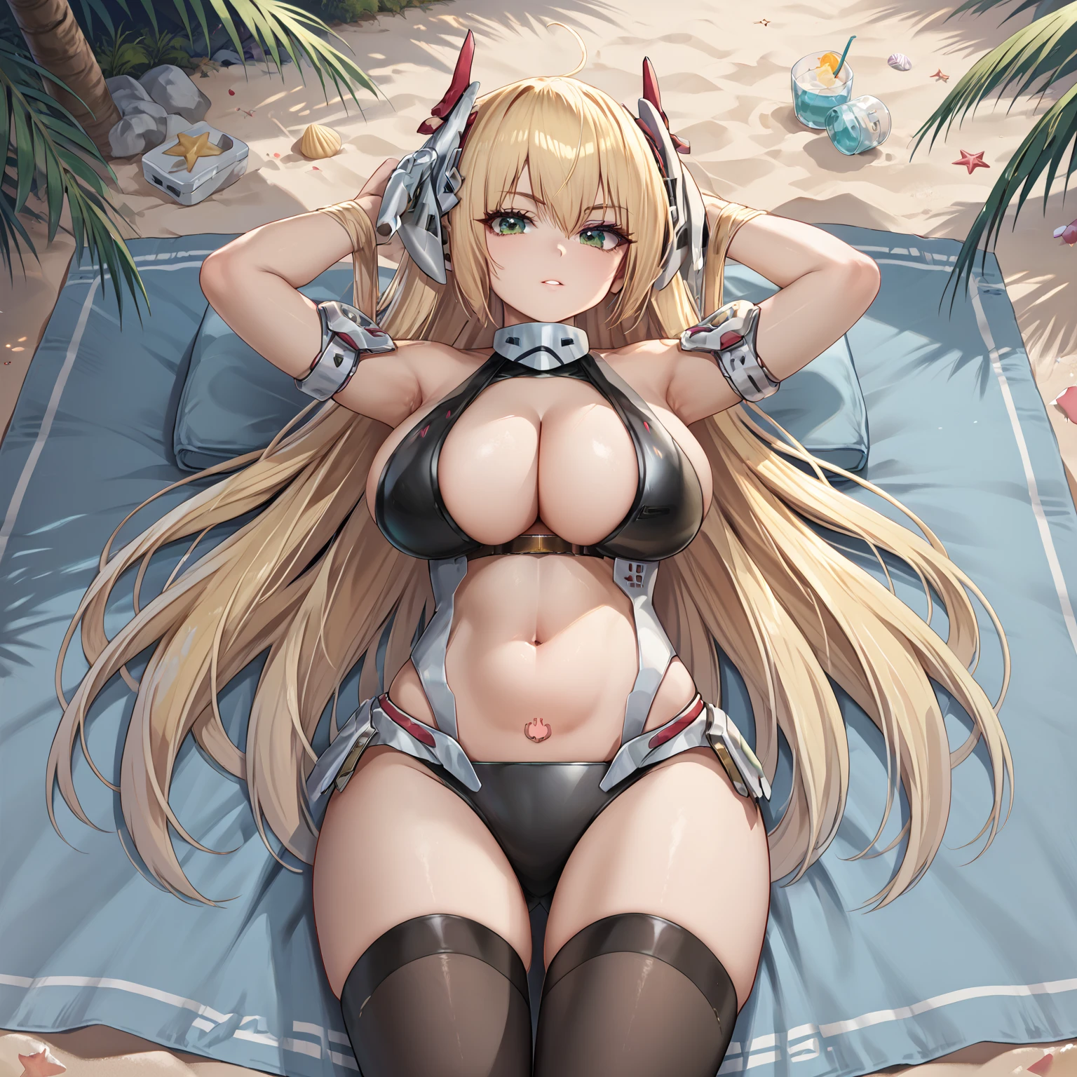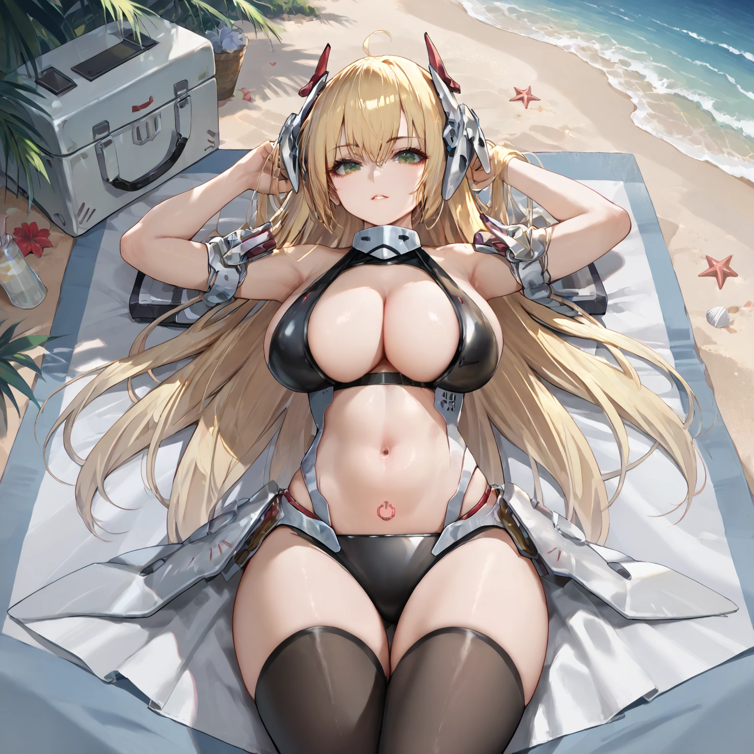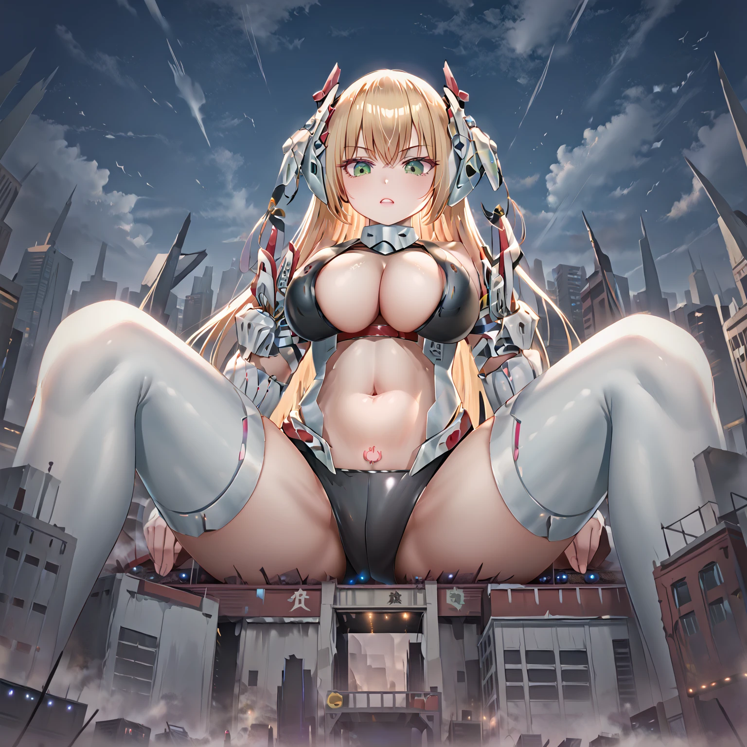 charlissa, mecha musume, armored wings, computer power icon pubic tattoo, computer power icon, long hair, breasts, bangs, blonde hair, large breasts, thighhighs, gloves, navel, cleavage, bare shoulders,yellow eyes, weapon, ahoge, armored elbow gloves, armpits, stomach, skindentation, headgear, armored thigh boots, revealing clothes,