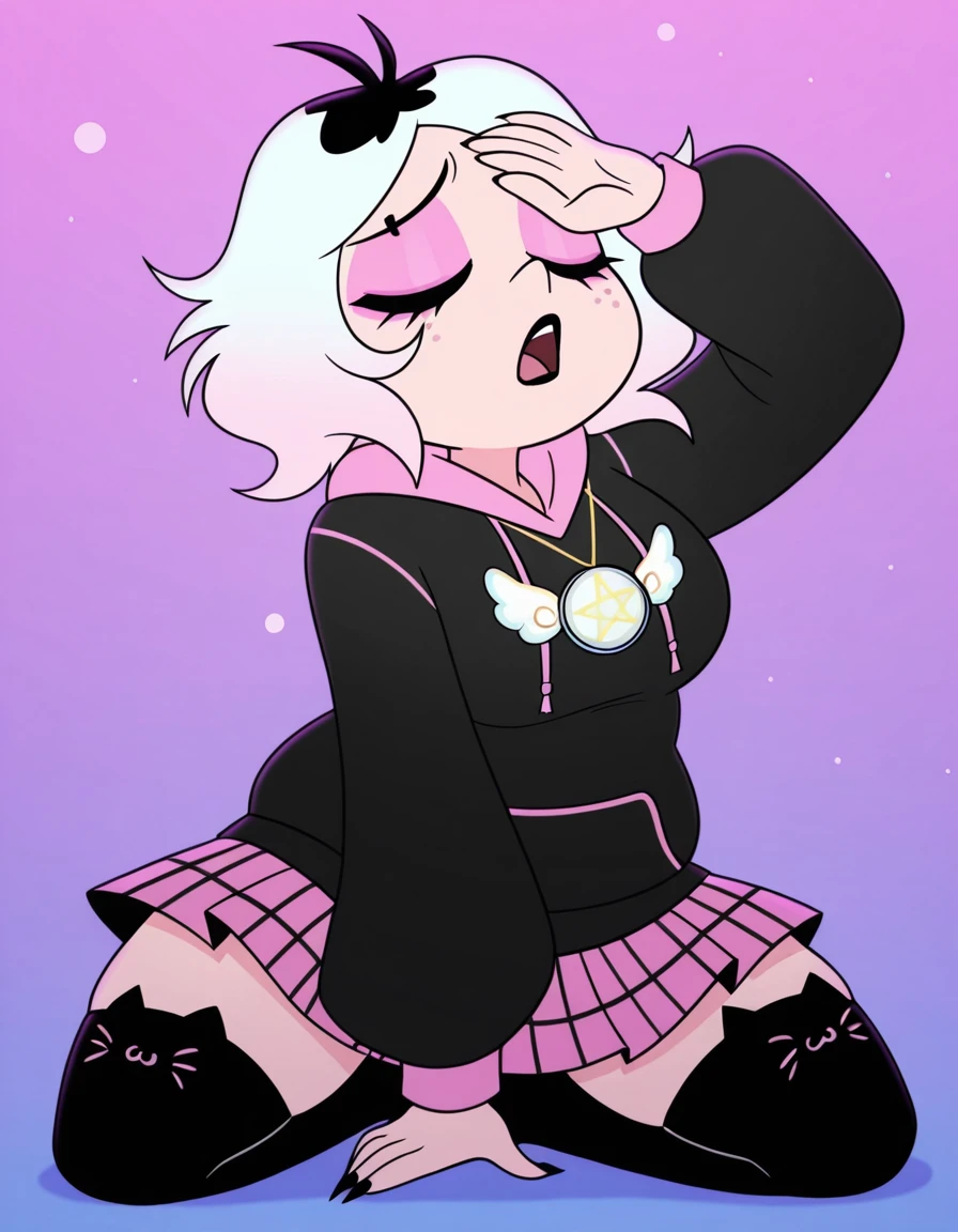• emberlynnpnk, multicolored hair, white hair, pastel hair, plump, black eyebrow piercing, freckles, long eyelashes, eyeliner, pink eyeshadow, black lips, black nails, black hoodie, lowered pink hood, winged necklace, pink and black plaid skirt, black knee socks, cat knee socks