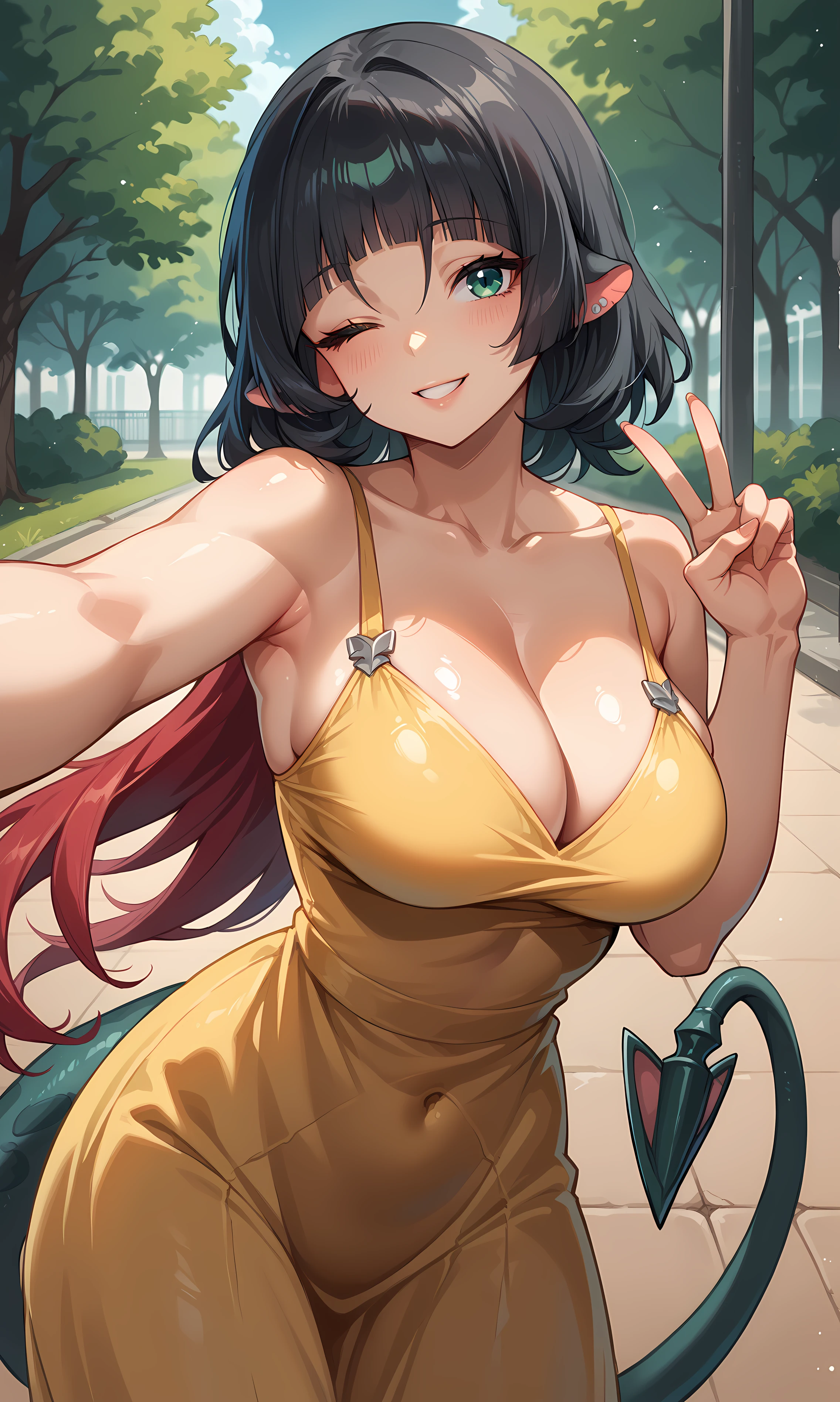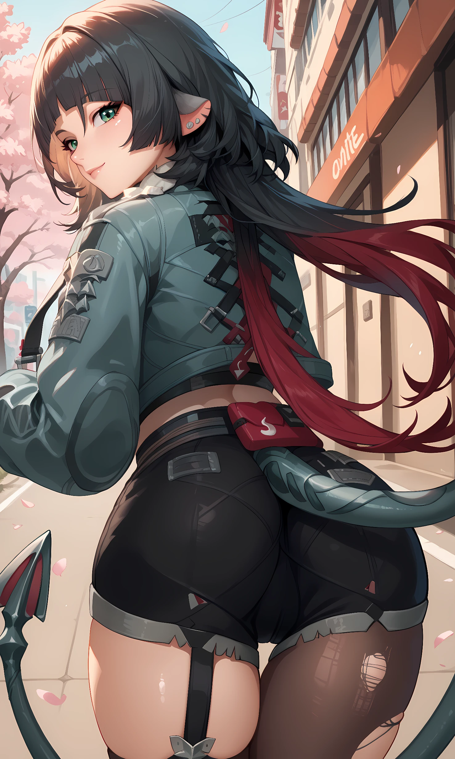 jane_doe, green eyes, black hair, blunt bangs, red hair, long hair, tail