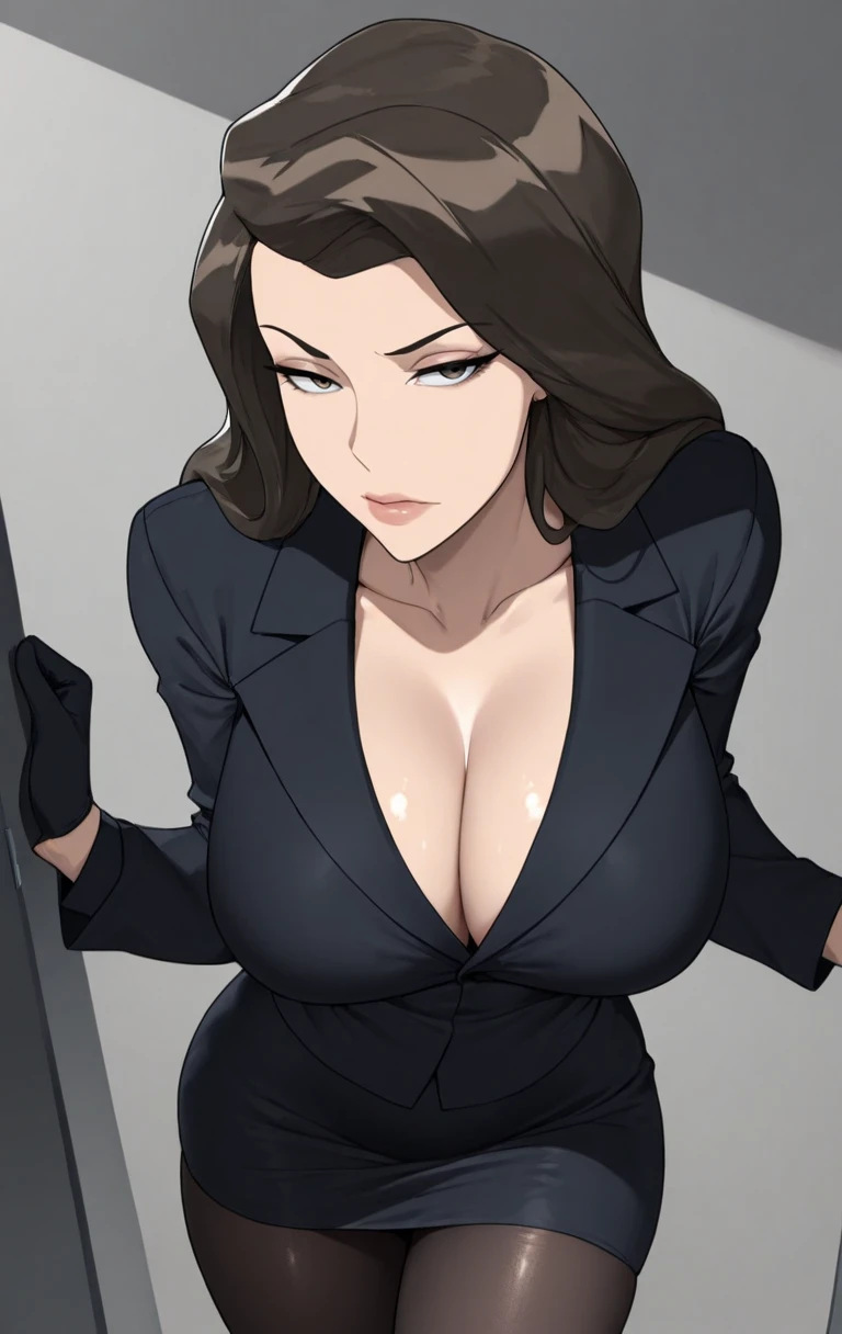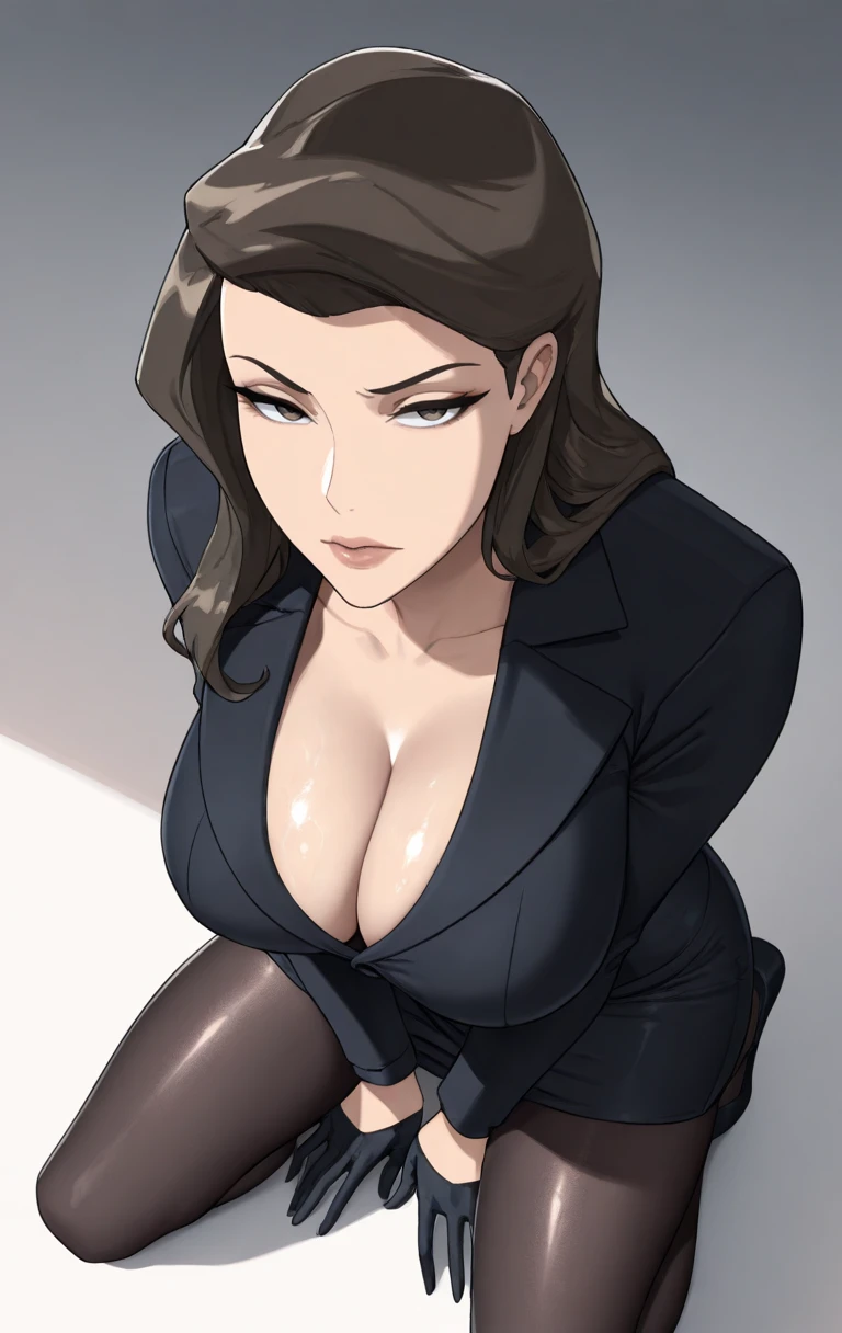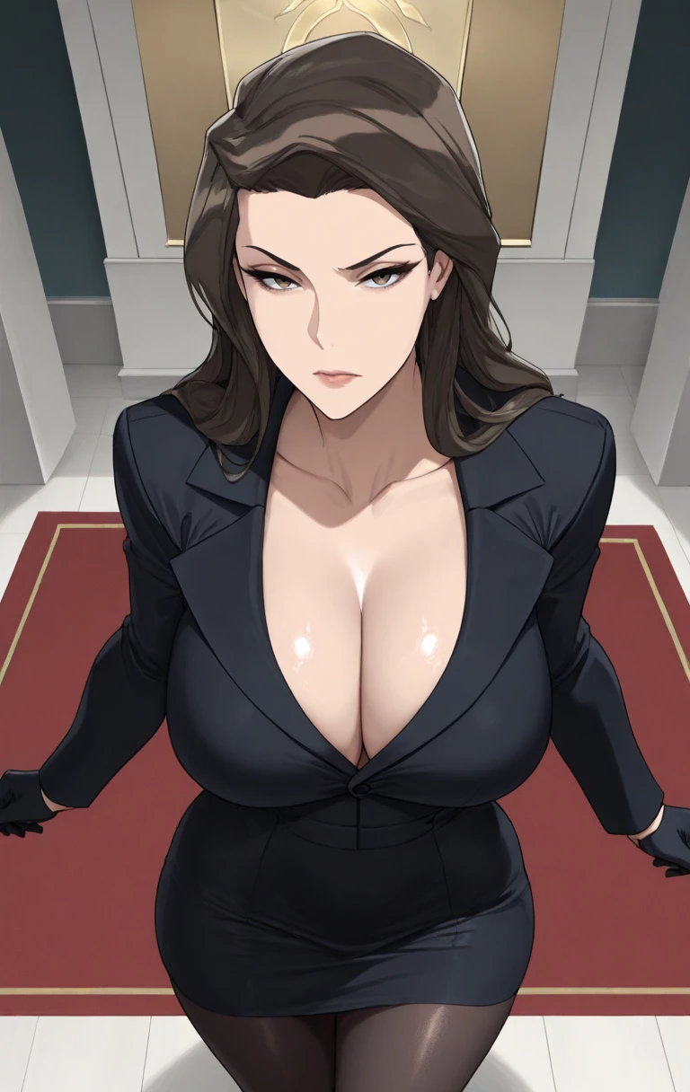 gr4v3s, 1girl, solo, long hair, looking at viewer, brown hair, long sleeves, dress, black dress, coat, black gloves, pencil skirt, suit, black pantyhose, black coat