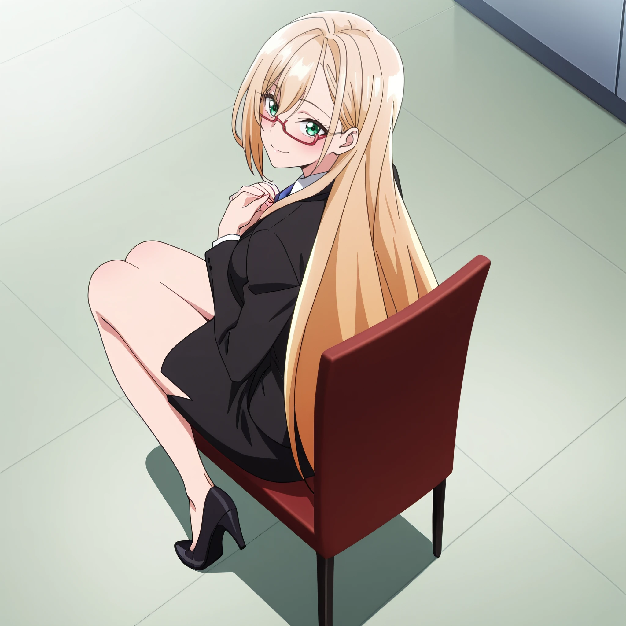 PrimulaFormal, skirt, glasses, pencil skirt, formal, miniskirt, suit, jacket, long sleeves, office lady, skirt suit, high heels, white shirt, black skirt, semi-rimless eyewear, necktie, black jacket,