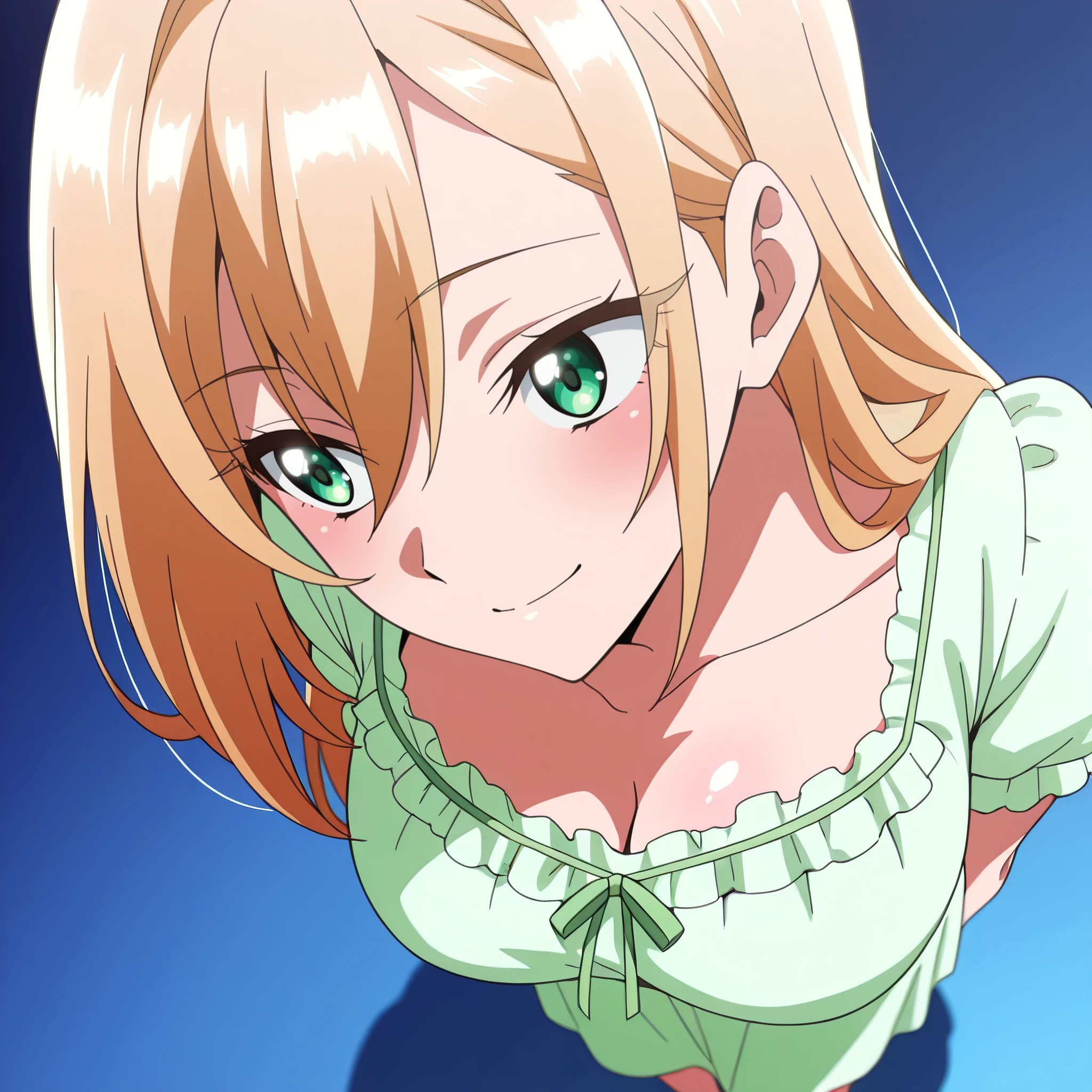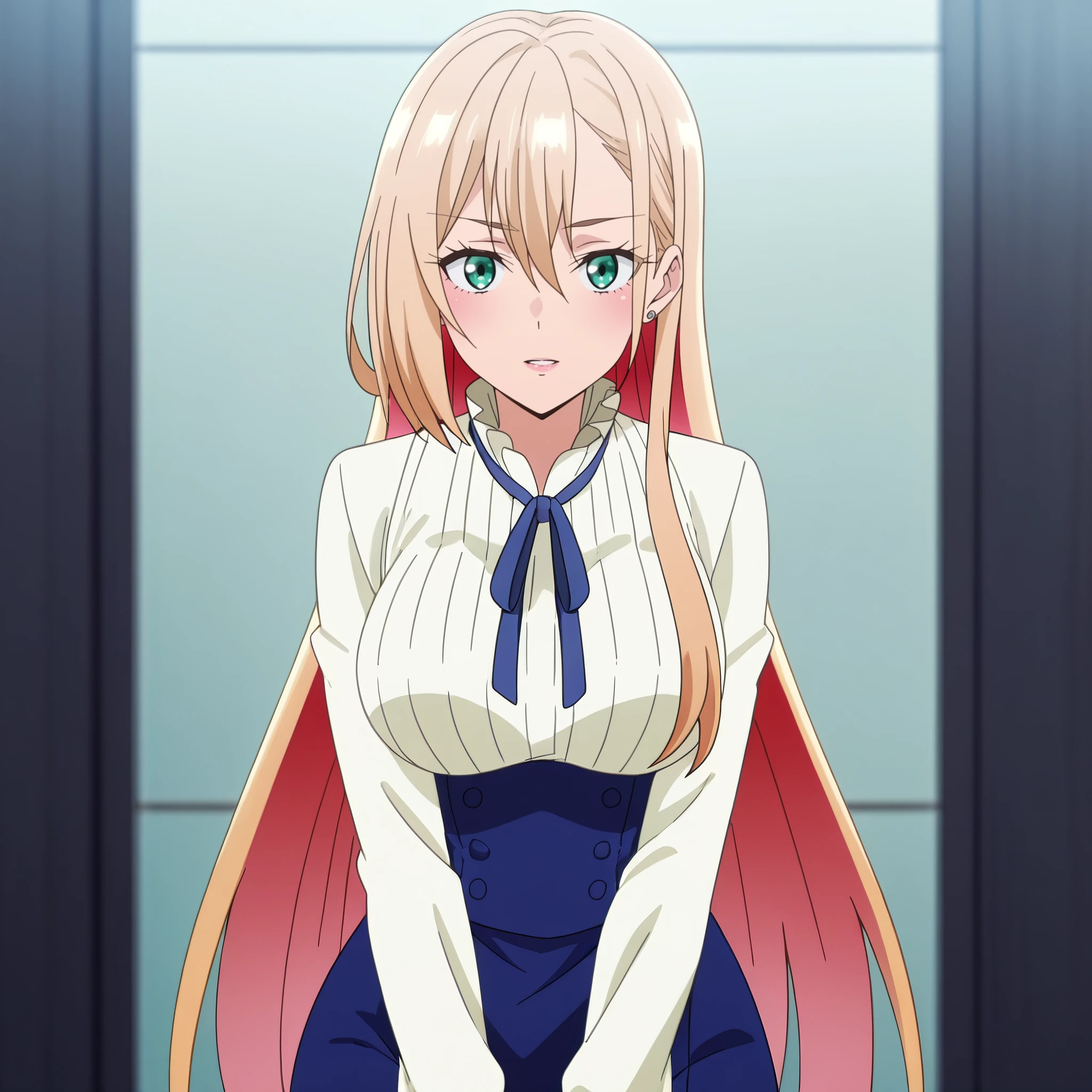 A4OPrimula, blonde hair, long hair, bangs, green eyes, hair between eyes, eyebrows visible through hair,