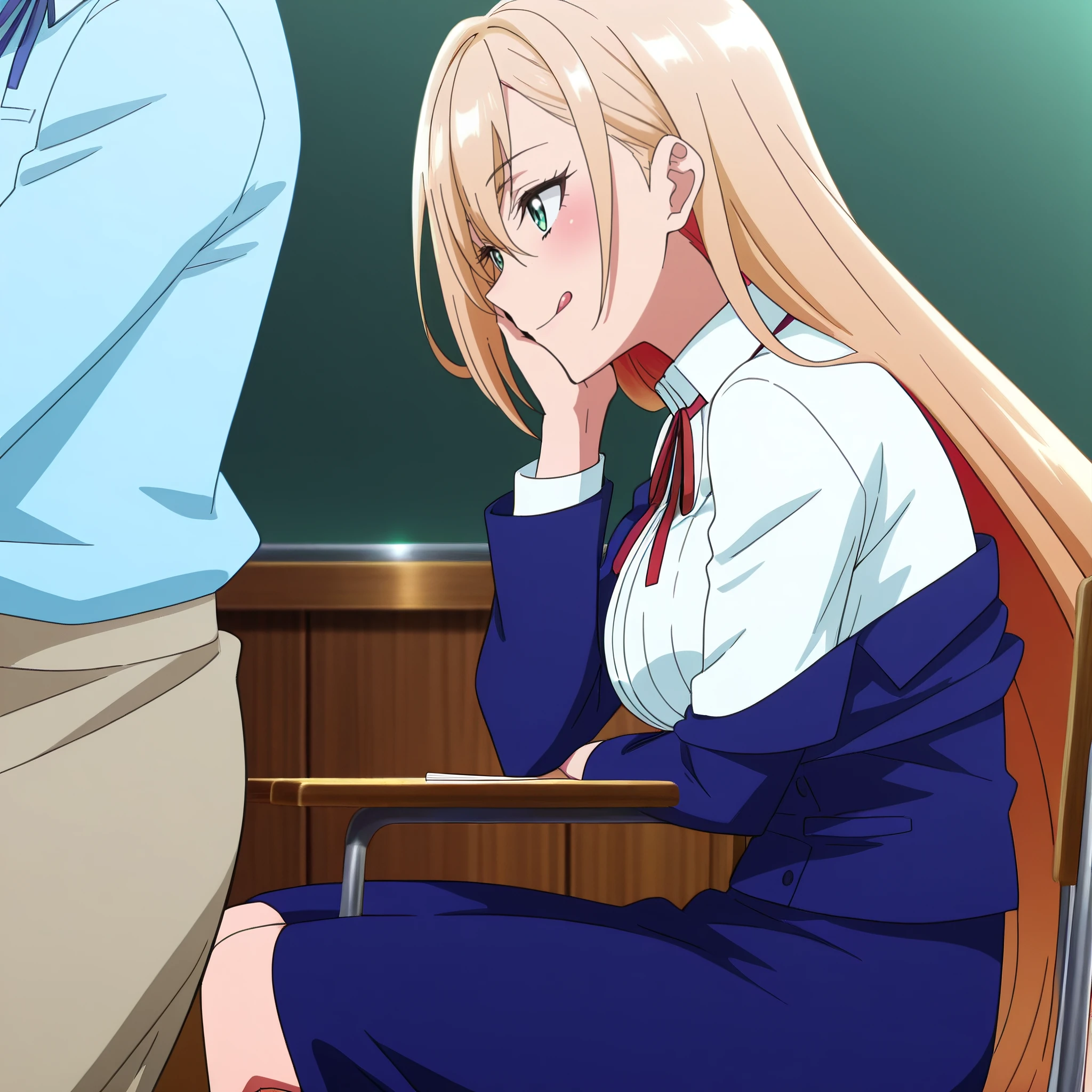 PrimulaBlueShirt, ribbon, school uniform, red ribbon, neck ribbon, long sleeves, collared shirt, shirt, jacket, blue jacket, blue shirt, skirt, long skirt, brown skirt,