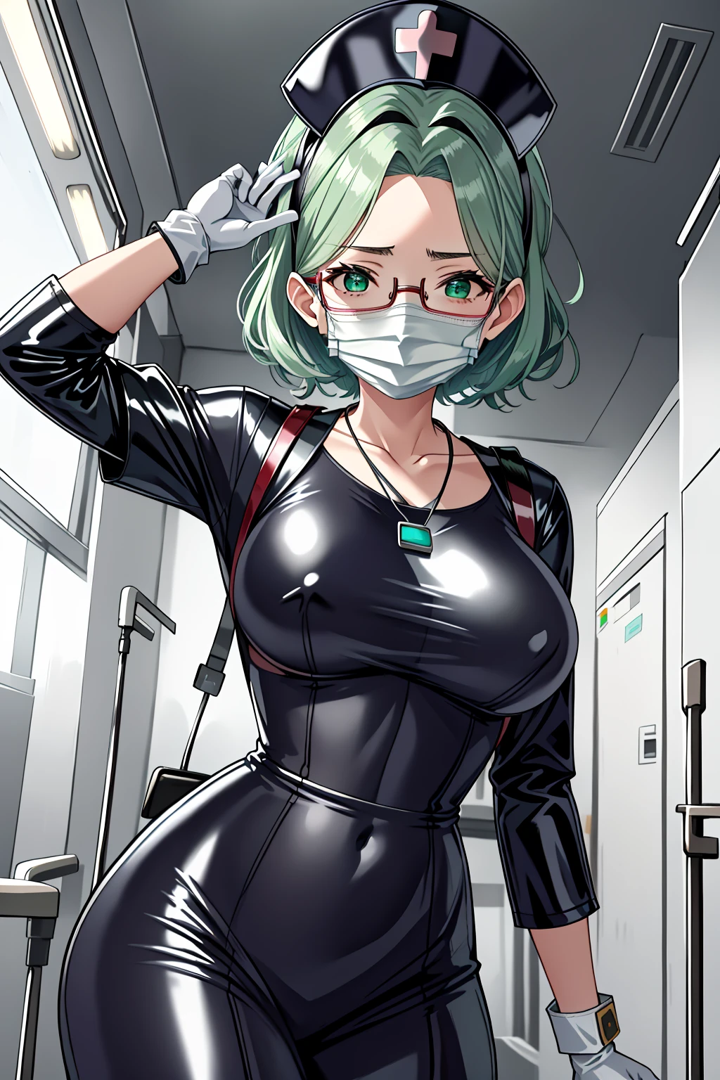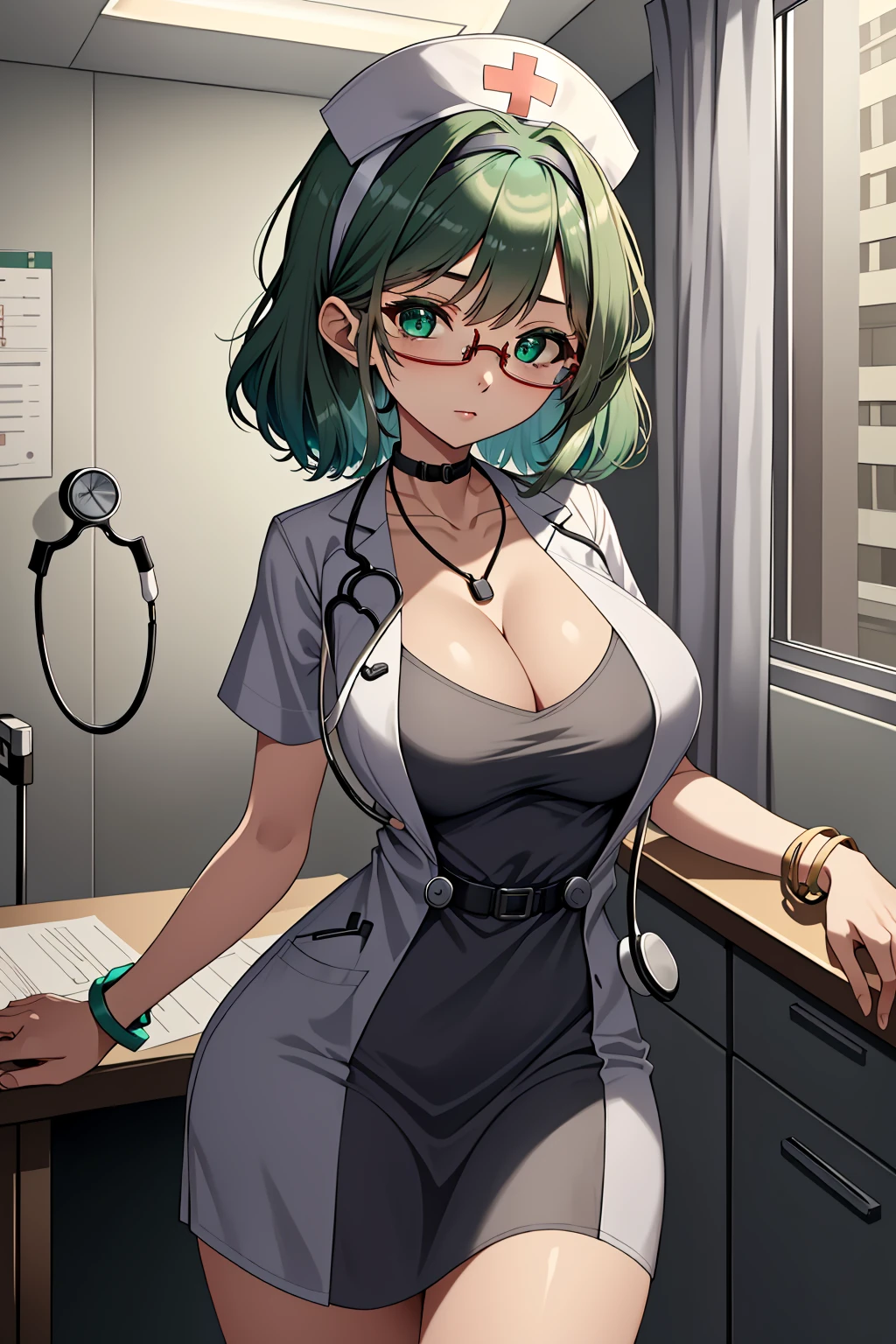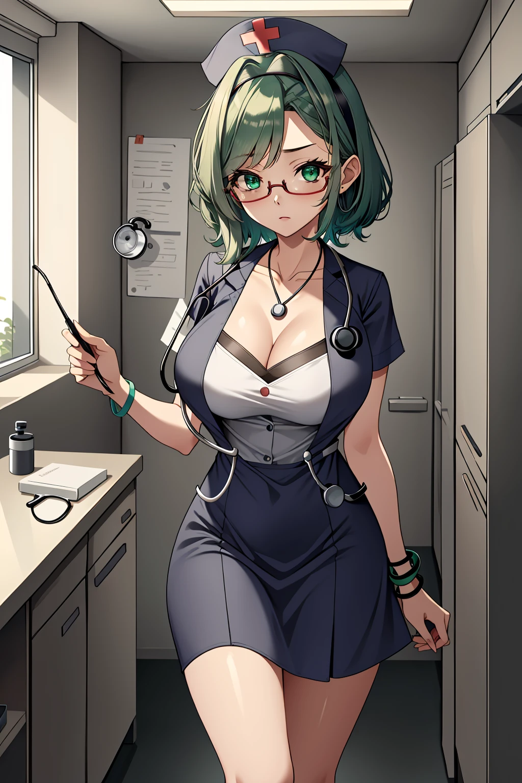 1girl, 3dcg 08, solo, tomomi kii, aqua hair, bangle, collarbone, glasses, green eyes, hairband, medium breasts, necklace, semi-rimless eyewear, short hair, sidelocks, under-rim eyewear