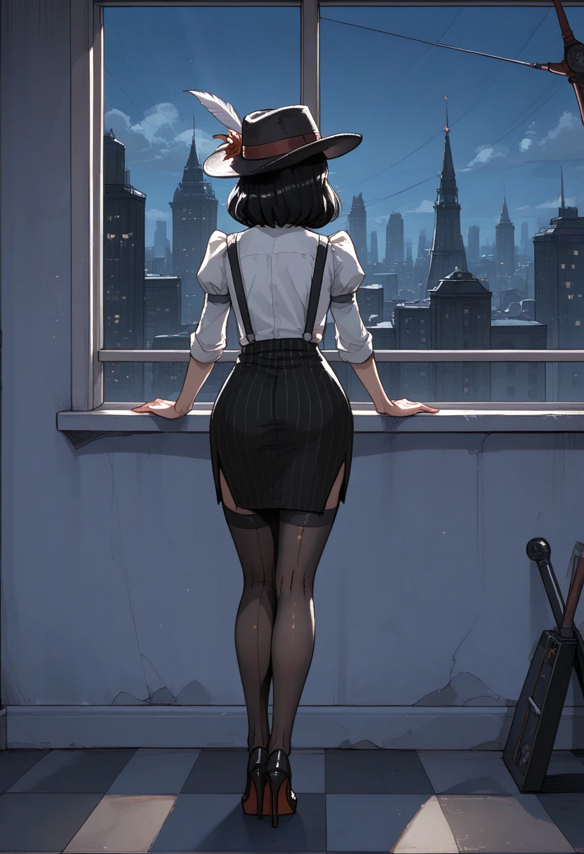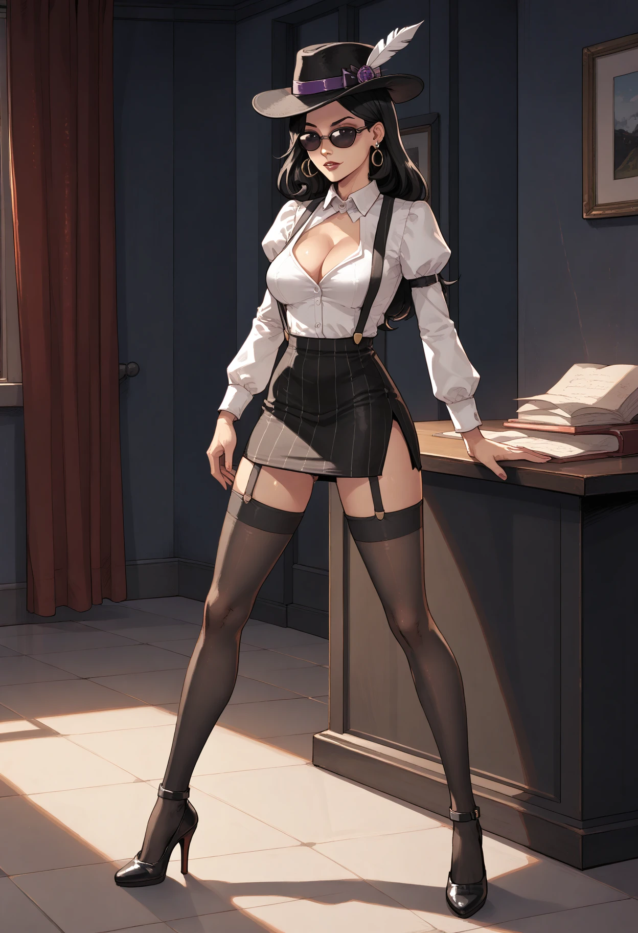 outfit1 tags: outfit1, suspenders, sunglasses, black headwear, hat, skirt, high heels, cleavage, earrings, pencil skirt, black footwear, pantyhose, shirt, striped, suspender skirt, hat feather, garter straps, thighhighs, black skirt, skirt, collared shirt