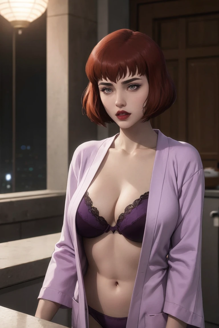 cleavage, underwear, open clothes, purple bra, bathrobe, open robe, purple robe,
