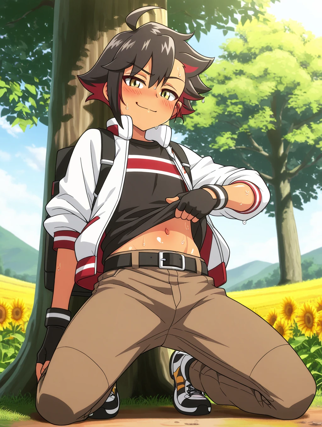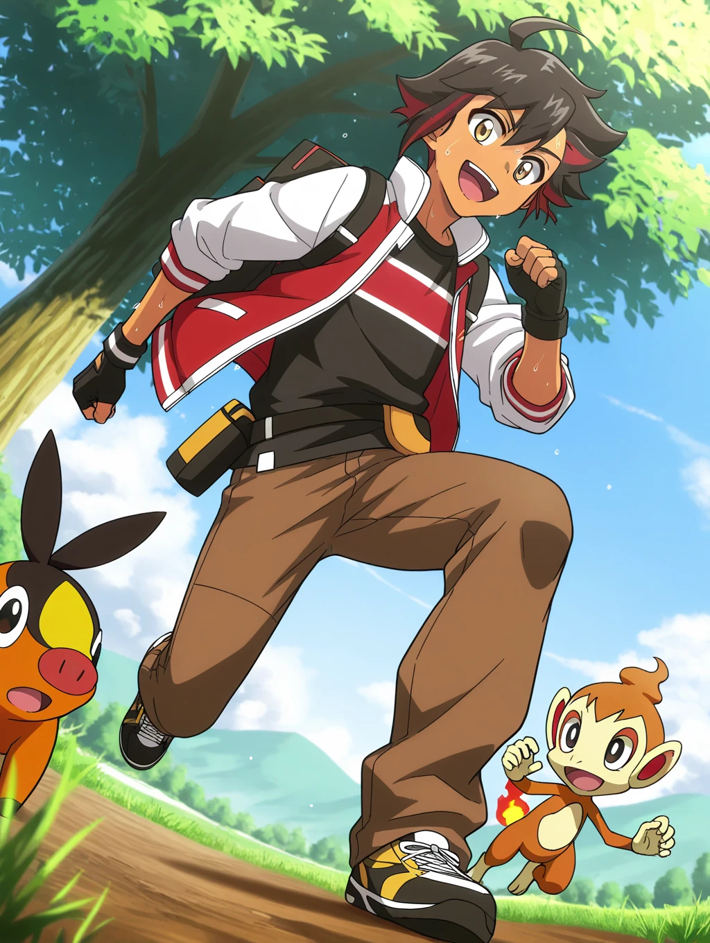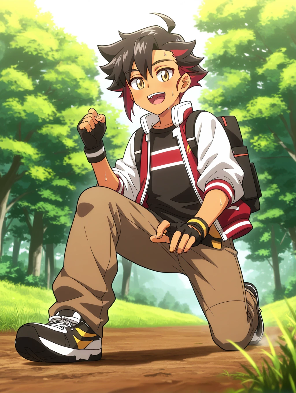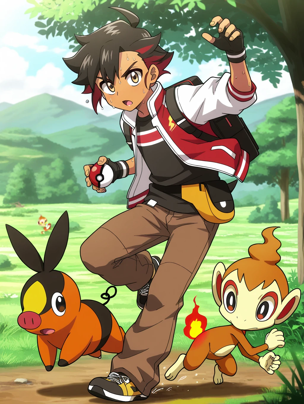 ryou_pkm, multicolor hair, black hair, red hair, golden eyes, hair over ear