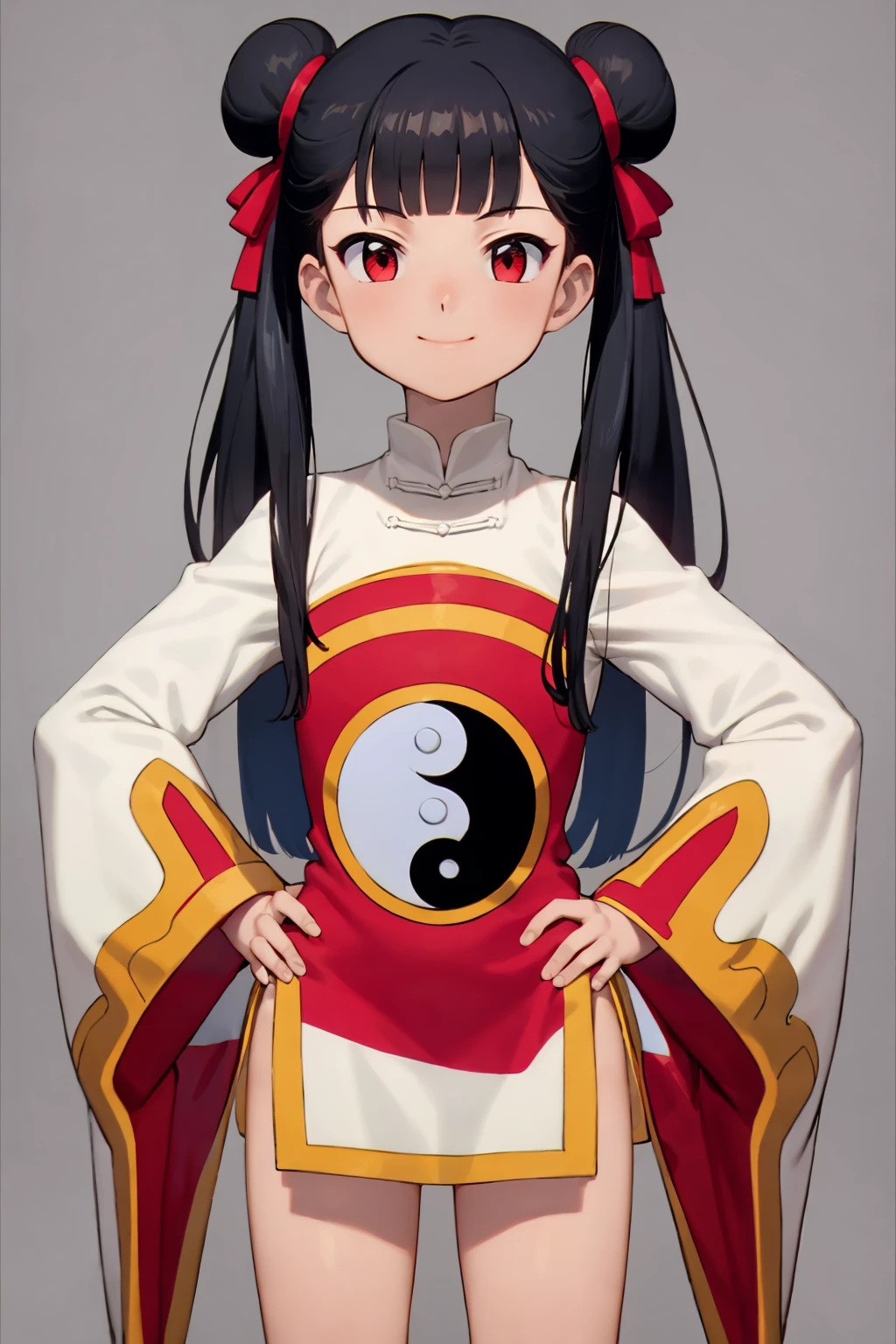 Basic prompts : 1girl, meilingli, black hair, blunt bangs, double bun, twintails, long hair, red eyes