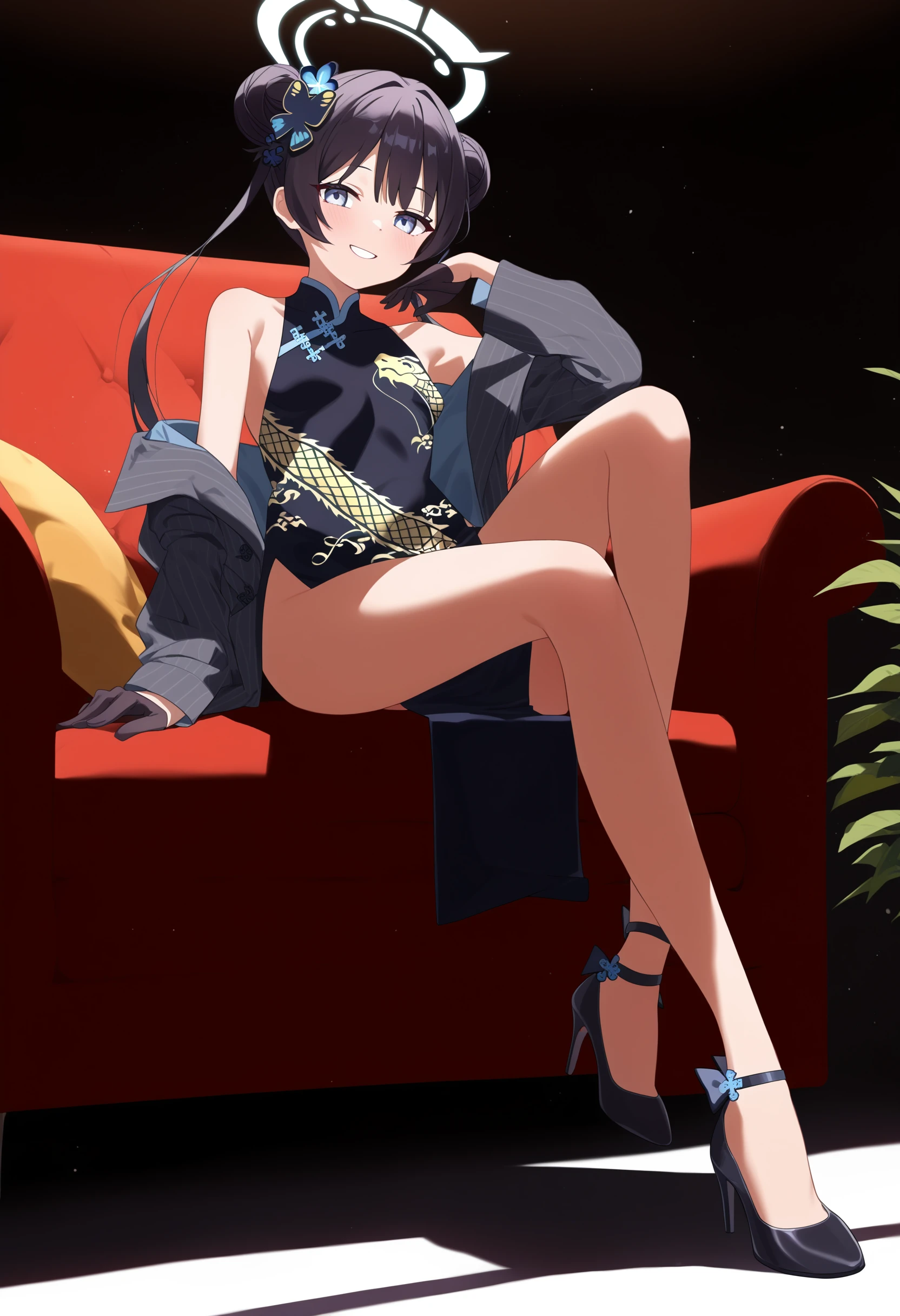 black hair, halo, double bun, hair bun, twintails, long hair,