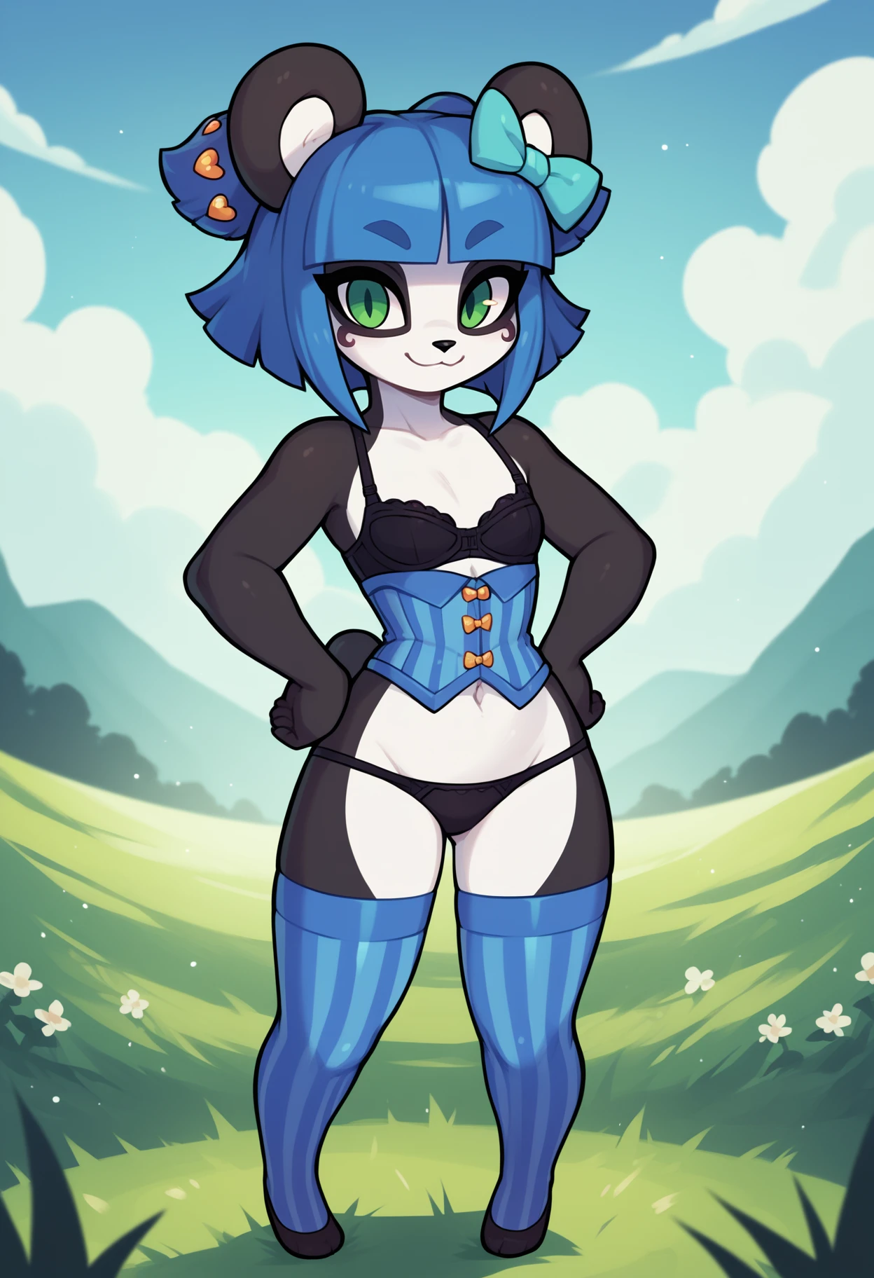 Outfit prompts : black bra, black panties, blue thighhighs, vertical-striped thighhighs, corset, navel