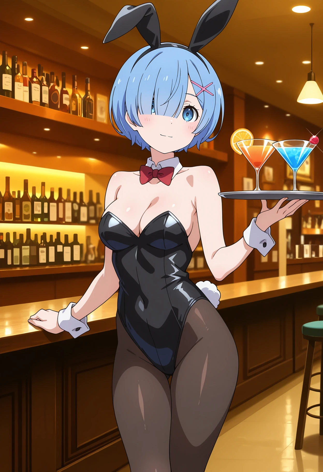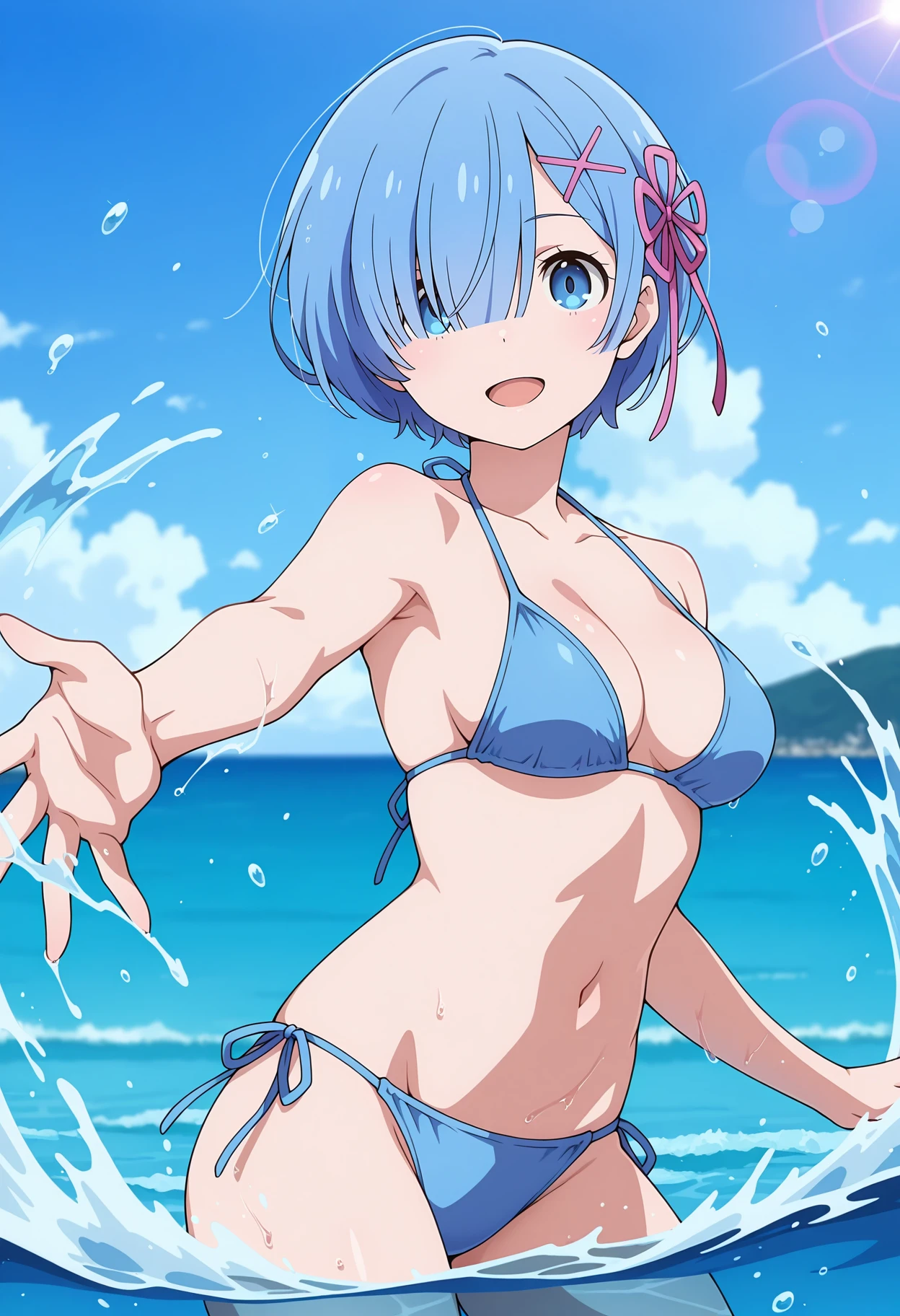 hair over one eye, blunt bangs, short hair, blue hair, blue eyes, dot nose, x hair ornament, hair ribbon, purple ribbon