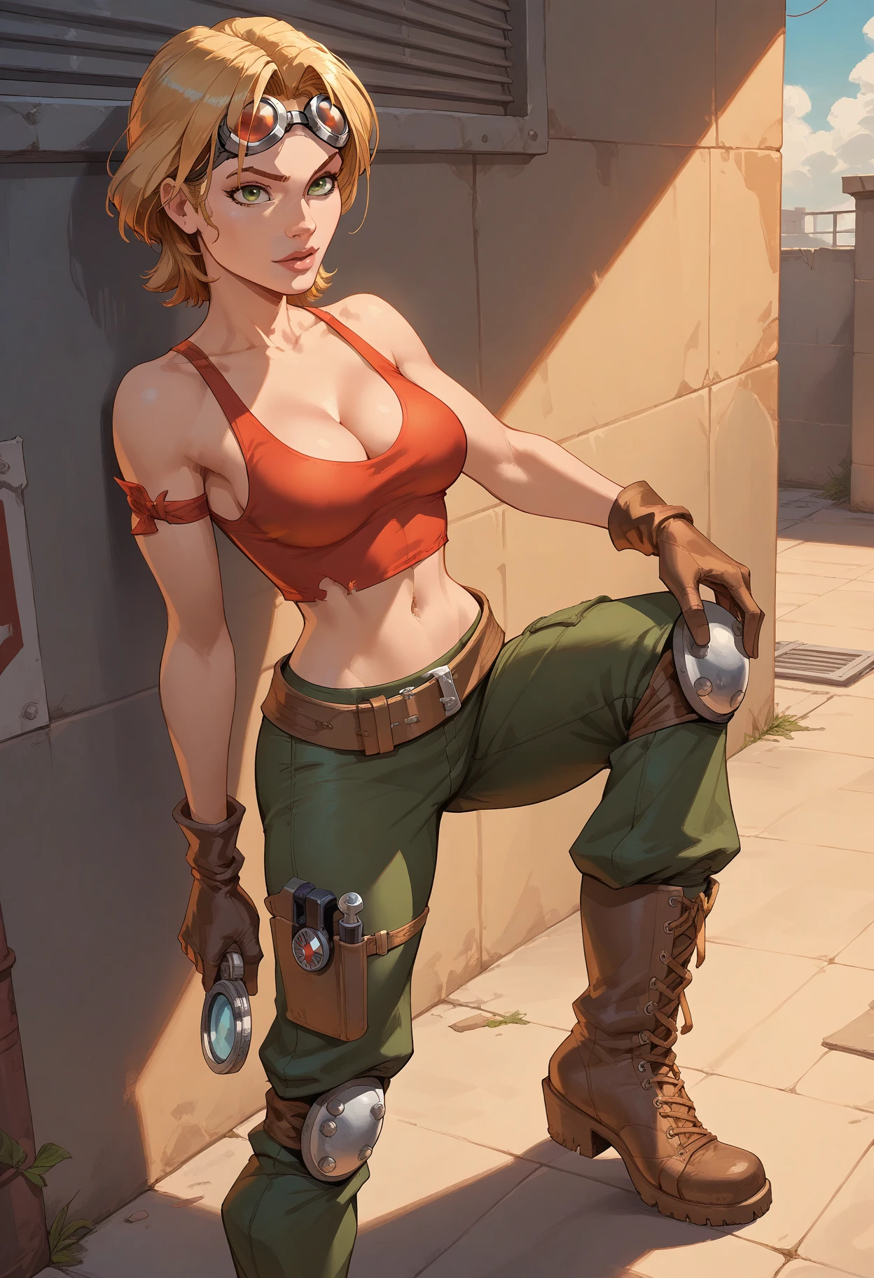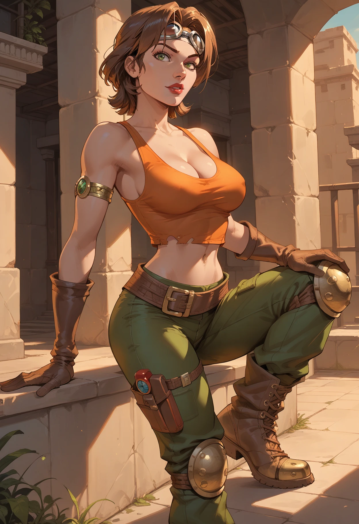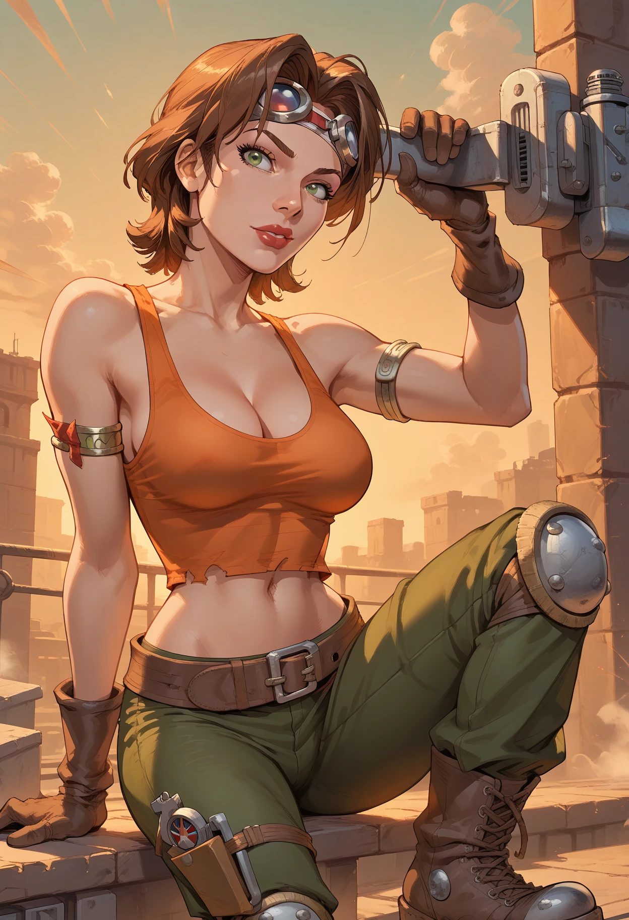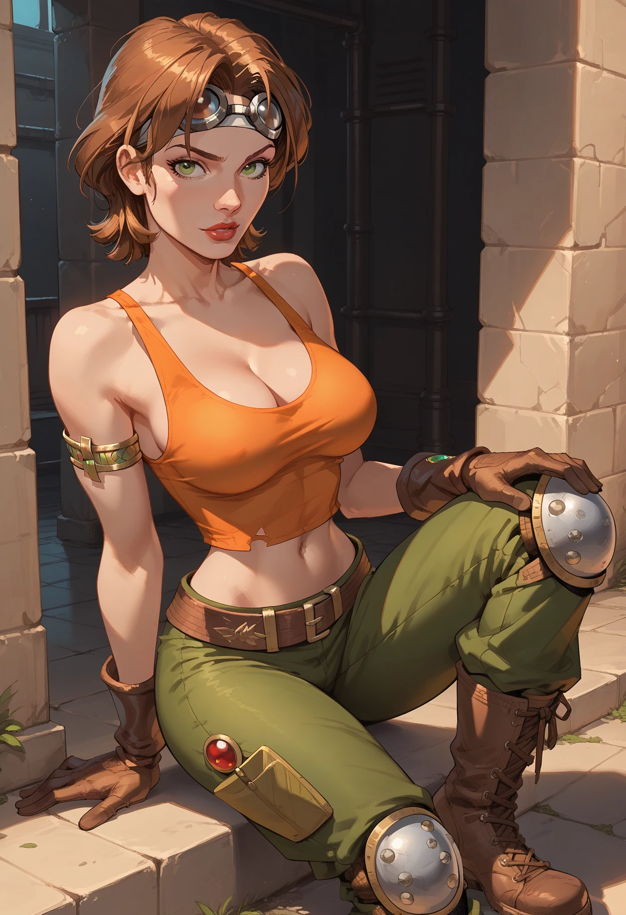 tank top, orange top, crop top, cleavage, navel, midriff, gloves, brown gloves, armlet, belt, pants, green pants, knee pads, boots, headband,goggles, goggles on head