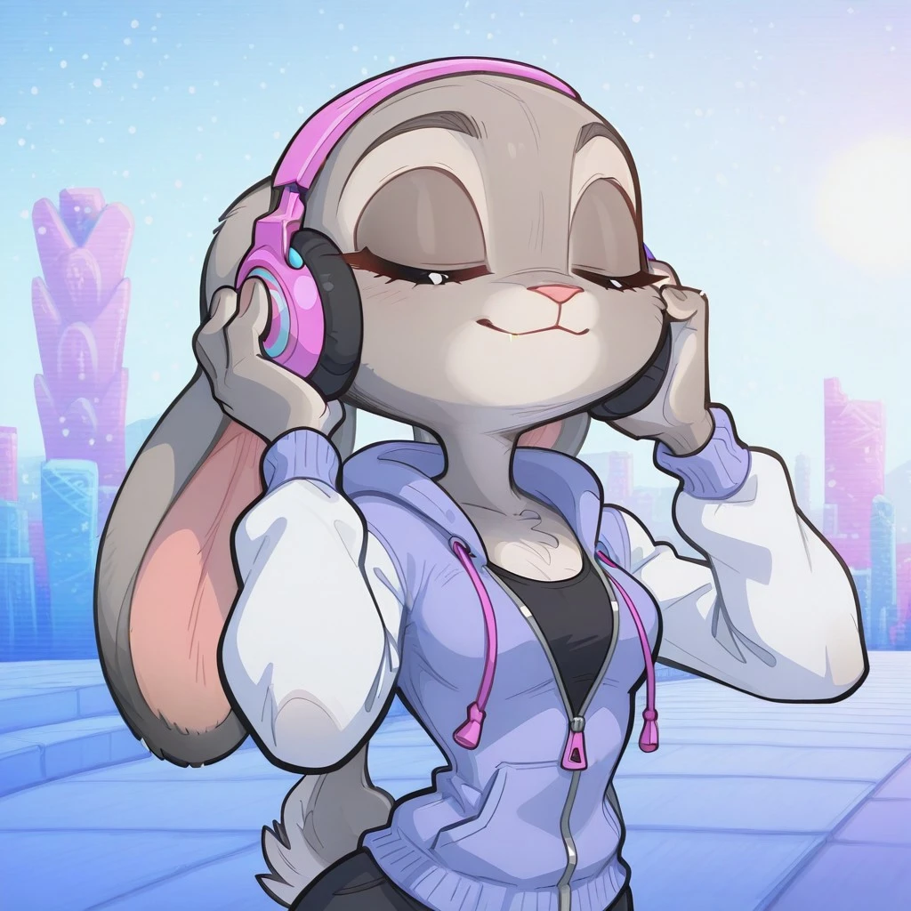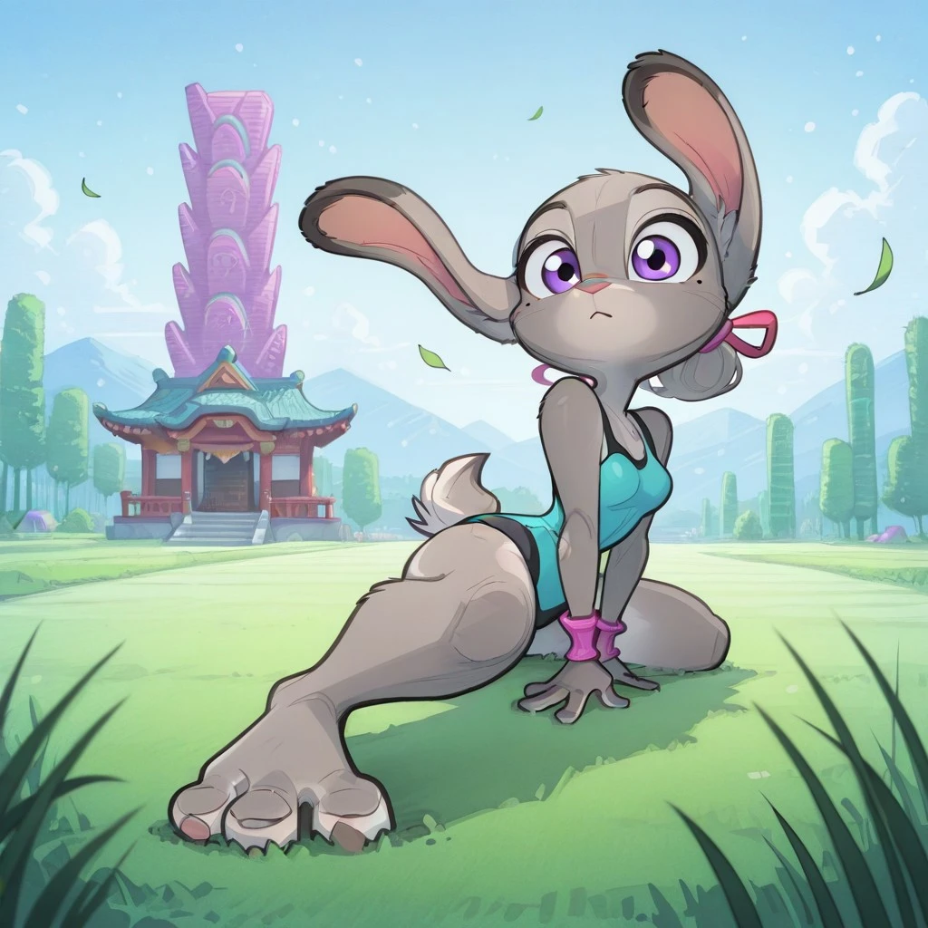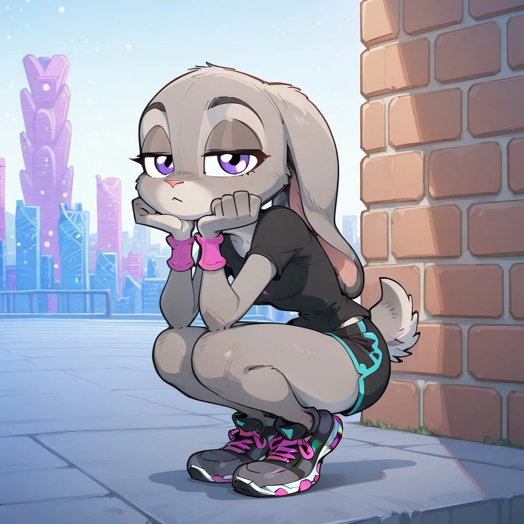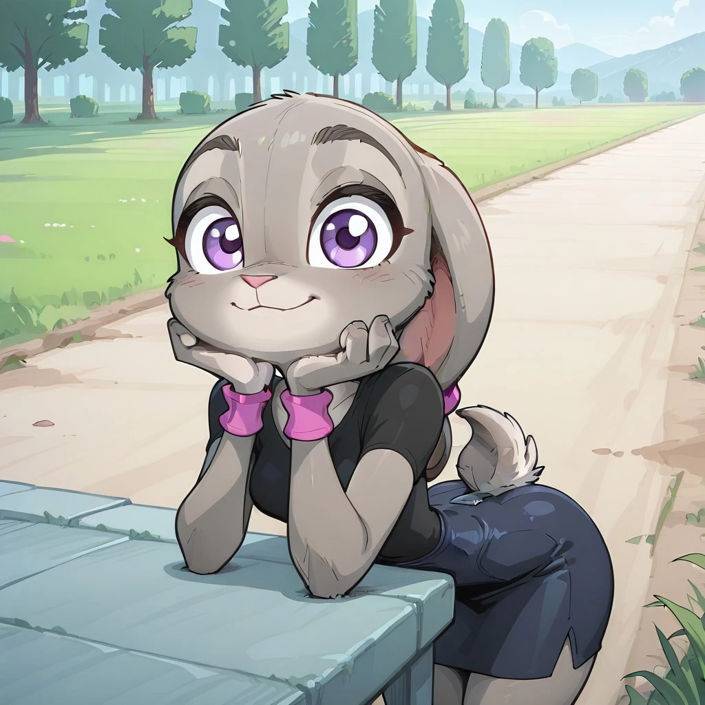 judy_hopps, 1girl, solo, rabbit girl, rabbit tail, furry, furry female, animal nose, animal ears, rabbit ears, purple eyes, colored skin, grey skin, body fur, tail, two-tone fur, animal feet,