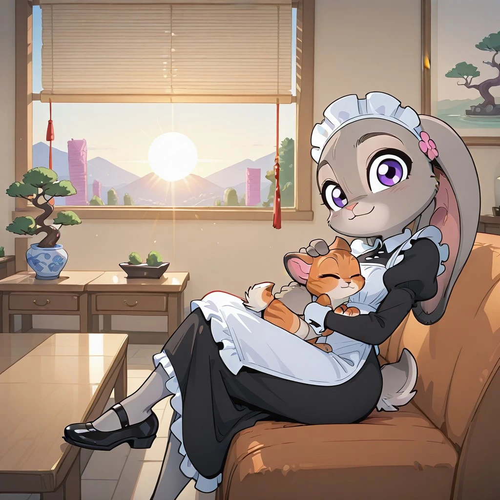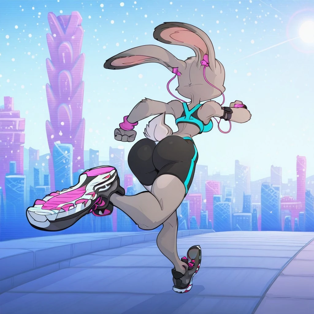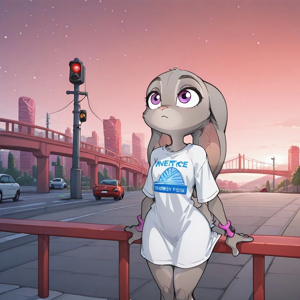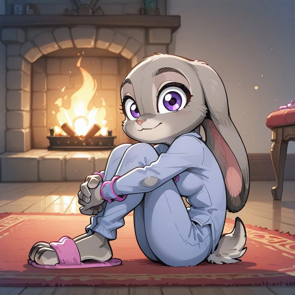 judy_hopps, 1girl, solo, rabbit girl, rabbit tail, furry, furry female, animal nose, animal ears, rabbit ears, purple eyes, colored skin, grey skin, body fur, tail, two-tone fur, animal feet,