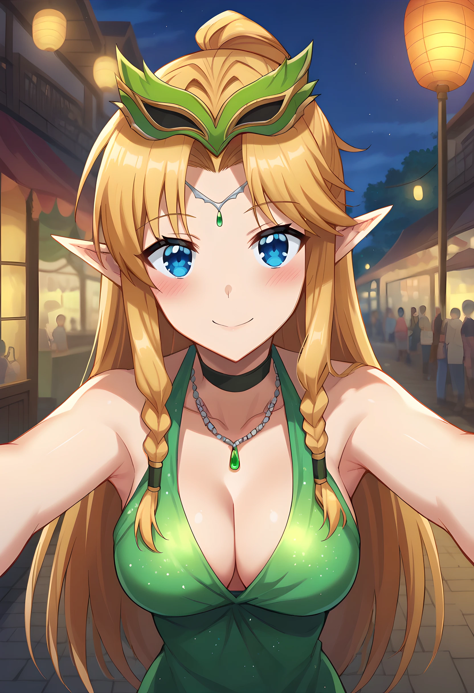 Mull3r, 1girl, very long hair, twin side braids, sidelocks, short ponytail, half updo, parted bangs, blonde hair, blue eyes, pointy ears, small breasts, circlet,For her default outfit add also: