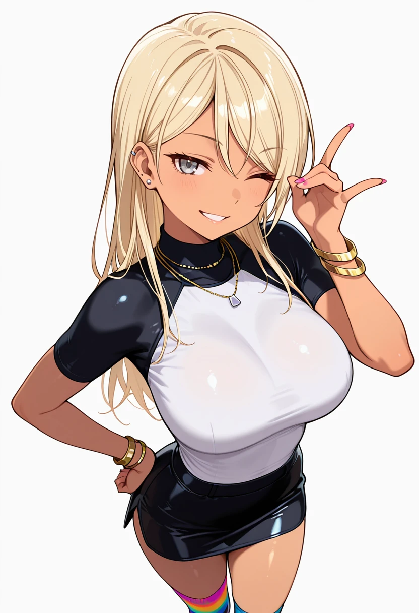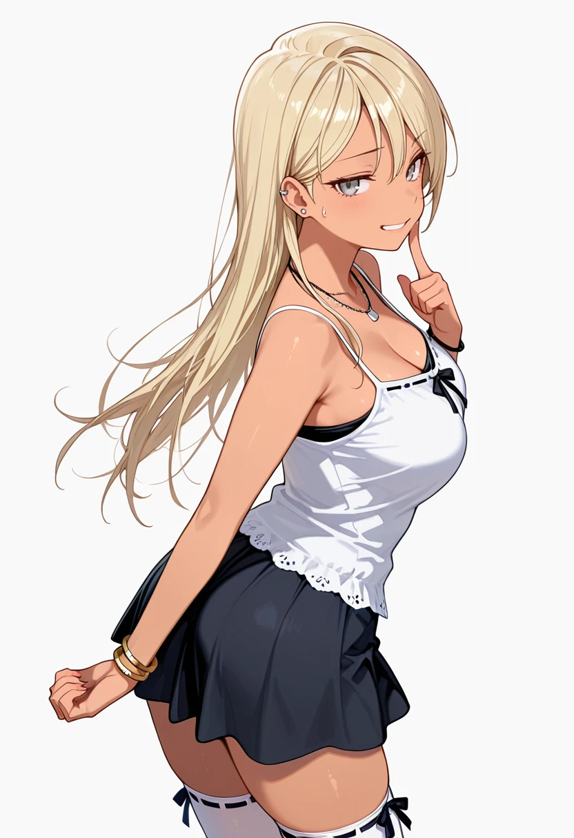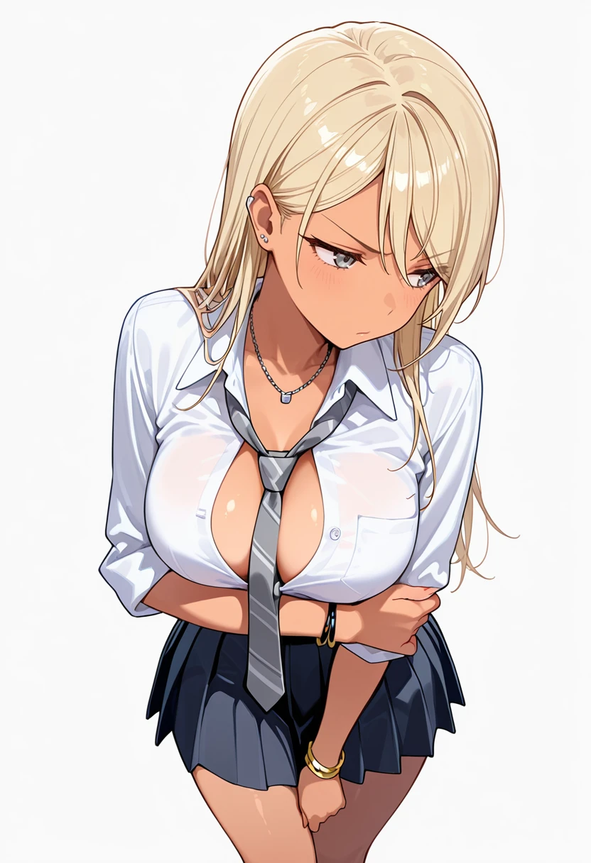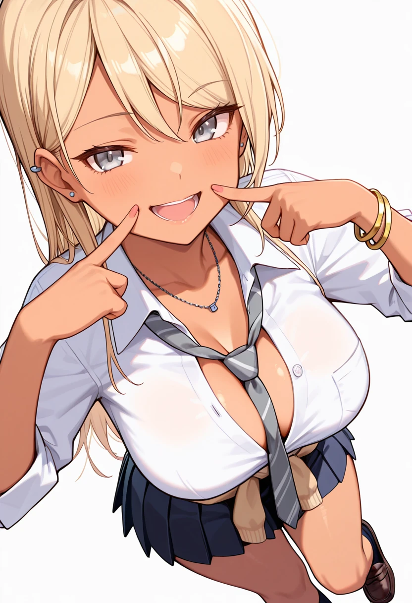 nagisa_cnr, 1girl, blonde hair, dark-skinned female, large breasts, long hair, grey eyes,gyaru,dark skin, tan,necklace, bracelet, piercing, stud earrings,👗Default Outfit