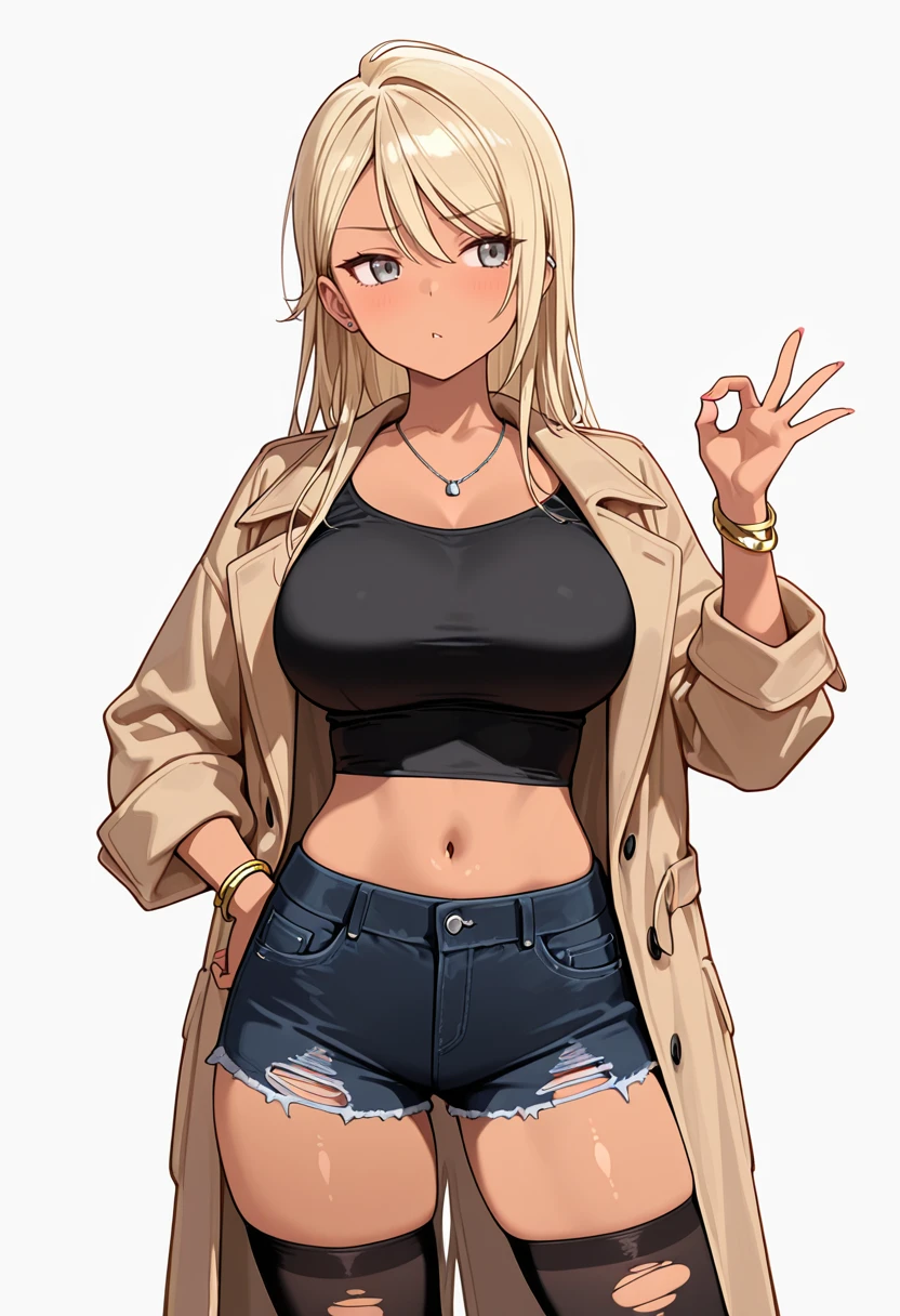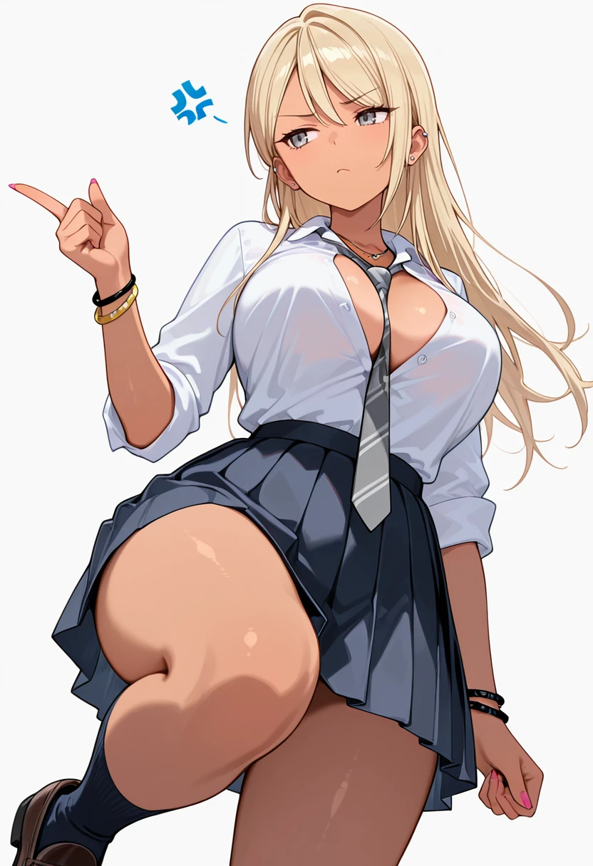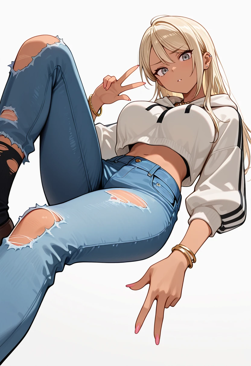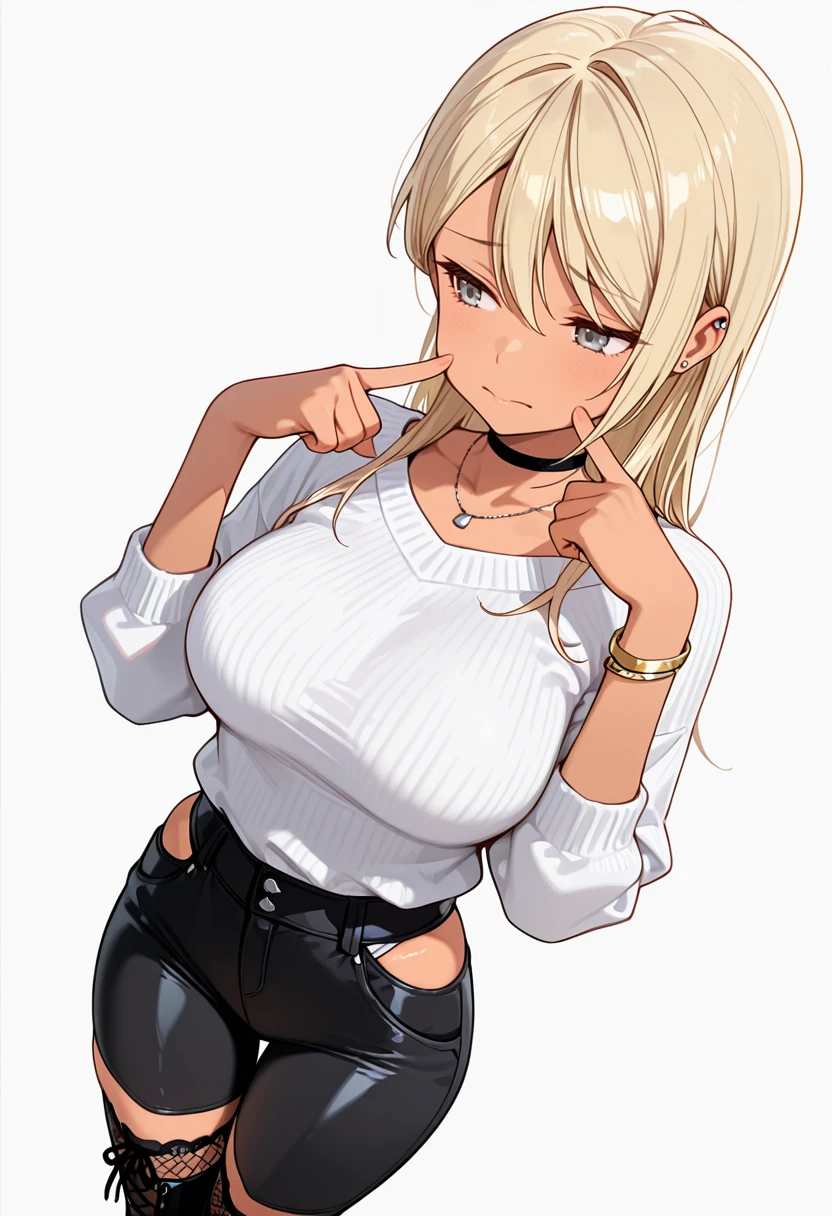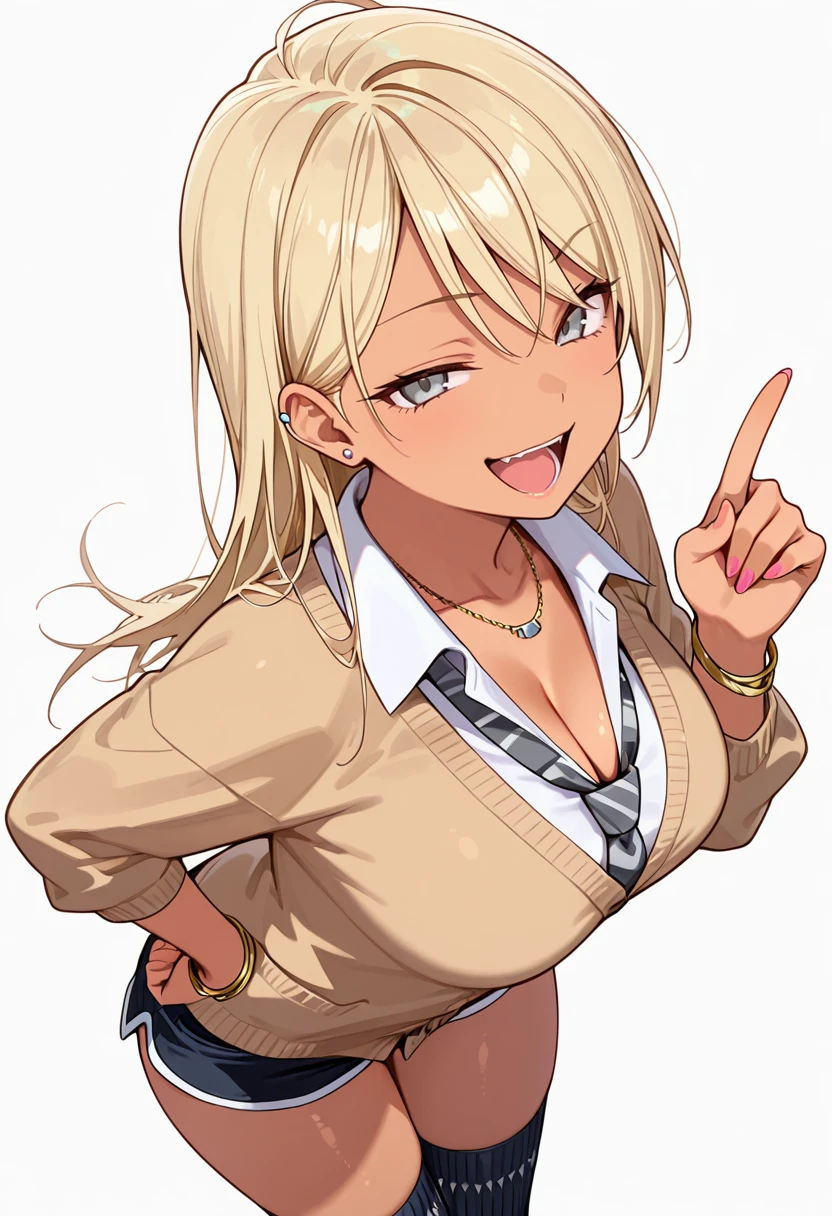 nagisa_cnr, 1girl, blonde hair, dark-skinned female, large breasts, long hair, grey eyes,gyaru,dark skin, tan,necklace, bracelet, piercing, stud earrings,👗Default Outfit
