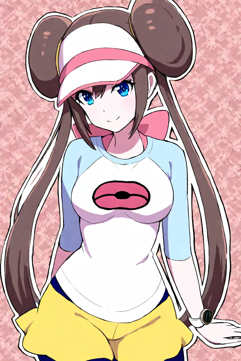 zzRosa, hair bun, blue eyes, twintails, visor cap, pantyhose, raglan sleeves, yellow shorts, shirt, pink bow, wristwatch