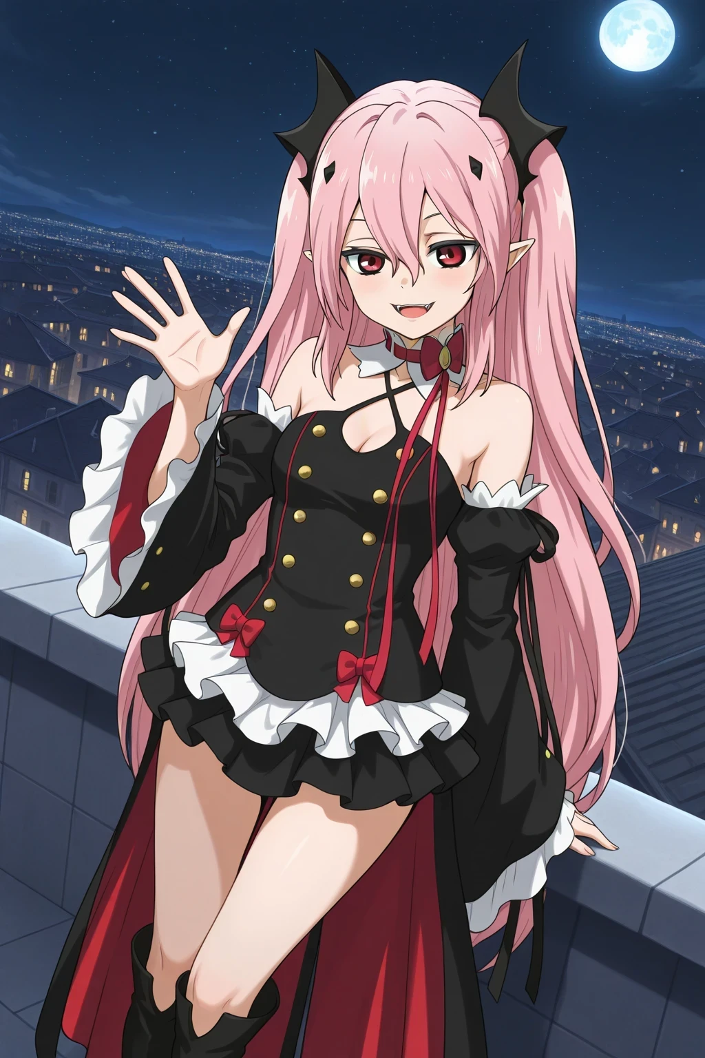 1girl, krul tepes, solo, long hair, pink hair, red eyes, pointy ears, twintails, hair ornament