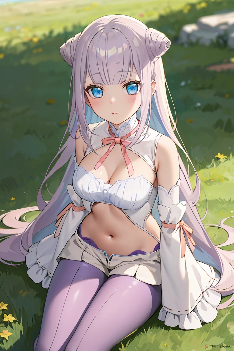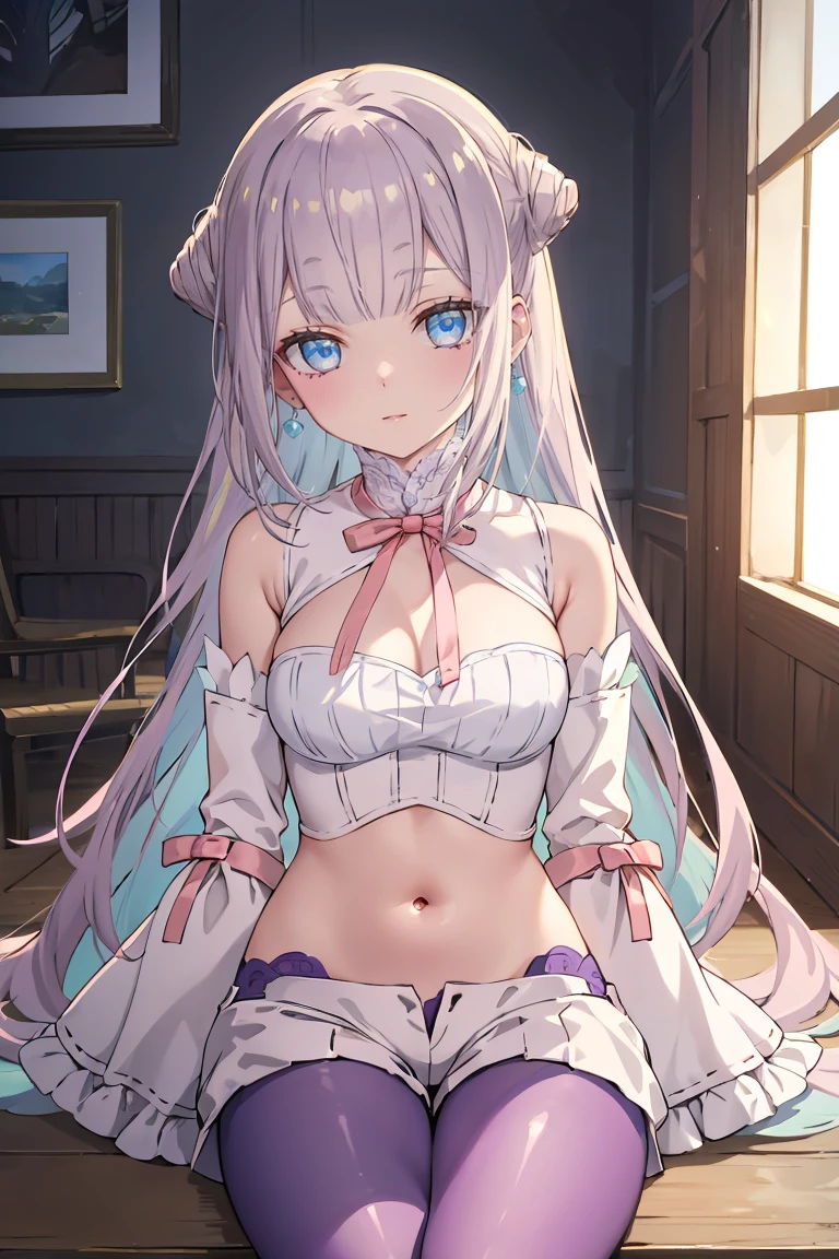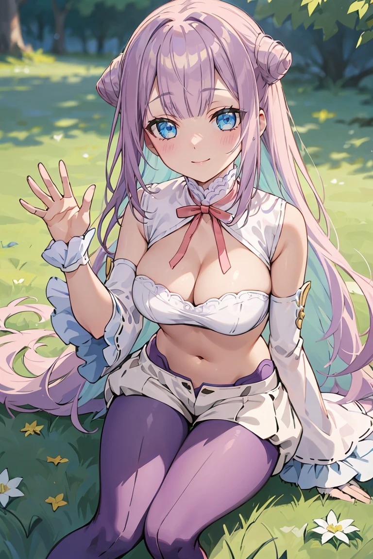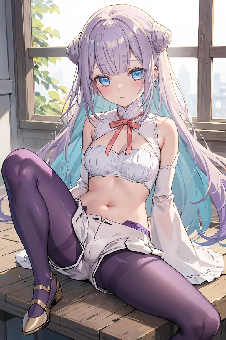Outfit: white dress, cleavage, pleated shorts, white sleeves, midriff, sleeves past wrists, purple pantyhose, pink neck ribbon