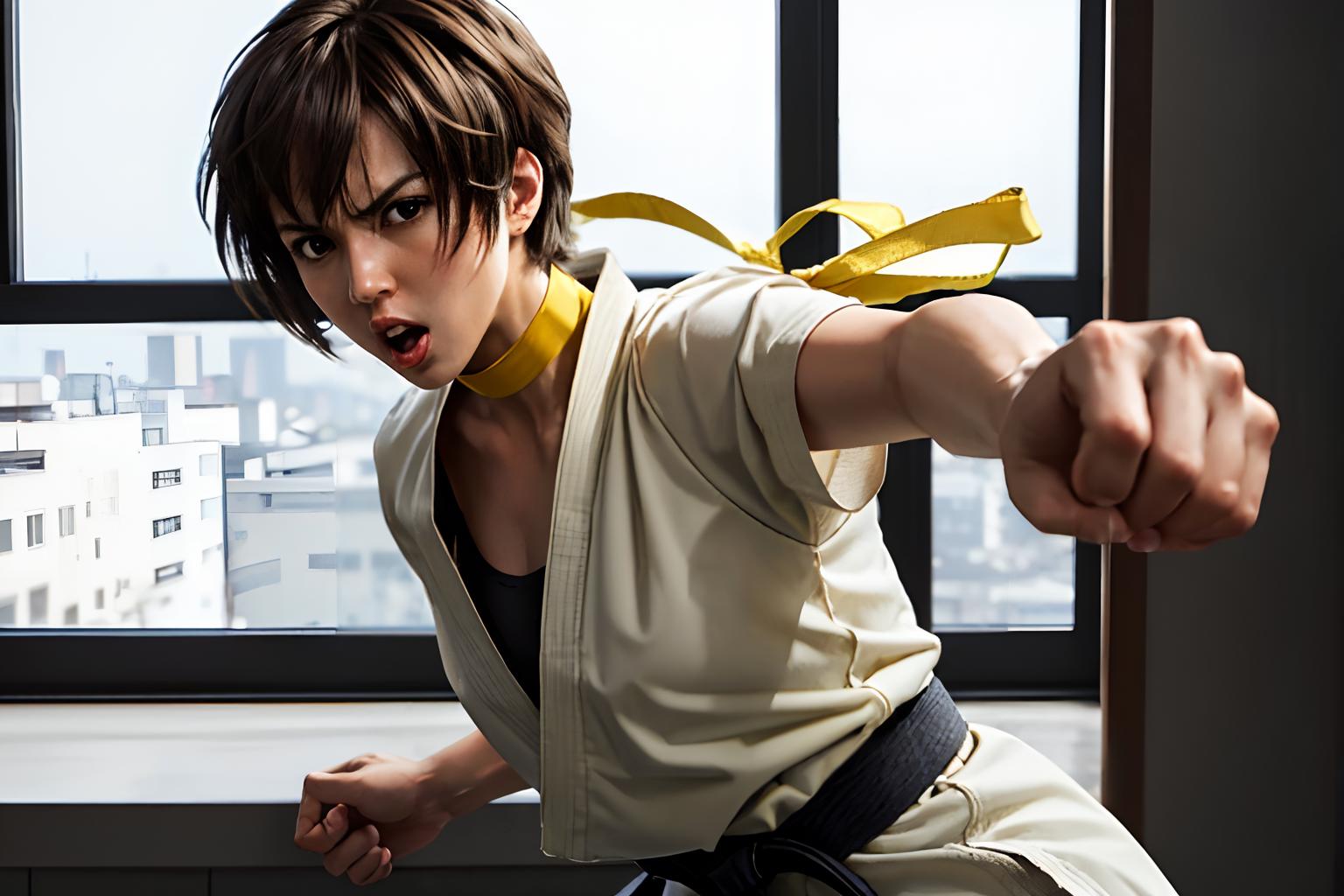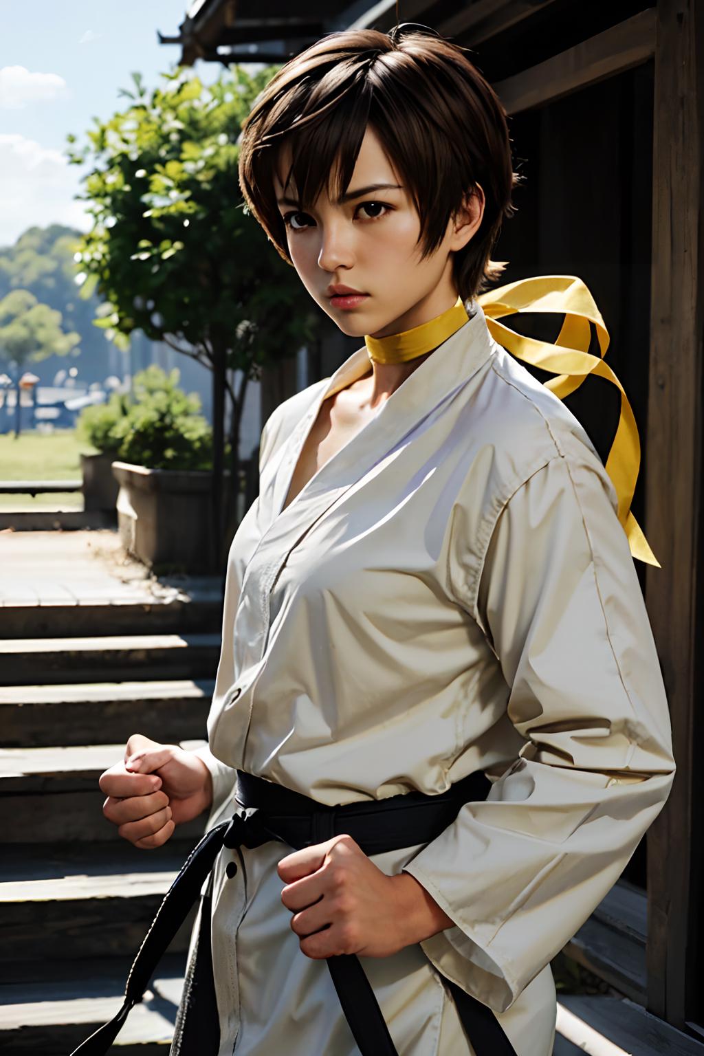 makotoms, ribbon choker, dougi, sports bra, belt, cleavage