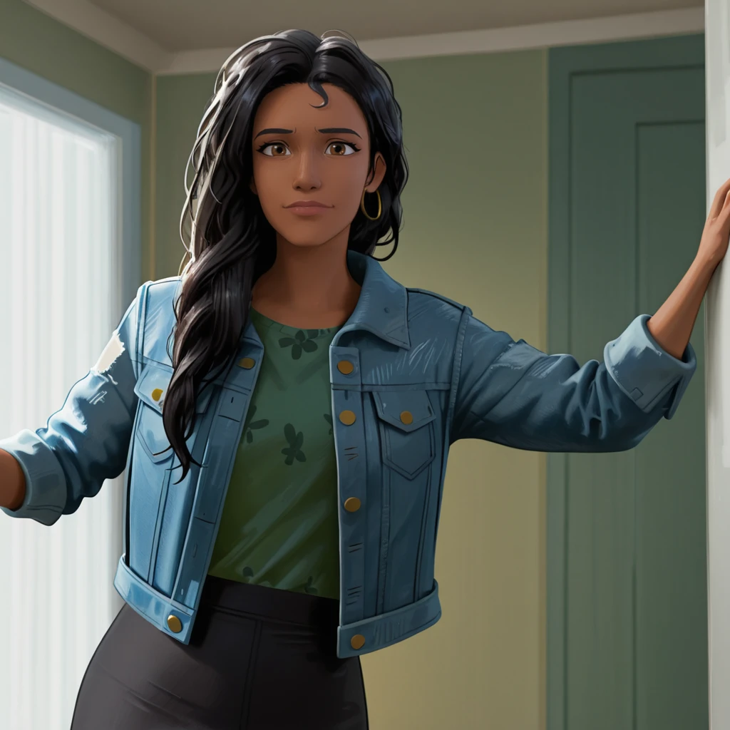 Trigger with jacket: RioMoralesJacket, 1girl, long hair, denim jacket, black skirt, black hair, green shirt, brown eyes, blue jacket, dark-skinned female, dark skin, cowboy shot