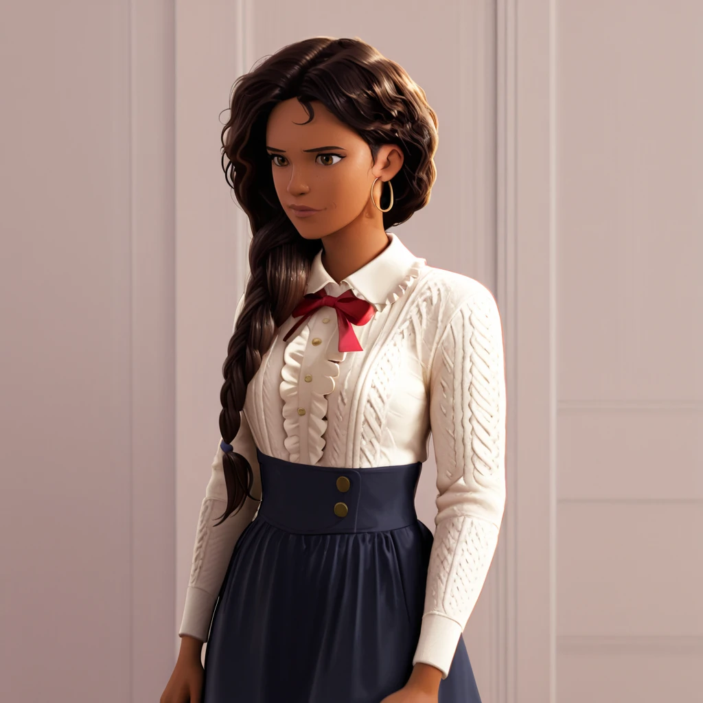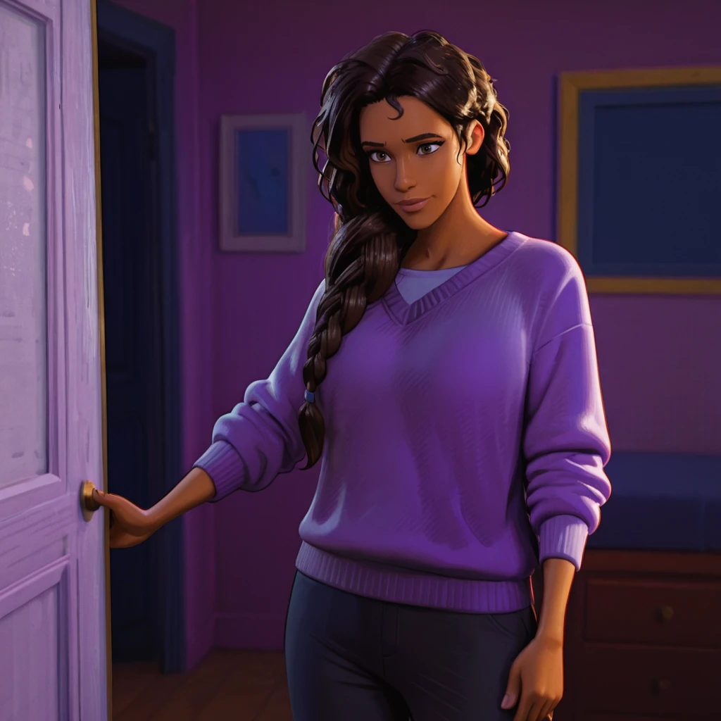 Trigger with 42 outfit: RioMorales42, 1girl, long hair, pants, purple sweater, braid, brown hair, dark skin, dark-skinned female, long hair over shoulder, cowboy shot