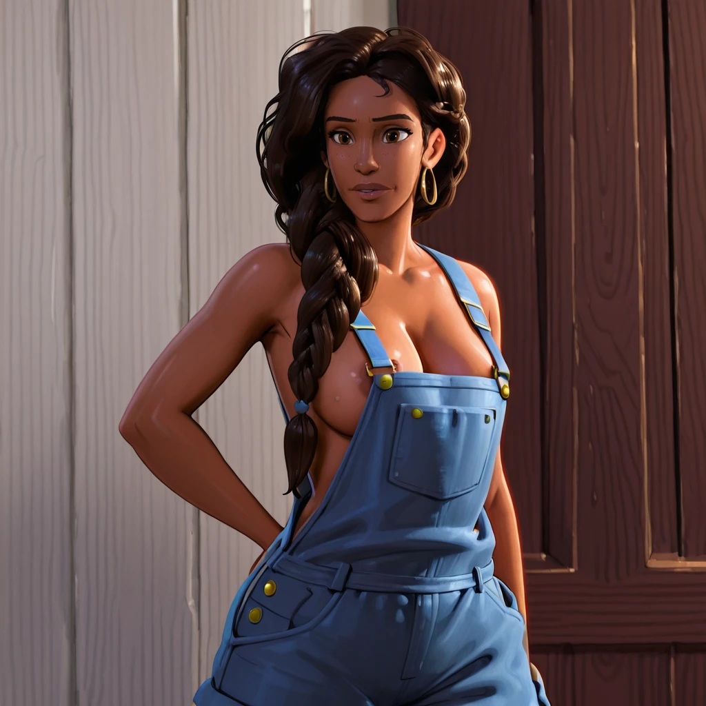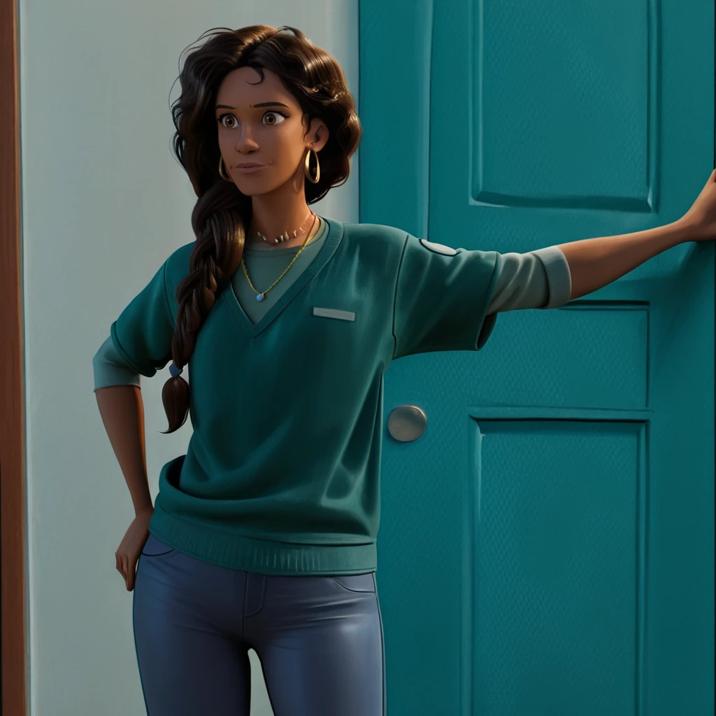 Trigger : RioMoralesITSV, 1girl, jewelry, hoop earrings, single braid, hair over shoulder, dark skin, necklace, long hair, dark-skinned female, green shirt, brown hair, brown eyes, green sweater, short sleeves, jeans, cowboy shot