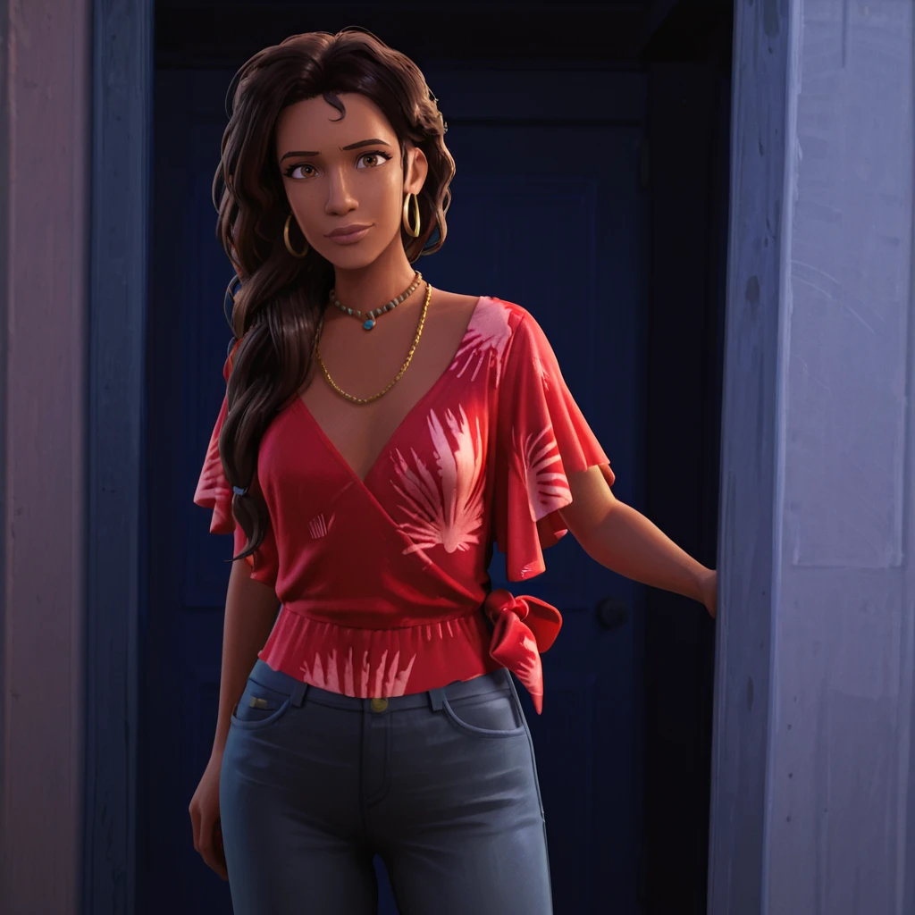 Trigger with across the spiderverse look: RioMoralesATSV, jewelry, 1girl, necklace, dark-skinned female, hoop earrings, dark skin, red shirt, long hair, brown hair, brown eyes, lips, jeans, pants, denim, nose, cowboy shot