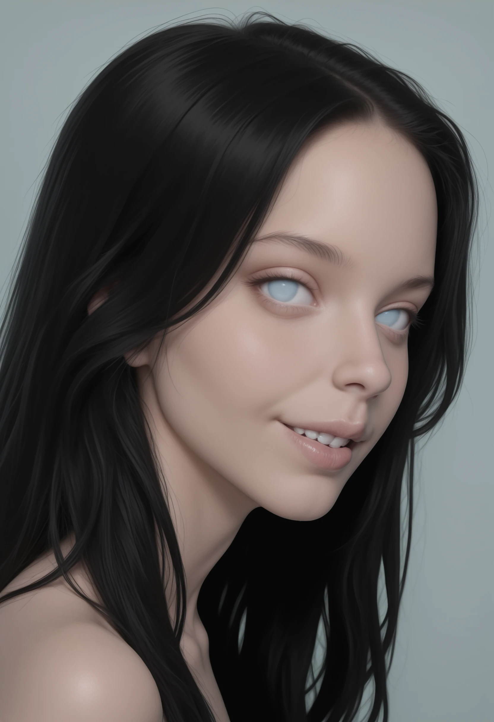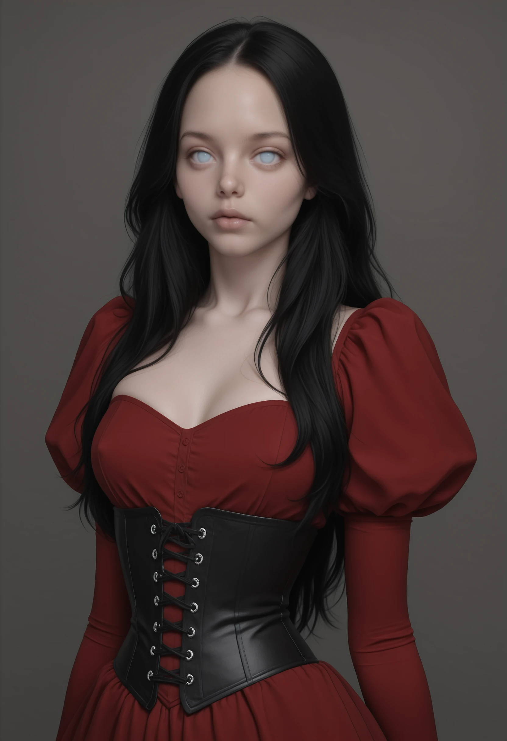 jdoilf, black hair, long hair, blue eyes, corset, dress, puffy sleeves, breasts, no pupils