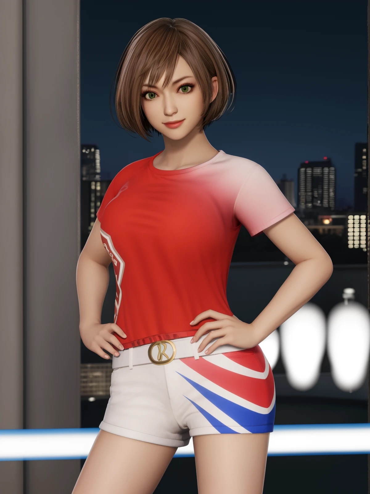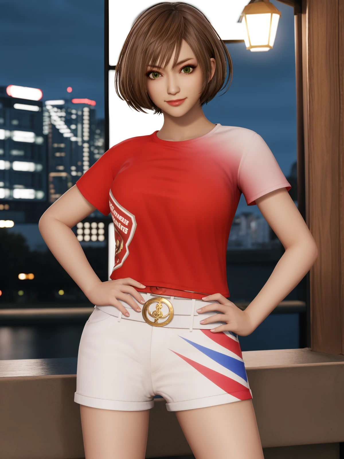 ZSGWSsunshangxiangSCNL, 1girl, solo, shorts, brown hair, short hair, shirt, looking at viewer, brown eyes, smile, belt, green eyes,short shorts, cityscape, night, hand on hip,