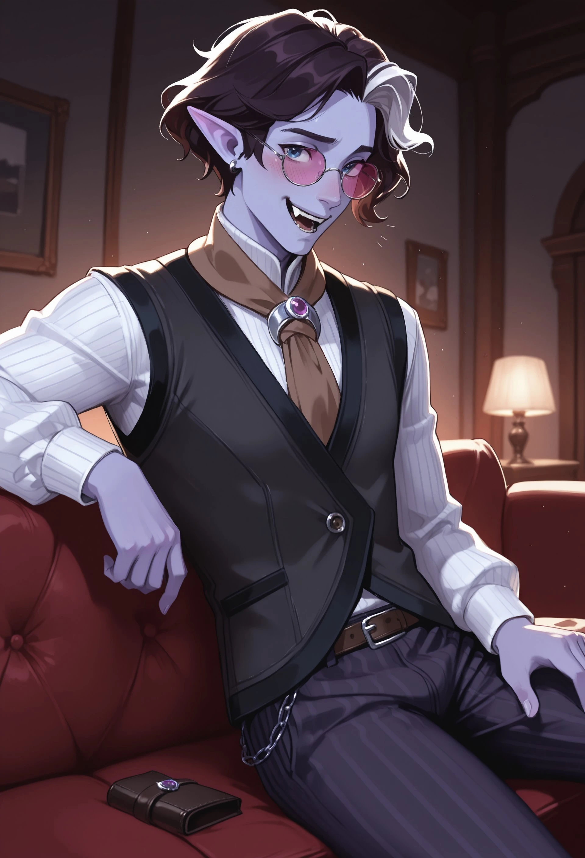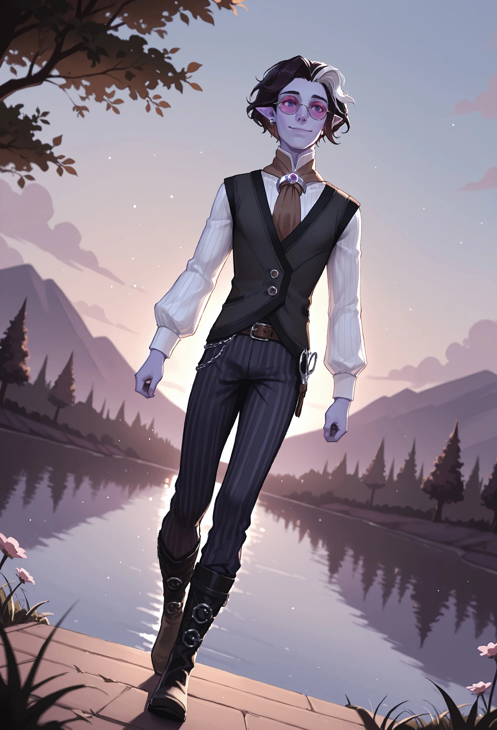 PaliaJel, 1boy, short hair, wavy hair, curtained hair, parted bangs, streaked hair, two-tone hair, black hair, white hair, pointy ears, blue eyes, purple skin, single earring,