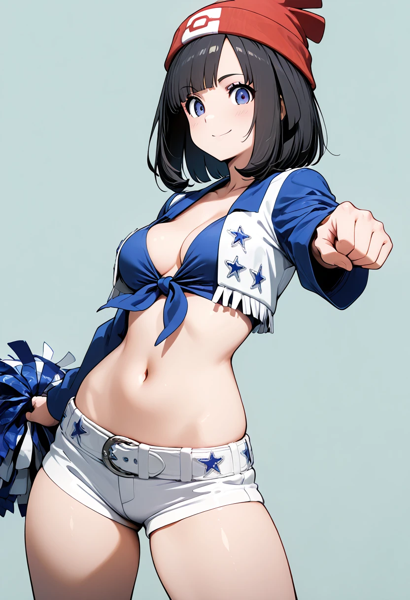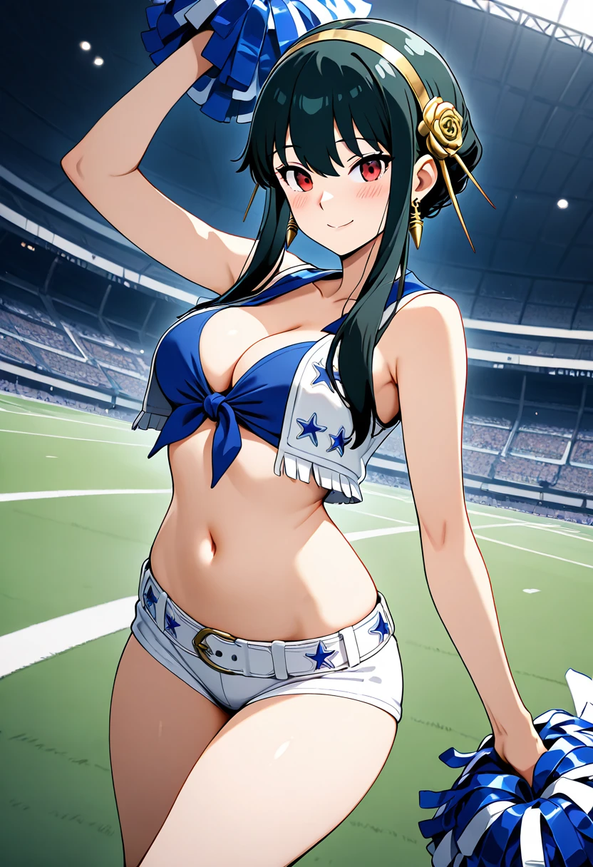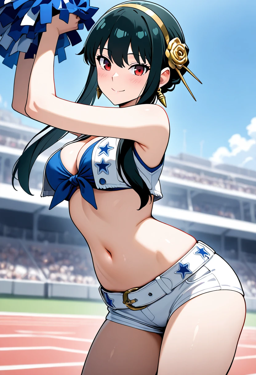 DalCowCheer, navel, midriff, belt, blue tied shirt, white vest, white shorts, short shorts, skindentation, stadium, cheerleader, pom pom (cheerleading),