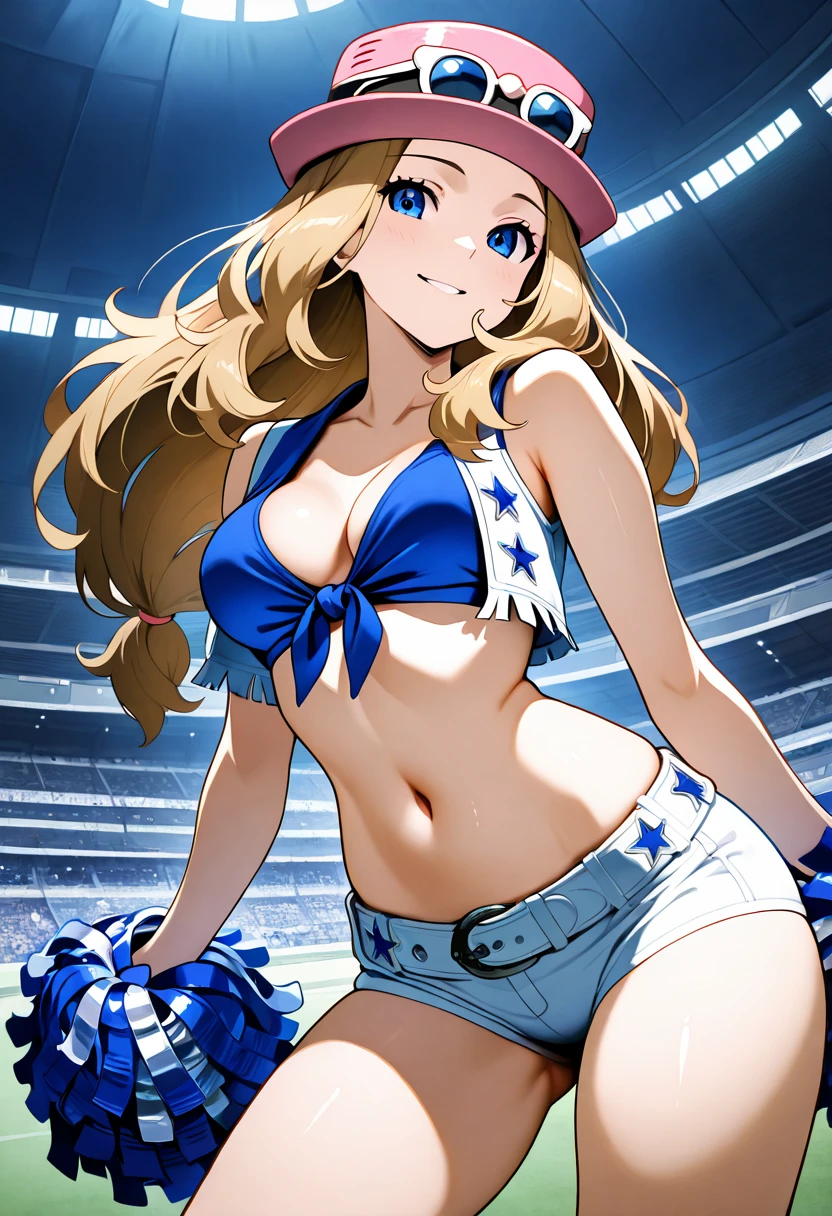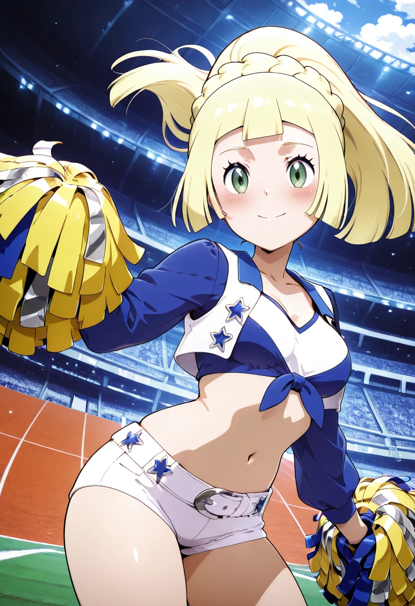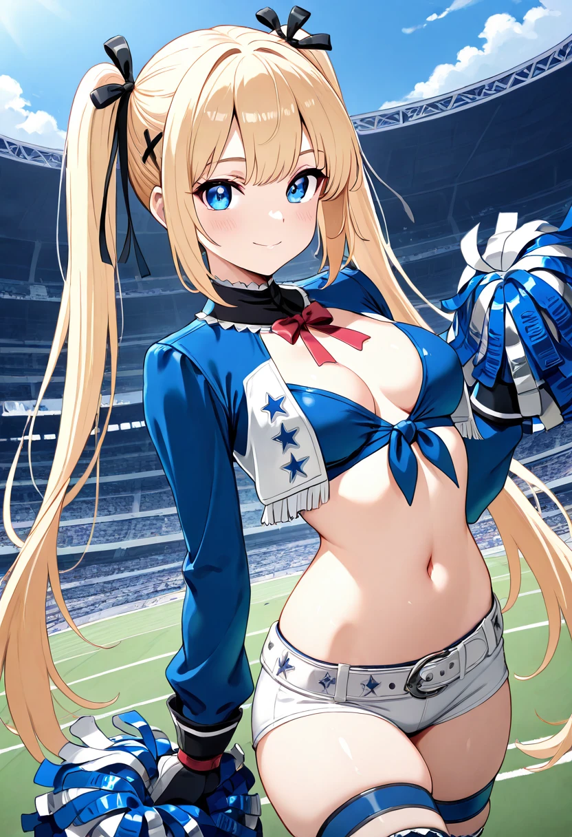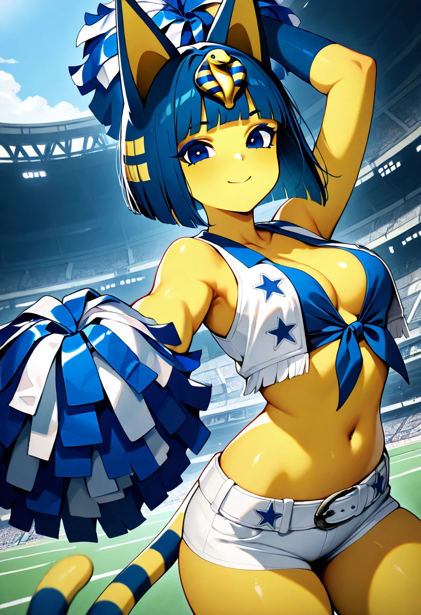 DalCowCheer, navel, midriff, belt, blue tied shirt, white vest, white shorts, short shorts, skindentation, stadium, cheerleader, pom pom (cheerleading),