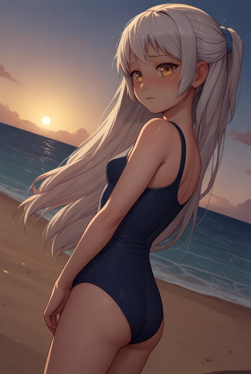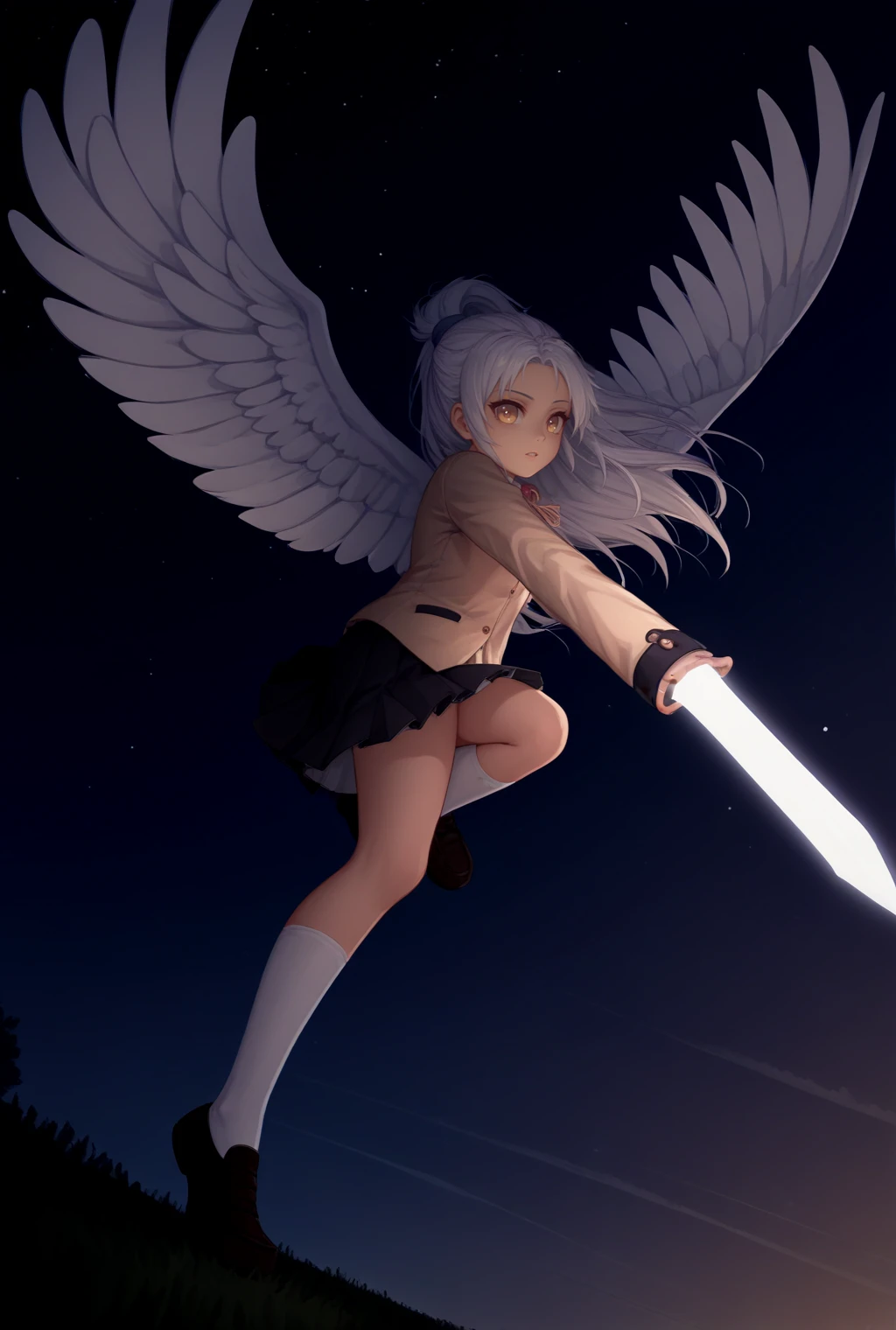 Outfit: ["yellow eyes, white hair, long hair, half updo, beige blazer, school uniform, jacket, skirt, ribbon, socks, shoes"]