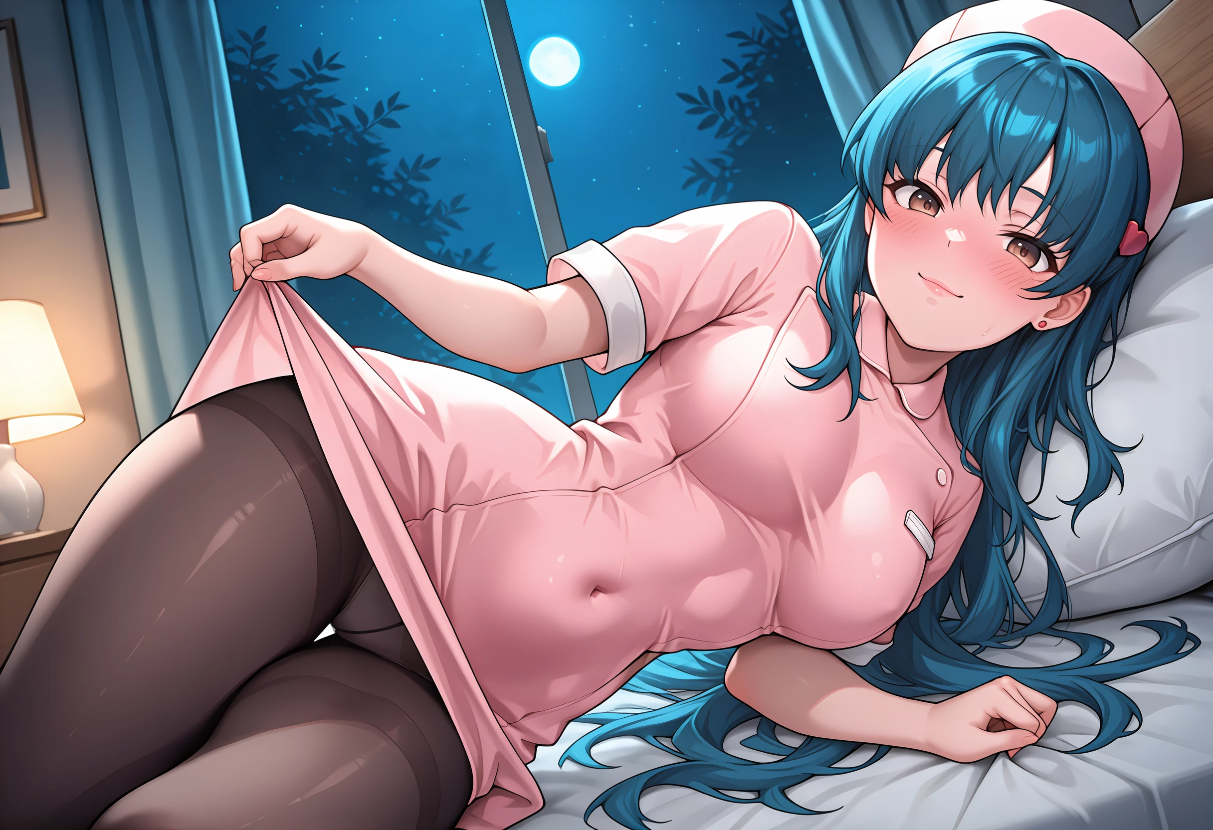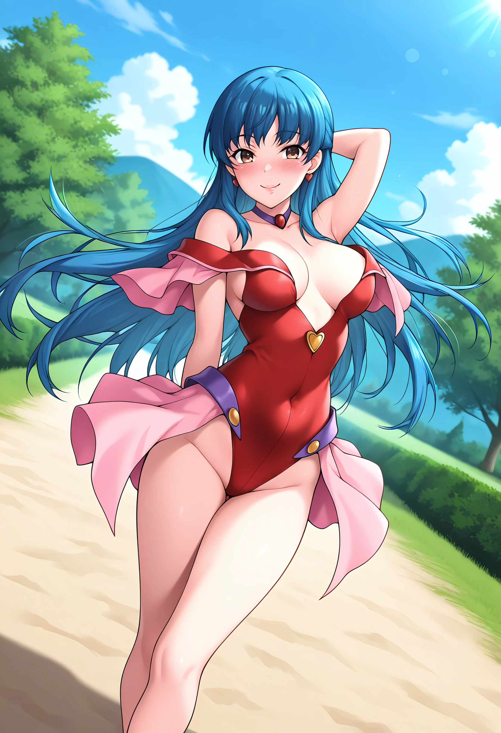 very long hair, blue hair, brown eyes, medium breasts,