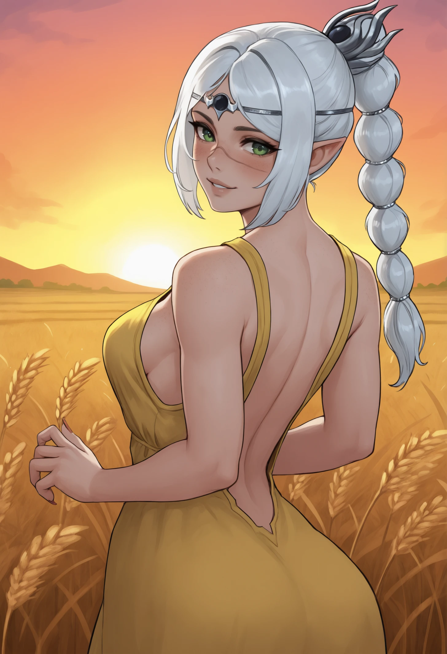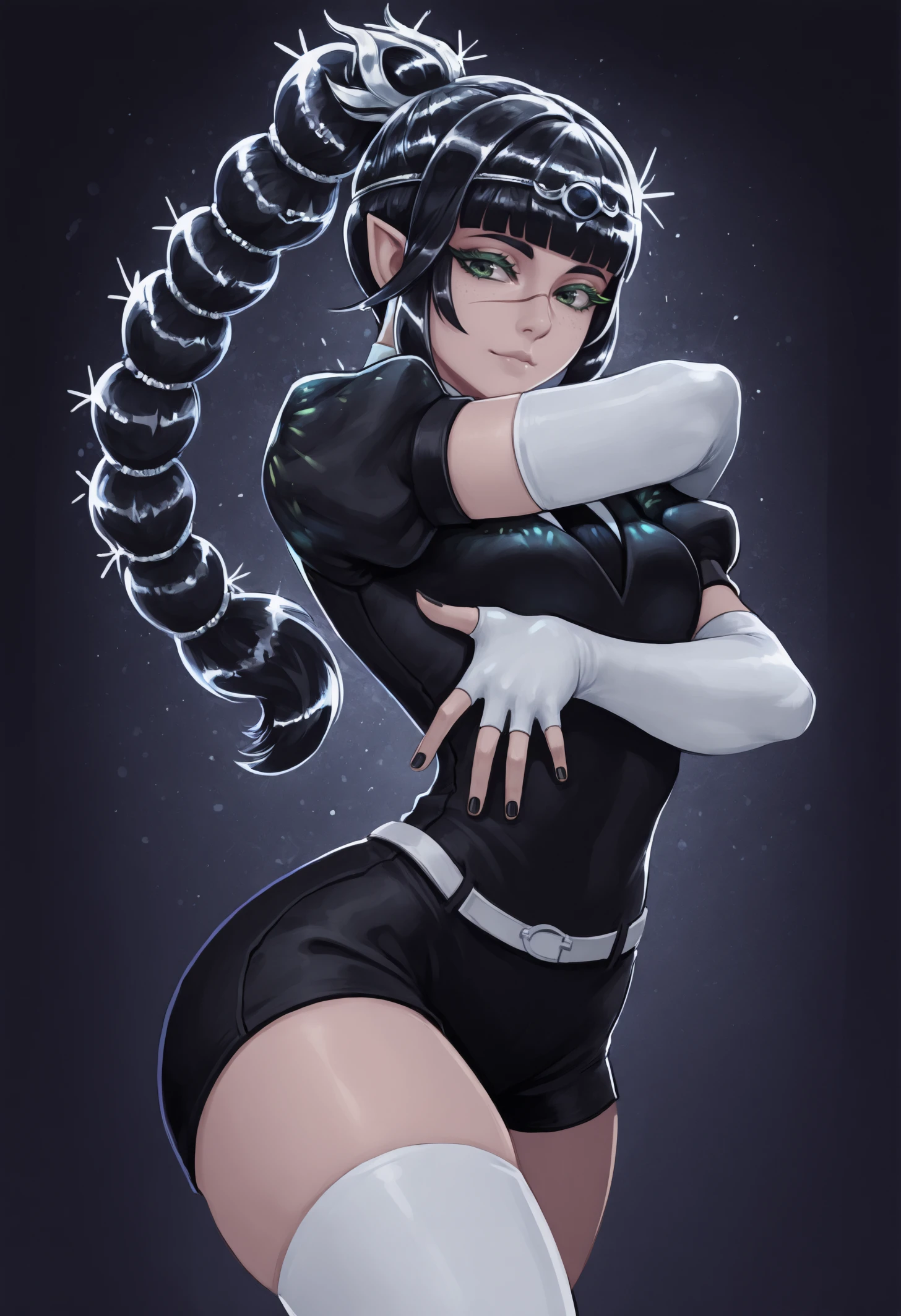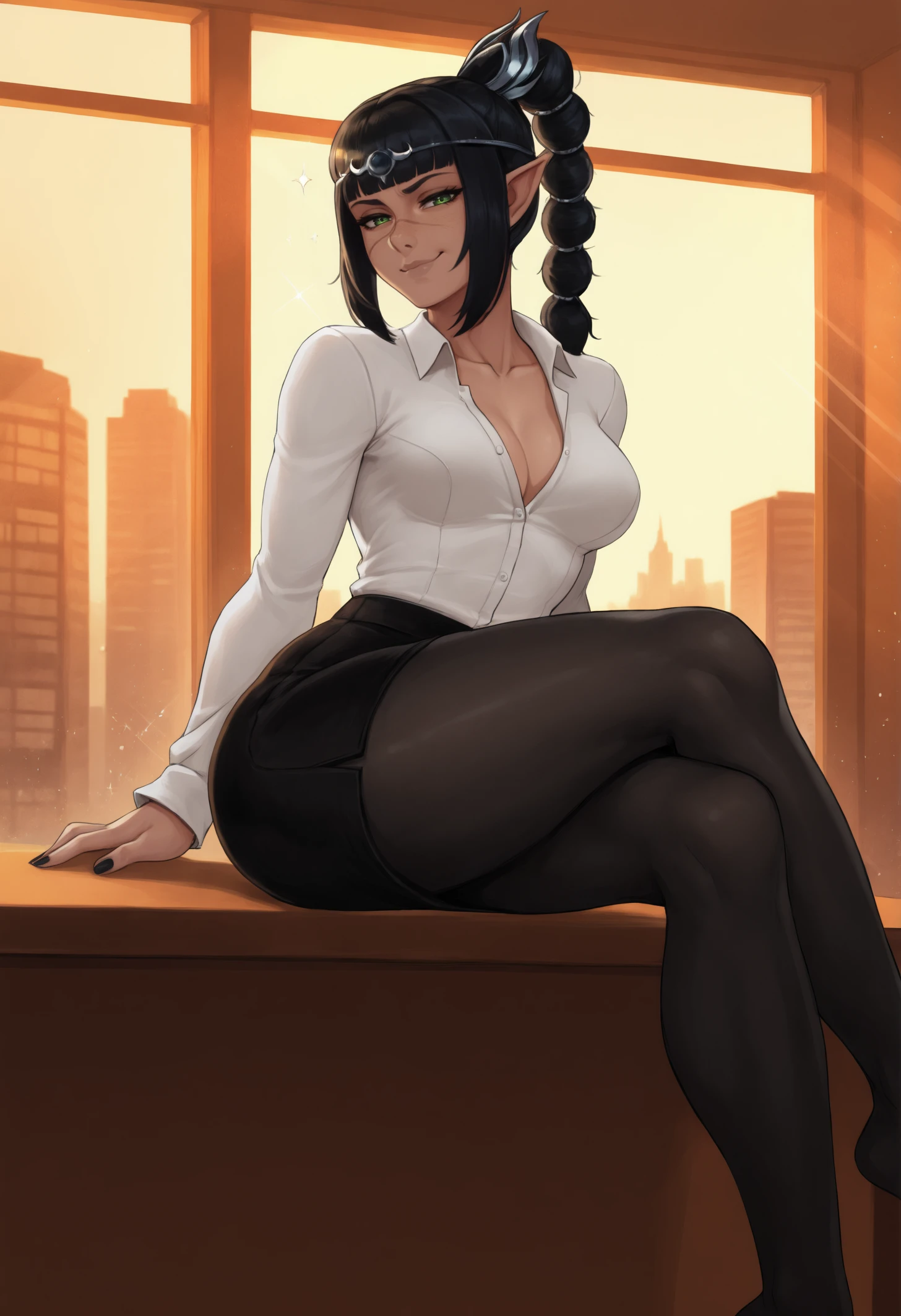 Always needed: "shadef, green eyes, black eyeliner, freckles, pointy ears, long hair, hair ornament, high ponytail, braided ponytail, medium breasts, scar on nose" always needed.