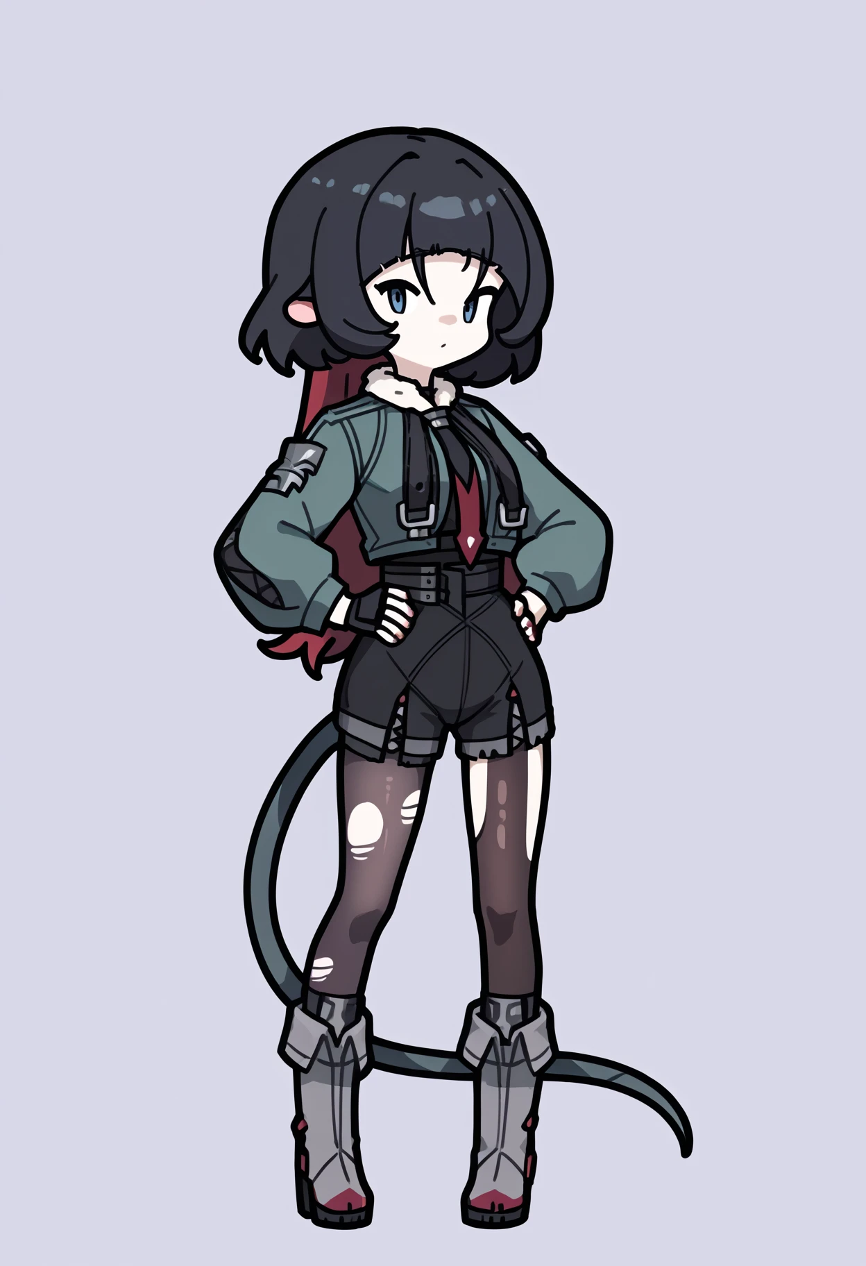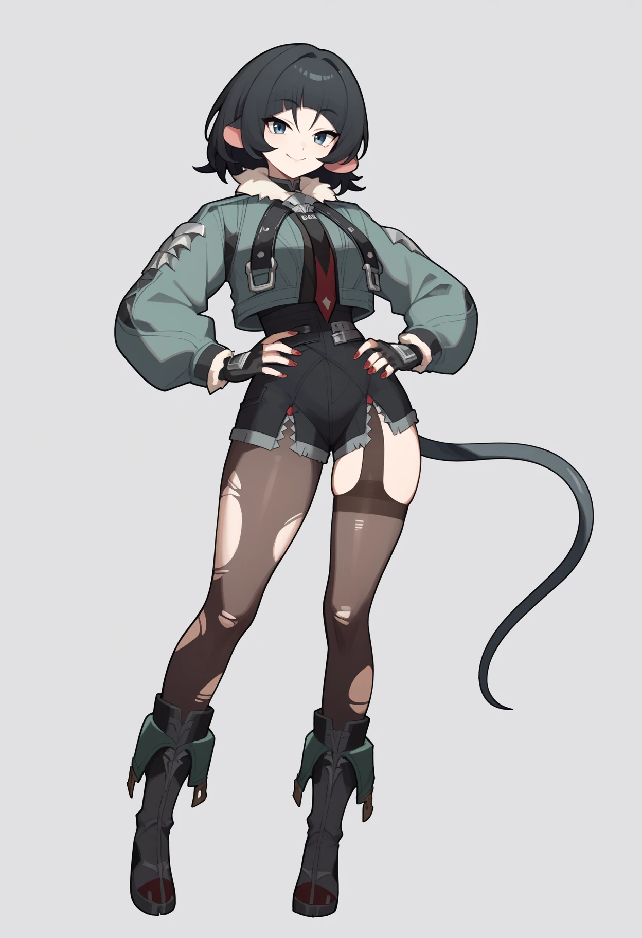 Default outfit prompts : fur-trimmed jacket, green jacket, long sleeves, red necktie, high-waist black shorts, belt, fingerless gloves, single leg pantyhose, torn pantyhose, torn thighhighs, grey boots