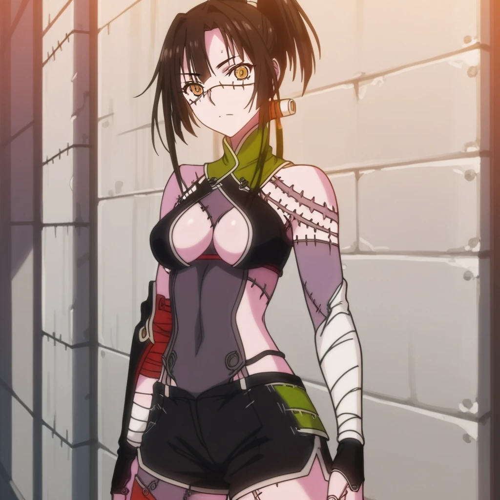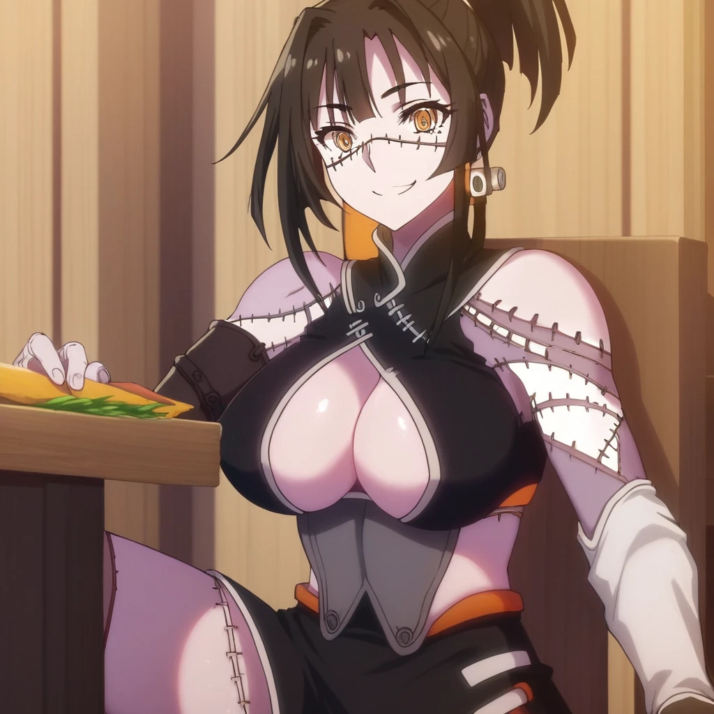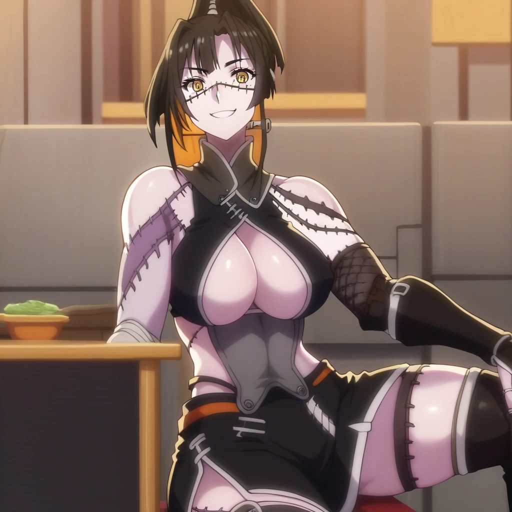 Used to make zombie girls inspired by kunai from monster musume. Prompt words 1girl, solo, zombie girl, kunai, patchwork skin, stitches, sharp teeth, zombie teeth, zombie, ponytail, open halter top, cleavage halter top, split skirt, forearm wraps, all based on kunai look.
