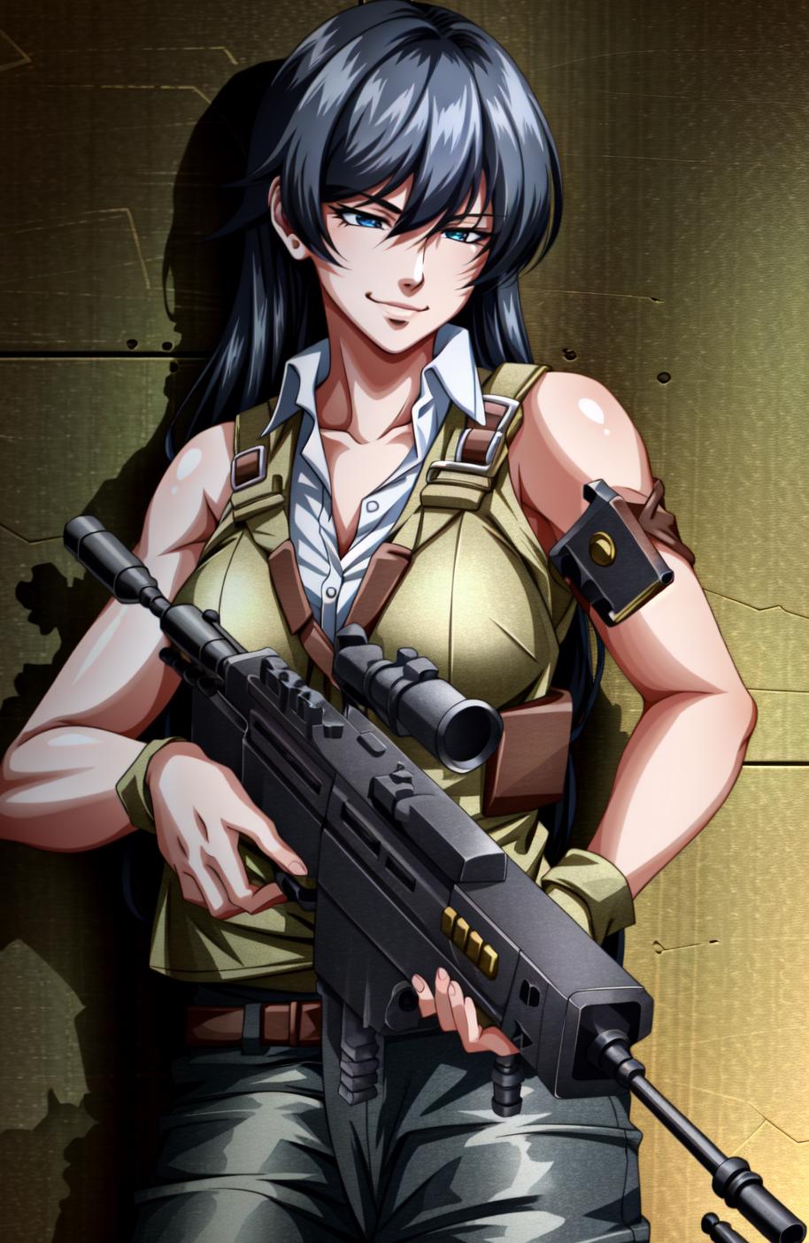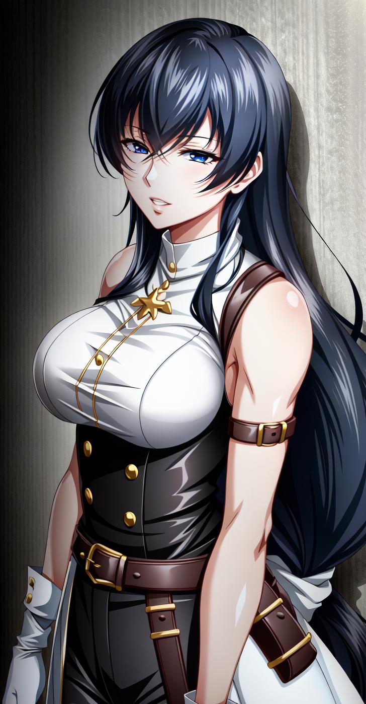 Roberta, long hair, gloves, black hair, large breasts, very long hair, belt, breasts, adjusting clothes, bare shoulders, blue eyes, low-tied long hair