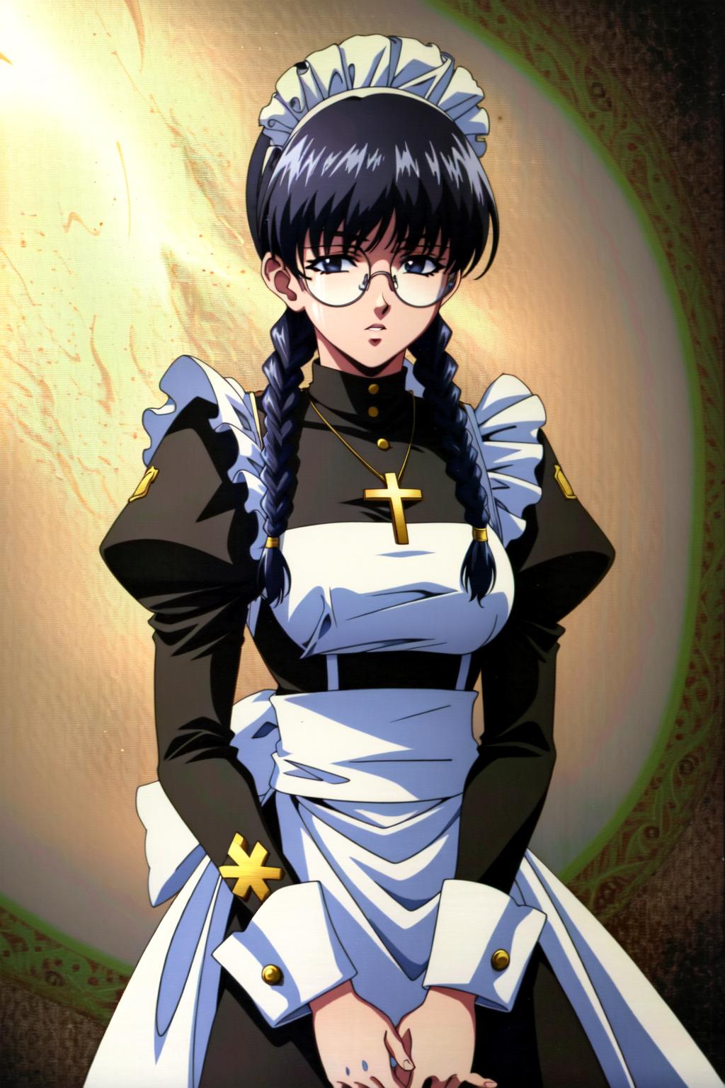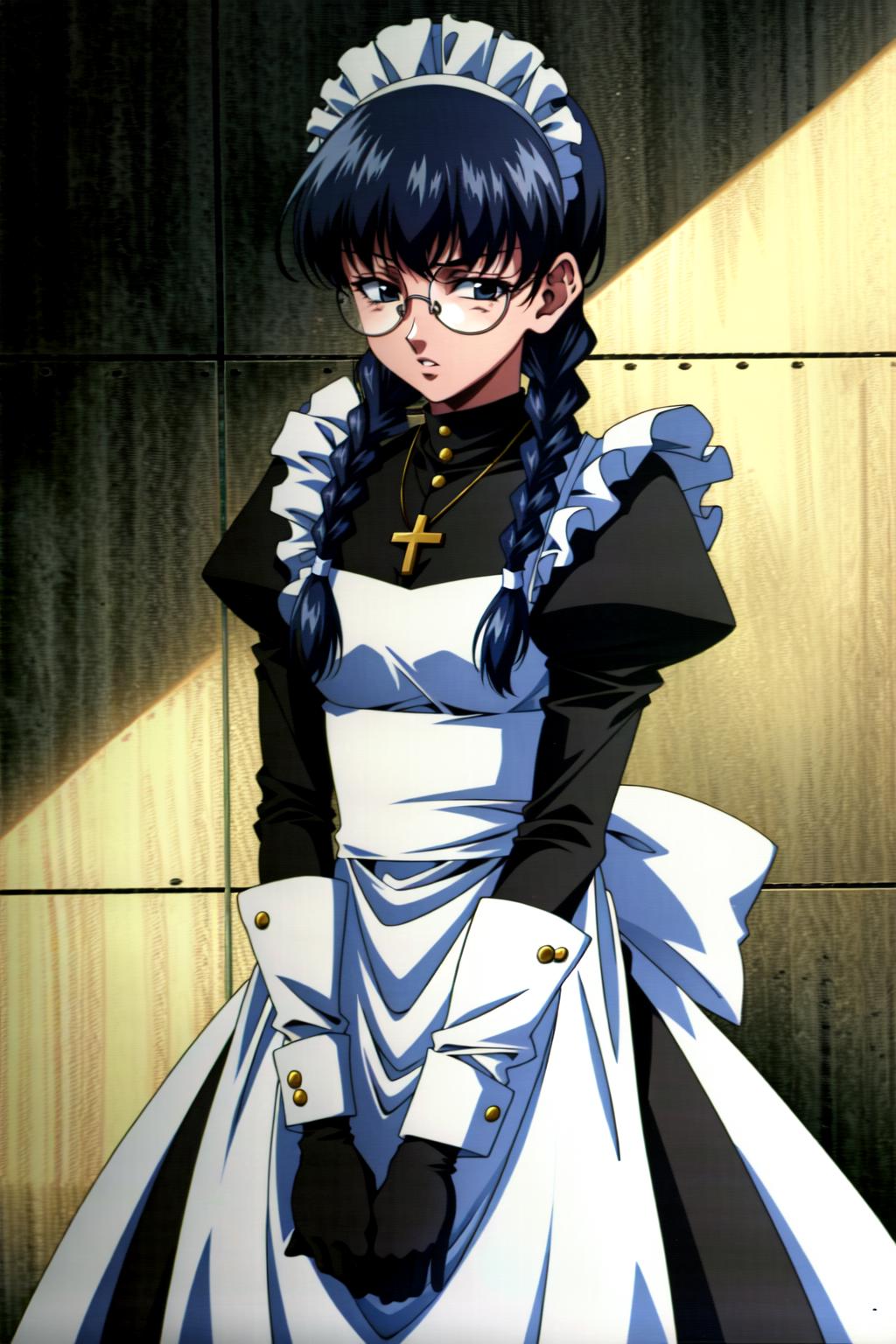 Roberta, braid, twin braids, glasses, jewelry, maid, opaque glasses, necklace, apron, cross, maid headdress, cross necklace, long hair, long sleeves, bangs, round eyewear, puffy sleeves, black hair