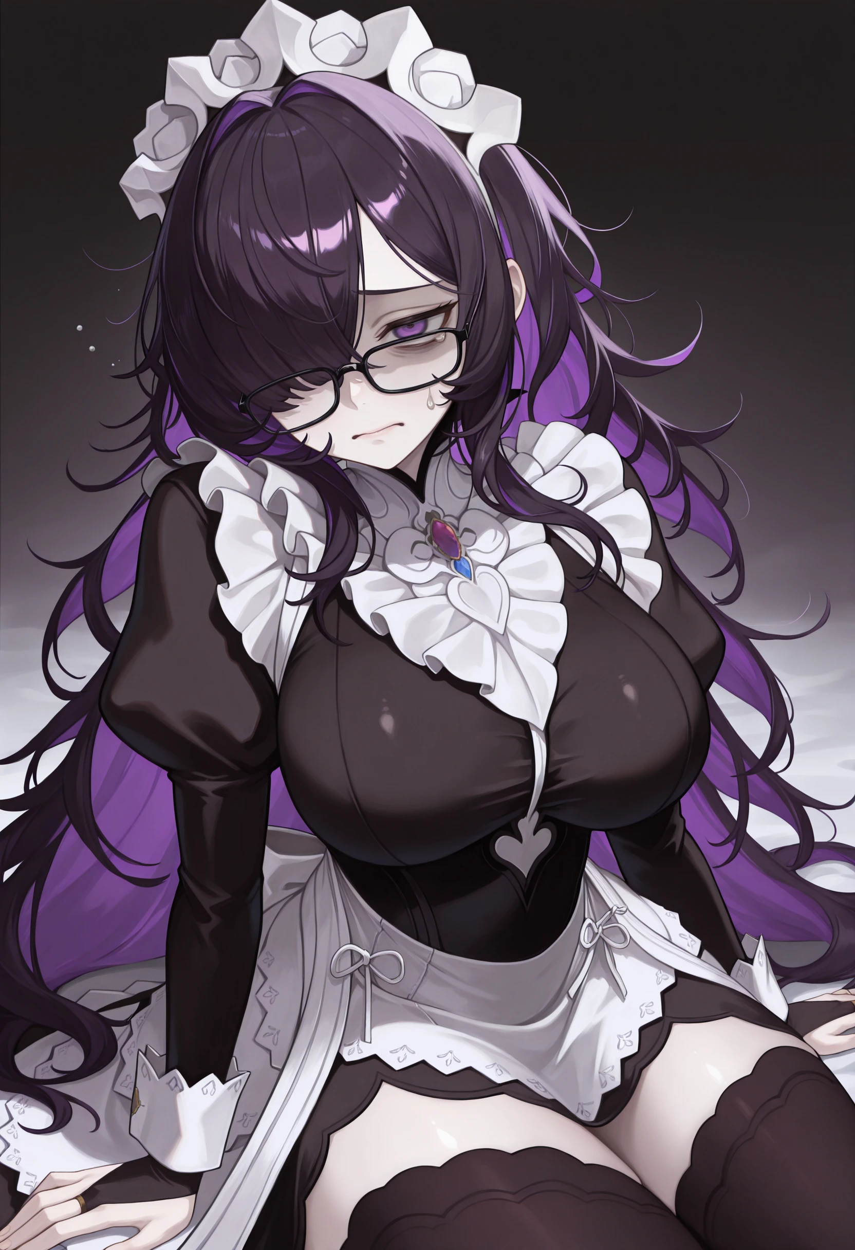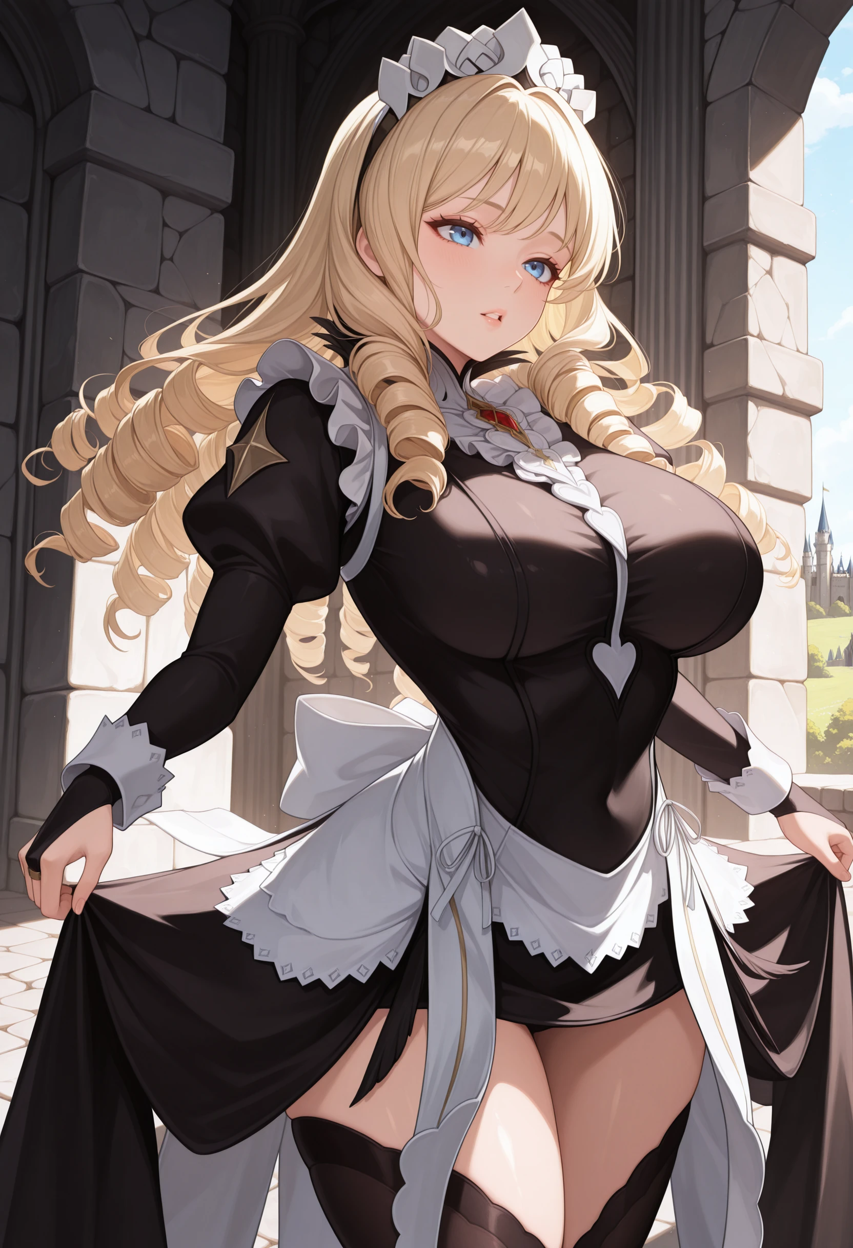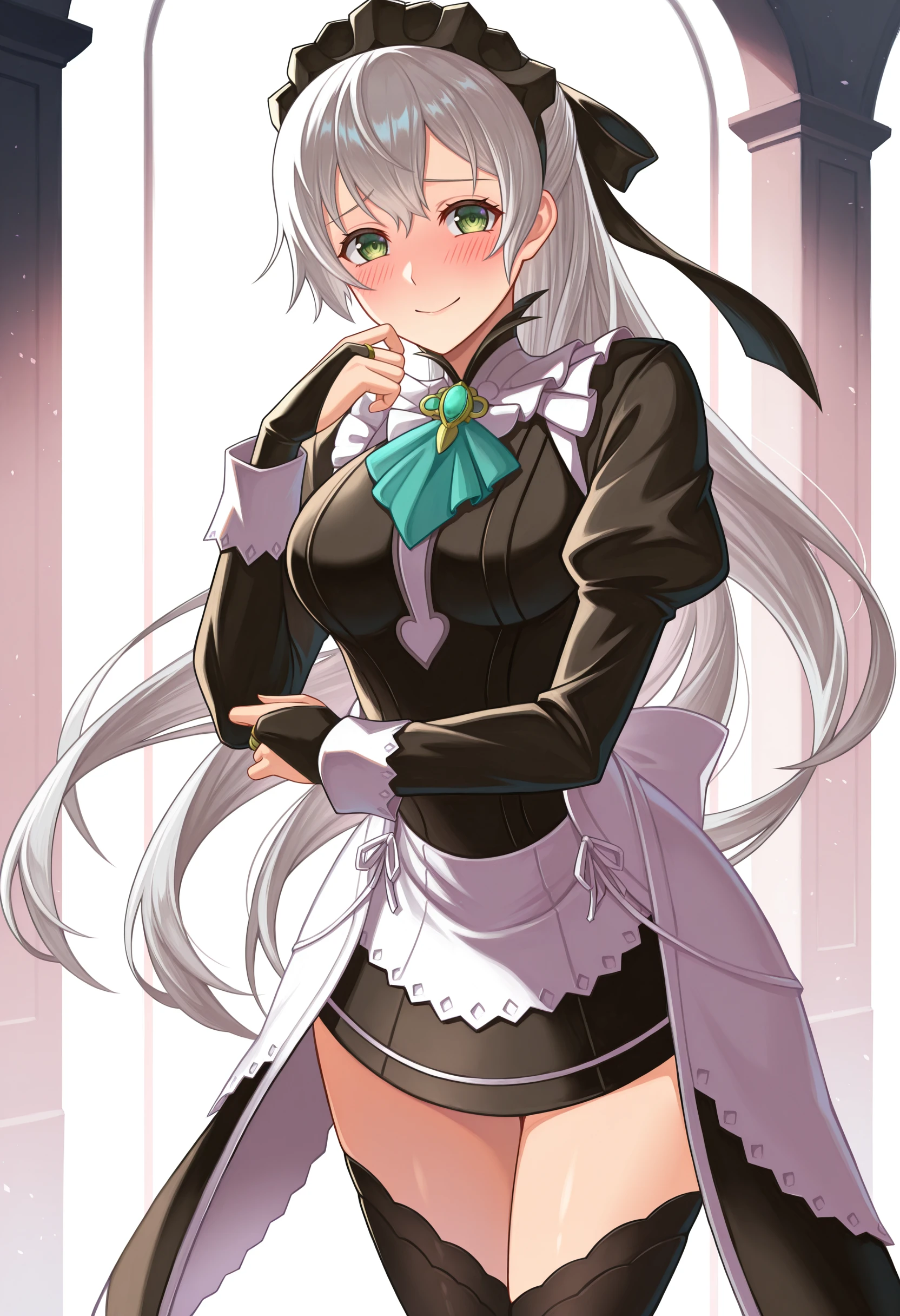 ftsmd, maid headdress, maid apron, black dress, bridal gauntlets, black thighhighs, long sleeves, juliet sleeves